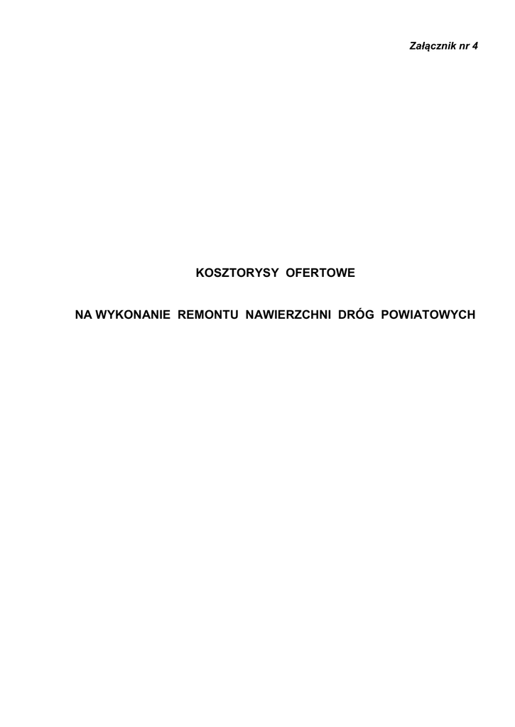 Załącznik nr 4 KOSZTORYSY OFERTOWE NA WYKONANIE REMONTU NAWIERZCHNI DRÓG POWIATOWYCH Kosztorys ofertowy Nr 1 ZADANIE I - wykonanie remontu nawierzchni drogi powiatowej Chlebowo – Karnkowo – Chodorążek – Wioska od km 0+003 do km 1+570 Numer ST Poz. cen. Asortyment i rodzaj robót 04.03.01 22 Skropienie oczyszczonej podbudowy emulsją asfaltową w ilości 0,6 kg/m2 . Lokalizacja robót: 0+450 – 0+950 = 500m x 5,5m= 2750 m2 0+950 – 1+570 = 620m x 5,0m =3100 m2 -----------------------------------------------------Razem: 5850 m2 04.08.01 Ilość jedn. m2 5850 m2 5850 m2 8363 Cena jedn. Wartość netto Wyrównanie nawierzchni masą mineralno-bitumiczną wg PN-S-96025 w ilości 75 kg/m2. 10 Lokalizacja robót j. w. 05.03.09 J.m. 21 Wykonanie pojedynczego powierzchniowego utrwalenia nawierzchni bitumicznej przy użyciu asfaltowej emulsji kationowej szybkorozpadowej 70% i grysów bazaltowych kl. I gat. 1 fr. 5/8 mm. Lokalizacja robót: 18+5,7 --------- x 8,6 = 102 m2 - rozjazd 2 0+011,6-0+950=938,4mx5,5m= 5161,2 m2 0+950- 1+570= 620m x 5,0m = 3100 m2 ---------------------------------------------------------Razem: 8363,2 m2 Przyjęto: 8363,0 m2 Razem: Podatek VAT 23% Ogółem: Podpisano ........................................................ (data) ..................................................... (upełnomocniony przedstawiciel) Kosztorys ofertowy Nr 2 ZADANIE II - wykonanie remontu nawierzchni drogi powiatowej Marianki – Małomin – Kamień Kmiecy – Tłuchowo od km 8+332 do km 9+332 Numer ST Poz. cen. Asortyment i rodzaj robót 04.03.01 22 Skropienie oczyszczonej podbudowy emulsją asfaltową w ilości 0,6 kg/m2 . Lokalizacja km 8+332–9+332= 1000m x 5,0m =5000 m2 04.08.01 05.03.09 Wyrównanie nawierzchni masą mineralno-bitumiczną wg PN-S-96025 w ilości 75 kg/m2. Lokalizacja robót j.w. Wykonanie pojedynczego powierzchniowego utrwalenia nawierzchni bitumicznej przy użyciu asfaltowej emulsji kationowej szybkorozpadowej 70% i grysów bazaltowych kl. I gat. 1 fr. 5/8 mm. Lokalizacja robót j.w. 10 21 J.m. Ilość jedn. m2 5000 m2 5000 m2 5000 Cena jedn. Wartość netto Razem: Podatek VAT 23% Ogółem: Podpisano ........................................................ (data) ..................................................... (upełnomocniony przedstawiciel) Kosztorys ofertowy Nr 3 ZADANIE III - wykonanie remontu nawierzchni drogi powiatowej Obory – Wildno – Lipno w m. Jastrzębie od km 16+563 do km 16+776 Numer ST Poz. cen. Asortyment i rodzaj robót 04.03.01 22 Skropienie oczyszczonej podbudowy emulsją asfaltową w ilości 0,6 kg/m2 . Lokalizacja km 16+563 – 16+776 = 213 m x 6,0m = 1278m2 Wyrównanie nawierzchni masą mineralno-bitumiczną wg PN-S-96025 w ilości 75 kg/m2. Lokalizacja robót km 16+563 – 16+776 = 213 m x 1,0 m = 213 m2 - na poszerzeniu km 16+563 – 16+776 = 213 m x 6,0m = 1278m2 Wykonanie pojedynczego powierzchniowego utrwalenia nawierzchni bitumicznej przy użyciu asfaltowej emulsji kationowej szybkorozpadowej 70% i grysów bazaltowych kl. I gat. 1 fr. 5/8 mm. Lokalizacja robót: km 16+563 – 16+776 = 213 m x 6,0m = 1278m2 04.08.01 05.03.09 10 21 J.m. Ilość jedn. m2 1278 m2 1491 m2 1278 Cena jedn. Wartość netto Razem: Podatek VAT 23% Ogółem: Podpisano ........................................................ (data) ..................................................... (upełnomocniony przedstawiciel) Kosztorys ofertowy Nr 4 ZADANIE IV - wykonanie remontu nawierzchni drogi powiatowej Lipno – Brzeźno – Gnojno od km 13+334 do km 14+334 Numer ST Asortyment i rodzaj robót Poz. cen. Naprawa korpusu drogi na przepuście pod drogą – podbudowa z betonu B15. Lokalizacja robót: km 13+617 – 13+662 Zakres robót: I w-wa – 20 m x 5,6 m = 112 m2 II w-wa – 35 m x 5,4 m = 189 m2 III w-wa – 45 m x 5,2 m = 234 m2 Warstwy grubości 20 cm każda. Skropienie oczyszczonej podbudowy emulsją asfaltową w ilości 0,6 kg/m2 . Lokalizacja km 13+334 – 14+334 = 1000 m x 5,0m = 5000 m2 04.06.01 04.03.01 22 04.08.01 10 05.03.09 21 Wyrównanie nawierzchni masą mineralno-bitumiczną wg PN-S-96025 w ilości 75 kg/m2. lokalizacja robót j.w. Wykonanie pojedynczego powierzchniowego utrwalenia nawierzchni bitumicznej przy użyciu asfaltowej emulsji kationowej szybkorozpadowej 70% i grysów bazaltowych kl. I gat. 1 fr. 5/8 mm. Lokalizacja j.w. J.m. Ilość jedn. m2 535 m2 5000 m2 5000 m2 5000 Cena jedn. Wartość netto Razem: Podatek VAT 23% Ogółem: Podpisano ........................................................ (data) ..................................................... (upełnomocniony przedstawiciel)