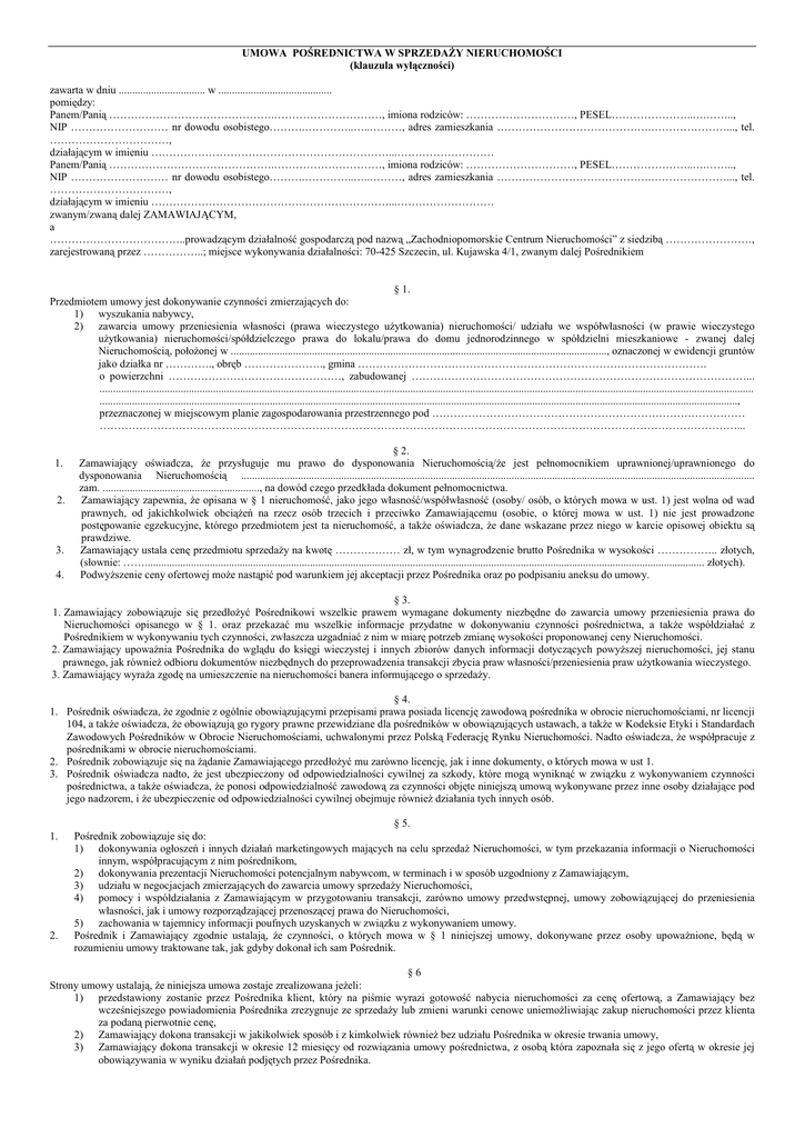 UMOWA POŚREDNICTWA W SPRZEDAśY NIERUCHOMOŚCI (klauzula wyłączności) zawarta w dniu ................................ w .......................................... pomiędzy: Panem/Panią ……………………………………….…………………………, imiona rodziców: …………………………, PESEL…………………..….…….., NIP ……………………… nr dowodu osobistego……….…………..…..………, adres zamieszkania …………………………………….…………………..., tel. ……………………………, działającym w imieniu …………………………………………………………...……………………… Panem/Panią ……………………………………….…………………………, imiona rodziców: …………………………, PESEL…………………..….…….., NIP ……………………… nr dowodu osobistego……….…………..…..………, adres zamieszkania …………………………………….…………………..., tel. ……………………………, działającym w imieniu …………………………………………………………...……………………… zwanym/zwaną dalej ZAMAWIAJĄCYM, a ………………………………..prowadzącym działalność gospodarczą pod nazwą „Zachodniopomorskie Centrum Nieruchomości” z siedzibą ……………………, zarejestrowaną przez ……………..; miejsce wykonywania działalności: 70-425 Szczecin, ul. Kujawska 4/1, zwanym dalej Pośrednikiem § 1. Przedmiotem umowy jest dokonywanie czynności zmierzających do: 1) wyszukania nabywcy, 2) zawarcia umowy przeniesienia własności (prawa wieczystego uŜytkowania) nieruchomości/ udziału we współwłasności (w prawie wieczystego uŜytkowania) nieruchomości/spółdzielczego prawa do lokalu/prawa do domu jednorodzinnego w spółdzielni mieszkaniowe - zwanej dalej Nieruchomością, połoŜonej w ..........................................................................................................................................., oznaczonej w ewidencji gruntów jako działka nr …………., obręb …………………., gmina ……………………………………………………………………………………. o powierzchni …………………………………………, zabudowanej …………………………………………………………………………………... .................................................................................................................................................................................................................................................. ............................................................................................................................................................................................................................................, przeznaczonej w miejscowym planie zagospodarowania przestrzennego pod …………………………………………………………………………… ……………………………………………………………………………………………………………………………………………………………... 1. 2. 3. 4. § 2. Zamawiający oświadcza, Ŝe przysługuje mu prawo do dysponowania Nieruchomością/Ŝe jest pełnomocnikiem uprawnionej/uprawnionego do dysponowania Nieruchomością .............................................................................................................................................................................................. zam. .........................................................., na dowód czego przedkłada dokument pełnomocnictwa. Zamawiający zapewnia, Ŝe opisana w § 1 nieruchomość, jako jego własność/współwłasność (osoby/ osób, o których mowa w ust. 1) jest wolna od wad prawnych, od jakichkolwiek obciąŜeń na rzecz osób trzecich i przeciwko Zamawiającemu (osobie, o której mowa w ust. 1) nie jest prowadzone postępowanie egzekucyjne, którego przedmiotem jest ta nieruchomość, a takŜe oświadcza, Ŝe dane wskazane przez niego w karcie opisowej obiektu są prawdziwe. Zamawiający ustala cenę przedmiotu sprzedaŜy na kwotę ……………… zł, w tym wynagrodzenie brutto Pośrednika w wysokości …………….. złotych, (słownie: ……............................................................................................................................................................................................................... złotych). PodwyŜszenie ceny ofertowej moŜe nastąpić pod warunkiem jej akceptacji przez Pośrednika oraz po podpisaniu aneksu do umowy. § 3. 1. Zamawiający zobowiązuje się przedłoŜyć Pośrednikowi wszelkie prawem wymagane dokumenty niezbędne do zawarcia umowy przeniesienia prawa do Nieruchomości opisanego w § 1. oraz przekazać mu wszelkie informacje przydatne w dokonywaniu czynności pośrednictwa, a takŜe współdziałać z Pośrednikiem w wykonywaniu tych czynności, zwłaszcza uzgadniać z nim w miarę potrzeb zmianę wysokości proponowanej ceny Nieruchomości. 2. Zamawiający upowaŜnia Pośrednika do wglądu do księgi wieczystej i innych zbiorów danych informacji dotyczących powyŜszej nieruchomości, jej stanu prawnego, jak równieŜ odbioru dokumentów niezbędnych do przeprowadzenia transakcji zbycia praw własności/przeniesienia praw uŜytkowania wieczystego. 3. Zamawiający wyraŜa zgodę na umieszczenie na nieruchomości banera informującego o sprzedaŜy. § 4. 1. Pośrednik oświadcza, Ŝe zgodnie z ogólnie obowiązującymi przepisami prawa posiada licencję zawodową pośrednika w obrocie nieruchomościami, nr licencji 104, a takŜe oświadcza, Ŝe obowiązują go rygory prawne przewidziane dla pośredników w obowiązujących ustawach, a takŜe w Kodeksie Etyki i Standardach 
