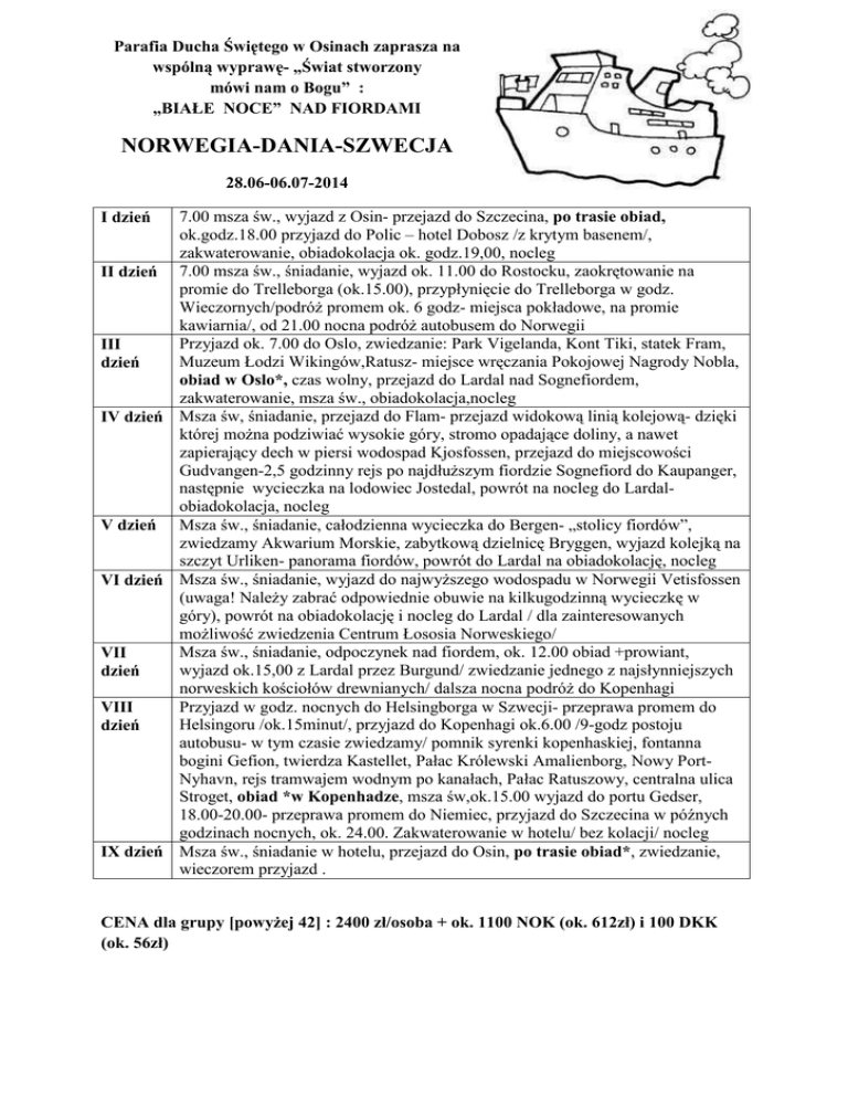 Parafia Ducha Świętego w Osinach zaprasza na wspólną wyprawę- „Świat stworzony mówi nam o Bogu” : „BIAŁE NOCE” NAD FIORDAMI NORWEGIA-DANIA-SZWECJA 28.06-06.07-2014 7.00 msza św., wyjazd z Osin- przejazd do Szczecina, po trasie obiad, ok.godz.18.00 przyjazd do Polic – hotel Dobosz /z krytym basenem/, zakwaterowanie, obiadokolacja ok. godz.19,00, nocleg II dzień 7.00 msza św., śniadanie, wyjazd ok. 11.00 do Rostocku, zaokrętowanie na promie do Trelleborga (ok.15.00), przypłynięcie do Trelleborga w godz. Wieczornych/podróŜ promem ok. 6 godz- miejsca pokładowe, na promie kawiarnia/, od 21.00 nocna podróŜ autobusem do Norwegii Przyjazd ok. 7.00 do Oslo, zwiedzanie: Park Vigelanda, Kont Tiki, statek Fram, III Muzeum Łodzi Wikingów,Ratusz- miejsce wręczania Pokojowej Nagrody Nobla, dzień obiad w Oslo*, czas wolny, przejazd do Lardal nad Sognefiordem, zakwaterowanie, msza św., obiadokolacja,nocleg IV dzień Msza św, śniadanie, przejazd do Flam- przejazd widokową linią kolejową- dzięki której moŜna podziwiać wysokie góry, stromo opadające doliny, a nawet zapierający dech w piersi wodospad Kjosfossen, przejazd do miejscowości Gudvangen-2,5 godzinny rejs po najdłuŜszym fiordzie Sognefiord do Kaupanger, następnie wycieczka na lodowiec Jostedal, powrót na nocleg do Lardalobiadokolacja, nocleg V dzień Msza św., śniadanie, całodzienna wycieczka do Bergen- „stolicy fiordów”, zwiedzamy Akwarium Morskie, zabytkową dzielnicę Bryggen, wyjazd kolejką na szczyt Urliken- panorama fiordów, powrót do Lardal na obiadokolację, nocleg VI dzień Msza św., śniadanie, wyjazd do najwyŜszego wodospadu w Norwegii Vetisfossen (uwaga! NaleŜy zabrać odpowiednie obuwie na kilkugodzinną wycieczkę w góry), powrót na obiadokolację i nocleg do Lardal / dla zainteresowanych moŜliwość zwiedzenia Centrum Łososia Norweskiego/ Msza św., śniadanie, odpoczynek nad fiordem, ok. 12.00 obiad +prowiant, VII wyjazd ok.15,00 z Lardal przez Burgund/ zwiedzanie jednego z najsłynniejszych dzień norweskich kościołów drewnianych/ dalsza nocna podróŜ do Kopenhagi Przyjazd w godz. nocnych do Helsingborga w Szwecji- przeprawa promem do VIII Helsingoru /ok.15minut/, przyjazd do Kopenhagi ok.6.00 /9-godz postoju dzień autobusu- w tym czasie zwiedzamy/ pomnik syrenki kopenhaskiej, fontanna bogini Gefion, twierdza Kastellet, Pałac Królewski Amalienborg, Nowy PortNyhavn, rejs tramwajem wodnym po kanałach, Pałac Ratuszowy, centralna ulica Stroget, obiad *w Kopenhadze, msza św,ok.15.00 wyjazd do portu Gedser, 18.00-20.00- przeprawa promem do Niemiec, przyjazd do Szczecina w późnych godzinach nocnych, ok. 24.00. Zakwaterowanie w hotelu/ bez kolacji/ nocleg IX dzień Msza św., śniadanie w hotelu, przejazd do Osin, po trasie obiad*, zwiedzanie, wieczorem przyjazd . I dzień CENA dla grupy [powyŜej 42] : 2400 zł/osoba + ok. 1100 NOK (ok. 612zł) i 100 DKK (ok. 56zł) Cena obejmuje : • Autokar LUX na całą trasę • Prom z Niemiec do Szwecji- miejsca pokładowe • Prom ze Szwecji do Danii /Hesingborg-Helsingor/, Gedser-Roztock • 6 noclegów na trasie : 4 w motelu w Norwegii- pokoje 2 osobowe z łazienkami, 2 w hotelu 2* w Szczecinie- pokoje- 2 osobowe z łazienkami • 7 śniadań- w tym jedno w formie prowiantu, oraz 4 w Norwegii/bufet i 2 w Polsce • 5 obiadokolacji- 4 w Norwegii/porcjowane, 1 w Polsce • 1 obiad w Norwegii • Pilota na całą trasę • KaŜdy dzień msza św. • Ubezpieczenie NNW CENA NIE OBEJMUJE : Biletów wstępu do zwiedzanych obiektów turystycznych oraz innych atrakcji wg programu- na cel naleŜy posiadać ok. 1100 NOK i 100 DKK UWAGA! Prosimy zabrać prowiant na trasę do Norwegi- przewidujemy dodatkowy postój w ok. Szczecina w supermarkecie spoŜywczym Zabrać buty powyŜej kostek Przewidywane temperatury ok. 20-25 st.C Po trasie w Norwegii postój co ok. 200 km- wc W autobusie u kierowcy moŜliwość zakupu napojów i kawy ZAPISY W ZAKRYSTII DO KOŃCA STYCZNIA Dodatkowe informacje będzie moŜna uzyskać na spotkaniu organizacyjnym, termin zostanie podany później. ZAPRASZAMY ☺ organizatorzy : Zyta CzyŜ i ks. Proboszcz Grzegorz Gwóźdź