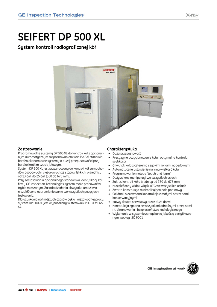SEIFERT DP 500 XL System kontroli radiograficznej kół Zastosowanie Programowalne systemy DP 500 XL do kontroli kół z opcjonalnym automatycznym rozpoznawaniem wad (SABA) stanowią bardzo ekonomiczne systemy o dużej przepustowości przy bardzo krótkim czasie jałowym. System DP 500 XL jest przeznaczony do kontroli kół samochodów osobowych i ciężarowych ze stopów lekkich, o średnicy od 13 cali do 25 cali (360 do 675 mm). Przy zastosowaniu opcjonalnego stanowiska identyfikacji kół firmy GE Inspection Technologies system może pracować w trybie mieszanym. Zasada działania chwytaka umożliwia niezakłócone napromieniowanie we wszystkich pozycjach testowania. Dla uzyskania najkrótszych czasów cyklu i niezawodnej pracy, system DP 500 XL jest wyposażony w sterownik PLC SIEMENS S7. Charakterystyka • Duża przepustowość • Precyzyjne pozycjonowanie koła i optymalna kontrola szybkości • Chwytak koła z czterema szybkimi rolkami napędowymi • Automatyczne ustawienie na inną wielkość koła • Programowanie metodą "teach and learn" • Duży zakres manipulacji we wszystkich osiach • Zakres kontroli kół o średnicy od 360 do 675 mm • Niezakłócony widok wiązki RTG we wszystkich osiach • Zwarta konstrukcja minimalizująca pole podstawy • Solidna i niezawodna konstrukcja z małymi potrzebami konserwacyjnymi • Łatwy dostęp serwisowy przez duże drzwi • Konstrukcja zgodna ze wszystkimi odnośnymi przepisami nt. ekranowania i bezpieczeństwa radiologicznego • Wykonanie w systemie zarządzania jakością certyfikowanym według ISO 9001 Opis Szafa zabezpieczenia przed promieniowaniem DP 500 XL jest samodzielnym, ekranowanym systemem rentgenowskim, spełniającym aktualne wymagania międzynarodowych norm bezpieczeństwa radiacyjnego łącznie z niemieckimi przepisami ochrony radiologicznej (RöV) w aktualnej wersji oraz CFR 1020.40 (USA). Obwody bezpieczeństwa zawarte w systemie są zgodne z EN 954-1, klasa bezpieczeństwa 4. Szafa DP 500 XL jest zaplanowana do pracy z przemysłowym urządzeniem rentgenowskim ISOVOLT 160 HS. Łatwy dostęp serwisowy jest możliwy przez drzwi, w pełni blokowane odpornymi na uszkodzenia wyłącznikami bezpieczeństwa zgodnymi z VDE0113 (EN 60204). Drzwi obsługowe szafy są blokowane dla uniemożliwienia nieuprawnionego dostępu, ale mogą być w każdej chwili otwarte od wewnątrz za pomocą ręcznego awaryjnego zwalniacza blokady. Szybki transporter rolkowy przenosi koła do szafy kontrolnej poprzez szybko otwierane drzwi załadunkowe, co minimalizuje czas między operacjami kontroli. Manipulator kół Po wejściu do szafy, koło jest przesuwane podajnikiem łańcuchowym do chwytaka, gdzie jest poruszane w wiązce RTG przez ruchy w osiach TX i obrót RV. Obracanie koła za pomocą skośnych rolek zapewnia precyzyjny ruch bez tarcia i dokładne pozycjonowanie. Napęd we wszystkich osiach jest realizowany przez serwomotor prądu zmiennego (AC). Manipulator RTG Manipulator ramienia C wbudowany w DP 500 XL ma zamocowaną w jego skrajnych położeniach lampę RTG i wzmacniacz obrazu, z ruchem w osi RZ umożliwiającym kontrolę pod różnymi kątami. Źródło promieniowania RTG Aparatem RTG wbudowanym w system DP 500 XL jest ISOVOLT HS, o następującej charakterystyce: • częstotliwość robocza 40 kHz • automatyczne nagrzewanie lampy RTG • sterowanie mikroprocesorowe • wbudowane obwody bezpieczeństwa • lampa RTG ISOVOLT 160 M2 / 0.4-0.4 mm z podwójną plamką ogniskową po 1,00 mm wg EN 12543 (0,4 mm wg IEC336); prąd lampy 16 mA przy napięciu 40 kV pozwala osiągnąć najlepszy kontrast, zwłaszcza przy kontroli materiałów o "małej gęstości". System obrazowania DP 500 XL posiada system obrazowania VISTALUX 13S4, który zawiera najnowocześniejszy, oparty na technologii metalowo-ceramicznej wzmacniacz obrazu 33 cm, przełączalny na dwa mniejsze pola widzenia dla wbudowanego powiększenia. Poprzez precyzyjny układ soczewek, ze wzmacniaczem obrazu sprzężona jest kamera CCD o szerokim zakresie dynamicznym. Obraz jest wyświetlany na 17-calowym, czarno-białym monitorze o wysokiej rozdzielczości, co daje doskonałą zdolność obrazowania. Sterowanie • Sterowanie na bazie sterownika PLC S7 umożliwia łatwe programowanie metodą "teach and learn" poprzez przemysłowy komputer PC z kolorowym wyświetlaczem TFT do krytycznych parametrów maszyny oraz prostą obsługę przez kliknięcie myszą. • Wewnętrzne urządzenia kodujące dla napędzanych osi (oś RV = koder przyrostowy) • Liczba programów / kroków programowych zapamiętanych na twardym dysku przemysłowego komputera PC jest prawie nieograniczona. Opcje • • • • • • Kolimator Ogranicznik wiązki Ruter ISDN do diagnostyki Filtr wiązki RTG Przenośnik rolkowy Funkcja sortowania kół na "Dobre" / "Odrzut" / "Przeróbka" • Stanowisko rozpoznawania koła • System automatycznej oceny obrazu (SABA) • Funkcje specyficzne dla klienta – na życzenie Dane techniczne (1) Szafa zabezpieczenia przed promieniowaniem Wysokość Szerokość (bez śluz) Szerokość (ze śluzą wlotową i wylotową) Głębokość Waga całkowita 2215 mm 2740 mm 4740 mm 2260 mm około 7500 kg Manipulator Max. waga koła Min. średnica koła Max. średnica koła Min. szerokość koła Max. szerokość koła Czas cyklu między kontrolami Ruchy Ruch poziomy w kierunku transportu Obrót koła Przechył ramienia C 35 kg 13 cali (360 mm) 25 cali (675 mm) 100 mm max. 350 mm (wraz z nadlewem) <5s Oś Przesuw TX RU RZ 1565 mm n x 360° 0...45° Prędkość 0...125.0 m/min 0...300 °/s * 0... 98 °/s *) W zależności od średnicy koła - tu dla koła o średnicy 13". Szafka sterownicza Szerokość Głębokość Wysokość 1000 mm 600 mm 2100 mm Sterowanie Programowalne parametry dla każdego kroku kontroli: - prędkość - obrót - napięcie lampy (kV) - prąd lampy (mA) - czas cyklu - ZOOM wzmacniacza obrazu - automatyczna migawka - średnica koła - położenie p