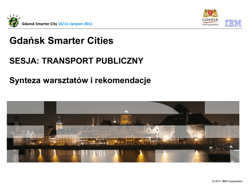 Gdansk Smarter City 10/11 sierpien 2011 Gdańsk Smarter Cities SESJA: TRANSPORT PUBLICZNY Synteza warsztatów i rekomendacje © 2011 IBM Corporation Gdansk Smarter City 10/11 sierpien 2011 Sesja Deep Dive Tematyka: Transport publiczny 10 Sierpnia (popołudnie) Transport Publiczy w Gdańsku Zrozumienie Przegląd Strategii Biznesowej do 2014: Wizja i wyzwania Mingle Exercise: Open Question to Participants: What quick wins can accelerate Gdansk’s Vision? Podejście IBM do inteligentniejszego transportu Pobudzenie wyobraźni poprzez zaprezentowanie wybranych przypadków ze swiata Przerwa Discussion Leader Godz. Viceprezydent M. Lisicki 13:00-13:30 (30 min) Jason Wild 13:30-14:30 (60 min) David Pickeral 14:30-15:15 (45 min) Dyskusja Deep Dive Technologie inteligentniejszego transportu Grupy dyskusyjne 15:30-16:30 (60 min) Richard Weinstock 16:30-17:15 (45 min) Grupy dyskusyjne 17:15-18:15 (60 min) David Pickeral 18:15-18:30 (15 min) Grupy dyskusyjne 9:00-10:00 (60 min) Jason Wild 10:00-10:45 (45 min) Technologie rozwijające się - perspektywa 1-5lat Praca w grupach: Kluczowe obszary zainteresowania uczestników – pogębiona analiza Podsumowanie dyskusji: Możlwości transforamcyjne – punkt wyjścia 2 dnia konferencji Zrozumeinie planów rozwoju transportu publicznego w Gdańsku 15 min Burza Mózgów: Wyzwania, problemy, przeszkody, czego życzyliby sobie mieszkańcy miasta Rezultaty Pogłębiona dyskusja nt.silnych stron w transporcie Gdańskim i obszarach wymagających szczególnej uwagi. Przegląd nowoczesnych technologii stosowanyh w inteligentnym transporcie 11 Sierpnia (przed południem) Szanse transformacyjne Identyfikacja kluczów tematów- dyskusja grupowa Mapowanie drogi Priorytety w inicjatywach i kolejne działania Podsumowanie 2 07.09.2011 Podsumowanie, uwagi końcowe, podziękowania Viceprezydent M. Lisicki 10:45 – 11:00 (15 min) Rezultat: przegląd i uszeregowanie działań. © 2011 IBM Corporation Gdansk Smarter City 10/11 sierpien 2011 Sesja: Transport publiczny – lista uczestników 1/2 3 Lp. Nazwisko Imię Stanowisko Instytucja/Firma 1 Budnik Roland Dyrektor Powiatowy Urząd Pracy w Gdańsku 2 Derebecki Damian Rada Klastra ICT Robonet, Pomorski Klaster ICT 3 Duch Andrzej Dyrektor Wydziału Urbanistyki, Architektury i Ochrony Zabytków Urząd Miejski w Gdańsku 4 Ejsmont Rafał Project Manager Pomorskie Stowarzyszenie Wspólna Europa 5 Górska Anna Prezes Zarządu Gdańska Organizacja Turystyczna 6 Górski dr kpt. ż.w. Prorektor ds. Morskich Akademia Morska w Gdyni 7 Grzybek Zbigniew Wiceprezes Zarządu SEVENET S.A. 8 Jasnoch Małgorzata Prezes Zarządu Gdańska Fundacja Przedsiębiorczości 9 Kerski Basil Dyrektor Europejskiego Centrum Solidarności 10 Kisielewski Józef Prezes Zarządu Gdański Klaster Budowlany 11 Kozłowski Dr Artur Dziekan Wydziału Ekonomii i Zarządzania Wyższej Szkoły Bankowej 12 Krawczyk Prof. dr hab. inż. Henryk Rektor Politechniki Gdańskiej 13 Kreft Wojciech Dyrektor Biura Zarządu Pomorska Regionalna Organizacja Turystyczna 14 Kubacki Jarosław Dyrektor Biura Informatyki Urząd Miejski w Gdańsku 15 Kuś Izabela Z-ca Dyrektora Wydziału Programów Rozwojowych Urząd Miejski w Gdańsku 16 Lorek Maciej Dyrektor Wydziału Środowiska Urząd Miejski w Gdańsku 17 Mielcarek Marek Biuro Marketingu Produktowego ENERGA Obrót S.A. 07.09.2011 © 2011 IBM Corporation Gdansk Smarter City 10/11 sierpien 2011 Sesja: Transport publiczny – lista uczestników 1/2 4 Lp. Nazwisko Imię Stanowisko Instytucja/Firma 18 Mikołajczyk Sebastian Sales Director SPRINT S.A. 19 Mikos Ewa Dyrektor ds. Rozwoju Biznesu Siemens Sp. z o.o. 20 Postawka Grzegorz Dyrektor Biura Regionalnego Siemens Sp. z o.o. w Gdańsku 21 Rutkiewicz Grzegorz Project Management Director Fido Intelligence Sp. z o.o. 22 Sikorski Adam Customer Support Manager Thomson Reuters 23 Strzyżewicz Ryszard Prezes Zarządu Zarząd Morskiego Portu Gdańsk S.A. Instytut Badań nad Gospodarką Rynkową 24 Szultka Stanisław Dyrektor Zarządzający Obszaru Badawczego Przedsiębiorstwa i Innowacje 25 Wenzel Boris Prezes, Dyrektor Generalny DCT Gdańsk SA 26 Więckiewicz Katarzyna Specjalista ds. projektów innowacyjnych Gdański Park Naukowo - Technologiczny 27 Wiśniewski Maciej Dyrektor Wydziału Projektów Unijnych SPRINT S.A. 28 Zielińska Grażyna Dyrektor Generalny Regionalna Izba Gospodarcza Pomorza 29 Zimakowski Dominik Kierownik Marketingu DATERA S.A. 30 Żukowski Marcin Dyrektor Gdański Park Naukowo - Technologiczny 07.09.2011 © 2011 IBM Corporation Gdansk Smarter City 10/11 sierpien 2011 TU ZDJĘCIA Z SESJI TRANSPORTOWEJ !!!!!!! 5 07.09.2011 © 2011 IBM Corporation Gdansk Smarter City 10/11 sierpien 2011 Wyniki prac zespołowych © 2011 IBM Corporation Gdansk Smarter City 10/11 sierpien 2011 WYZWANIA PRZED, JAKIMI STOI MIASTO W ZAKRESIE TRANSPORTU (co jest potrzebne/czego nie ma/co przeszkadza) suburbanizacja jako postępujący proces mentalność (przyzwyczajenia mieszkańców) brak dobrej komunikacji publicznej na obszarach peryferyjnych (rozbudowa komunikacji metropolitarnej) słaby przepływ informacji (konieczność zbudowania mapy odpowiedzialności i kompetencji) determinacja w działaniu utrzymanie jakości usług na zaplanowanym, wysokim/wzorcowym poziomie zróżnicowany potencjał finansowy, polityczny, społeczny, gospodarczy poszczególnych JST brak narzędzi do efektywnego przetransportowania wszystkich informacji w jedno miejsce konieczność uspokojenia ruchu (wprowadzenie limitów prędkości) 7 07.09.2011 © 2011 IBM Corporation Gdansk Smarter City 10/11 sierpien 2011 CZEGO ŻYCZYLIBY SOBIE MIESZKAŃCY MIASTA elektroniczny bilet dla każdego połączenia multi modalne rozbudowa sieci transportu rowerowego centrum informacji transportowej – gdzie jak dojechać najszybciej wykorzystywanie smart phonów / inteligentne aplikacje mobilne bezpłatne parkingi dla samochodów zasilanych elektrycznie Gdańsk – w 10 najlepiej rozwiniętych miast Polski. Park & Ride – nowe l