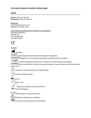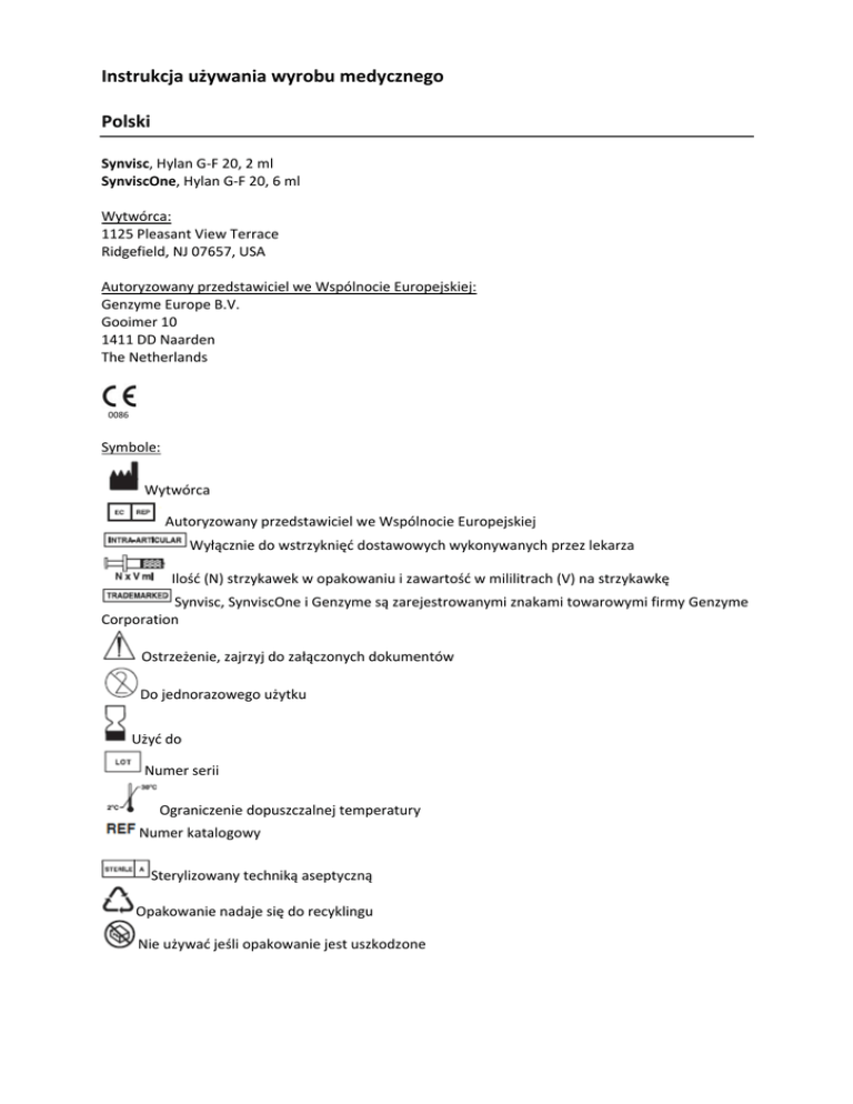 Instrukcja używania wyrobu medycznego Polski Synvisc, Hylan G‐F 20, 2 ml SynviscOne, Hylan G‐F 20, 6 ml Wytwórca: 1125 Pleasant View Terrace Ridgefield, NJ 07657, USA Autoryzowany przedstawiciel we Wspólnocie Europejskiej: Genzyme Europe B.V. Gooimer 10 1411 DD Naarden The Netherlands 0086 Symbole: Wytwórca Autoryzowany przedstawiciel we Wspólnocie Europejskiej Wyłącznie do wstrzyknięć dostawowych wykonywanych przez lekarza Ilość (N) strzykawek w opakowaniu i zawartość w mililitrach (V) na strzykawkę Synvisc, SynviscOne i Genzyme są zarejestrowanymi znakami towarowymi firmy Genzyme Corporation Ostrzeżenie, zajrzyj do załączonych dokumentów Do jednorazowego użytku Użyć do Numer serii Ograniczenie dopuszczalnej temperatury Numer katalogowy Sterylizowany techniką aseptyczną Opakowanie nadaje się do recyklingu Nie używać jeśli opakowanie jest uszkodzone OPIS Hylan G‐F 20 jest dostępny jako: Synvisc, o pojemności 2 ml SynviscOne, o pojemności 6 ml. Hylan G‐F 20 jest sterylną, apirogenną, elastyczno‐lepką cieczą zawierającą hylany. Hylany to pochodne hialuronianu (soli sodowej kwasu hialuronowego), które zawierają powtarzające się jednostki dwusacharydowe N‐acetylo‐glukozoaminy i glukuronianu sodu. Hylan A ma średnią masę cząsteczkową ok. 6 000 000 Daltonów, a hylan B ma postać uwodnionego żelu. Hylan G‐F 20 zawiera hylan A oraz hylan B (8,0 mg ± 2,0 mg/ml) w buforowanym, fizjologicznym roztworze chlorku sodu ( pH 7,2 ± 0,3). WŁAŚCIWOŚCI Pod względem biologicznym hylan G‐F 20 wykazuje podobieństwo do hialuronianu. Hialuronian jest składnikiem płynu maziówkowego nadającym mu wiskoelastyczność. Właściwości mechaniczne (wiskoelastyczne) hylanu G‐F 20 są lepsze od tych, jakie posiadają płyn maziówkowy i roztwory hialuronianu w porównywalnych stężeniach. Elastyczność (moduł zespolony G’) hylanu G‐F 20 przy 2,5 Hz wynosi 111 ± 13 Pa, zaś lepkość(moduł strat G”) wynosi 25 ± 2 Pa. U osób w wieku od 18 do 27 lat elastyczność i lepkość płynu maziówkowego stawu kolanowego, mierzone porównywalną metodą przy 2,5 Hz wynoszą odpowiednio G’ = 117 ± 13 Pa i G” = 45 ± 8 Pa. U człowieka hylany ulegają rozkładowi w taki sam sposób jak hialuronian, a produkty ich rozkładu są nietoksyczne. WSKAZANIA I ZASTOSOWANIE Hylan G‐F 20: Stosuje się w celu okresowego zastąpienia i uzupełnienia płynu maziówkowego; Stosuje się u pacjentów w różnych stadiach zaawansowania zmian zwyrodnieniowych w obrębie stawów; Najskuteczniejszy jest u pacjentów, którzy aktywnie i regularnie używają stawu objętego schorzeniem; Wywołuje efekt terapeutyczny poprzez wiskosuplementację – proces, w którym przywracany jest stan fizjologiczny i reologiczny tkanek zmienionego zapalnie stawu. Wiskosuplementacja za pomocą hylan G‐F 20 ma ograniczyć ból i dyskomfort oraz zwiększyć ruchomość stawu. Badania in vitro wykazały, iż hylan G‐F 20 chroni komórki chrzęstne przed niektórymi uszkodzeniami fizycznymi i chemicznymi. Synvisc może być podawany przez lekarza wyłącznie dostawowo w celu leczenia bólu związanego z chorobą zwyrodnieniową stawu kolanowego, biodrowego, skokowego i barkowego. SynviscOne może być podawany przez lekarza wyłącznie dostawowo w celu leczenia bólu związanego z chorobą zwyrodnieniową stawu kolanowego. PRZECIWWSKAZANIA Hylan G‐F 20 nie powinien być stosowany w przypadku zastoju żylnego lub limfatycznego; Hylan G‐F 20 nie powinien być również stosowany przy ciężkim zapaleniu stawów, zakażeniu stawów oraz przy chorobach skóry lub zakażeniach występujących w miejscu wstrzyknięcia. OSTRZEŻENIA Nie należy podawać donaczyniowo; Nie należy podawać pozastawowo lub do tkanek maziówki i torebki stawowej. Po podaniu pozastawowym hylanu G‐F 20 zaobserwowano występowanie działań niepożądanych, które zwykle pojawiały się w miejscu wstrzyknięcia. Nie należy jednocześnie stosować na skórę środków dezynfekujących zawierających czwartorzędowe sole amonowe, ponieważ w ich obecności hialuronian może się wytrącać. ŚRODKI OSTROŻNOŚCI Hylan G‐F 20 nie powinien być stosowany, jeżeli przed zabiegiem stwierdzono duży wysięk wewnątrzstawowy; Podobnie jak w przypadku innych metod inwazyjnych w obrębie stawu, po wstrzyknięciu dostawowym zaleca się pacjentowi unikanie wytężonego wysiłku fizycznego i powrót do zwykłego trybu życia dopiero po kilku dniach; Brak jest badań na temat stosowania hylanu G‐F 20 u kobiet w ciąży oraz u dzieci i młodzieży poniżej 18 roku życia; Hylan G‐F 20 zawiera małe ilości białek pochodzenia ptasiego i nie powinien być stosowany u pacjentów ze stwierdzoną nadwrażliwością na takie substancje. DZIAŁANIA NIEPOŻĄDANE Po wstrzyknięciu dostawowym hylanu G‐F 20 mogą wystąpić działania niepożądane takie, jak przemijający ból i (lub) obrzęk, i (lub) wysięk w stawie, do którego podano wyrób medyczny. Po zastosowaniu hylanu G‐F 20 obserwowano, że w niektórych przypadkach wysięk może być obfity i powodować wyraźny ból. Istotna jest ewakuacja płynu i jego analiza w celu wykluczenia stanu zapalnego lub artropatii krystalicznych. Objawy te zwykle ustępują w ciągu kilku dni. Po ustąpieniu tego typu reakcji efekt kliniczny może być jednak widoczny. Infekcje śródstawowe nie wystąpiły w żadnym badaniu klinicznym wyrobu medycznego Synvisc / SynviscOne, a zgłaszane były jedynie w nielicznych wypadkach podczas stosowania klinicznego hylanu G‐F 20. Po zastosowaniu hylanu G‐F 20 obserwowano następujące rzadko pojawiające się reakcje układowe towarzyszące jego podawaniu: wysypka, pokrzywka, świąd, gorączka, nudności, bóle głowy, zawroty głowy, dreszcze, skurcze mięśni, parestezje, obrzęki obwodowe, złe samopoczucie, trudności w oddychaniu, zaczerwienienie i obrzęk twarzy; Podczas kontrolowanego badania klinicznego wyrobu medyc