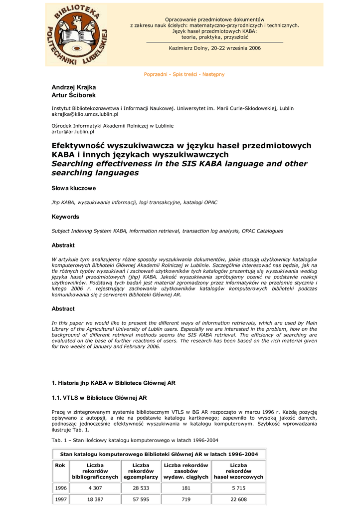 Opracowanie przedmiotowe dokumentów z zakresu nauk ścisłych: matematyczno-przyrodniczych i technicznych. Język haseł przedmiotowych KABA: teoria, praktyka, przyszłość Kazimierz Dolny, 20-22 września 2006 Poprzedni - Spis treści - Następny Andrzej Krajka Artur Ściborek Instytut Bibliotekoznawstwa i Informacji Naukowej. Uniwersytet im. Marii Curie-Skłodowskiej, Lublin [email protected] Ośrodek Informatyki Akademii Rolniczej w Lublinie [email protected] Efektywność wyszukiwawcza w języku haseł przedmiotowych KABA i innych językach wyszukiwawczych Searching effectiveness in the SIS KABA language and other searching languages Słowa kluczowe Jhp KABA, wyszukiwanie informacji, logi transakcyjne, katalogi OPAC Keywords Subject Indexing System KABA, information retrieval, transaction log analysis, OPAC Catalogues Abstrakt W artykule tym analizujemy różne sposoby wyszukiwania dokumentów, jakie stosują użytkownicy katalogów komputerowych Biblioteki Głównej Akademii Rolniczej w Lublinie. Szczególnie interesować nas będzie, jak na tle różnych typów wyszukiwań i zachowań użytkowników tych katalogów prezentują się wyszukiwania według języka haseł przedmiotowych (jhp) KABA. Jakość wyszukiwania spróbujemy ocenić na podstawie reakcji użytkowników. Podstawą tych badań jest materiał zgromadzony przez informatyków na przełomie stycznia i lutego 2006 r. rejestrujący zachowania użytkowników katalogów komputerowych biblioteki podczas komunikowania się z serwerem Biblioteki Głównej AR. Abstract In this paper we would like to present the different ways of information retrievals, which are used by Main Library of the Agricultural University of Lublin users. Especially we are interested in the problem, how on the background of different retrieval methods seems the SIS KABA retrieval. The efficiency of searching are evaluated on the base of further reactions of users. The research has been based on the rich material given for two weeks of January and February 2006. 1. Historia jhp KABA w Bibliotece Głównej AR 1.1. VTLS w Bibliotece Głównej AR Pracę w zintegrowanym systemie bibliotecznym VTLS w BG AR rozpoczęto w marcu 1996 r. Każdą pozycję opisywano z autopsji, a nie na podstawie katalogu kartkowego; zapewniło to wysoką jakość danych, podnosząc jednocześnie efektywność wyszukiwania w katalogu komputerowym. Szybkość wprowadzania ilustruje Tab. 1. Tab. 1 – Stan ilościowy katalogu komputerowego w latach 1996-2004 Stan katalogu komputerowego Biblioteki Głównej AR w latach 1996-2004 Rok Liczba rekordów bibliograficznych Liczba rekordów egzemplarzy Liczba rekordów zasobów wydaw. ciągłych Liczba rekordów haseł wzorcowych 1996 4 307 28 533 181 5 715 1997 18 387 57 595 719 22 608 1998 22 364 66 262 1 314 27 904 1999 26 665 74166 1689 34 495 2000 29 897 81472 1914 40 611 2001 33 665 87 683 2 214 46 147 2002 37 876 92 826 2 349 52 220 2003 42 030 98 124 2 487 55 278 2004 45 058 104 495 2 530 61079 Równolegle z opracowaniem zbiorów trwały przygotowania do wdrożenia kolejnego modułu VTLS udostępniania. We wrześniu 1998 r. uruchomiono obsługę wypożyczalni. Drugi etap wdrażania modułu udostępniania przyniósł kolejne udogodnienia. W lutym 2000 r. wprowadzono automatyczne zamawianie książek i czasopism. Z katalogiem można było połączyć się za pomocą telnetu lub poprzez bramkę WWW-VTLS Web Gateway, a także bezpośrednio ze strony domowej biblioteki. Analiza połączeń wykazała, że użytkownicy bardzo szybko docenili to udogodnienie. Przydatne okazały się także inne usprawnienia, podnoszące jakość korzystania z katalogu komputerowego, na przykład możliwość zapoznania się czytelnika ze stanem konta oraz informacja o statusie książki, pozwalająca zorientować się, czy dana pozycja jest w Bibliotece dostępna czy też wypożyczona. Ale największą zaletą z punktu widzenia potrzeb użytkowników była możliwość wieloaspektowego wyszukiwania informacji według następujących kryteriów: autor, tytuł, hasło przedmiotowe, słowa kluczowe, instytucja sprawcza, tytuł serii, tytuł czasopisma oraz sygnatura. Zarówno studenci, jak i pracownicy naukowi uczelni, doceniając walory katalogu komputerowego, w tym także dużą oszczędność czasu, bez większych oporów zamienili katalogi kartkowe na katalog dostępny on-line. Katalogi kartkowe były sukcesywnie zamykane. Jako pierwszy zamknięto w 1997 r. katalog przedmiotowy wydawnictw zwartych. Od tej pory wszystkie książki opracowywano w jhp KABA. Ze względu na czytelników dłużej prowadzono katalogi alfabetyczne wydawnictw zwartych i wydawnictw ciągłych. 1.2. NUKAT Omówienie działalności Biblioteki w zakresie komputeryzacji nie byłoby pełne bez wspomnienia o bardzo ważnym dla środowiska bibliotekarskiego przedsięwzięciu, jakim jest Narodowy Uniwersalny Katalog Centralny NUKAT. Koncepcja NUKAT zakładała budowę katalogu metodą współkatalogowania; jego podstawę stanowić miały istniejące bazy CKHW i CKTCz. Nadzór nad całością przedsięwzięcia sprawował powołany w 1998 r. Zespół Koordynacyjny NUKAT. W Zespole tym biblioteki lubelskie reprezentował Andrzej Padziński, przedstawiciel Biblioteki Głównej AR. W 2001 r. dotychczasowe Centrum Formatów i Kartotek Haseł Wzorcowych zostało przekształcone w Centrum NUKAT i przejęło zadanie prowadzenia katalogu centralnego. Rok 2003 przyniósł kolejne zmiany w Bibliotece. Kupiony osiem lat wcześniej sprzęt był już przestarzały i nie nadawał się do rozbudowy. Należało wymienić serwer i oprogramowanie na nowsze. Z podobnymi problemami borykały się także inne biblioteki pracujące w VTLS. Razem podjęto decyzję o wymianie dotychczas stosowanego oprogramowania na Virtuę. Wspólne negocjacje z firmą komputerową okazały się bardzo korzystne, ponieważ umożliwiły uzyskanie znacznych upustów dla tak dużego przedsięwzięcia. Zmiana oprogramowania i przenies