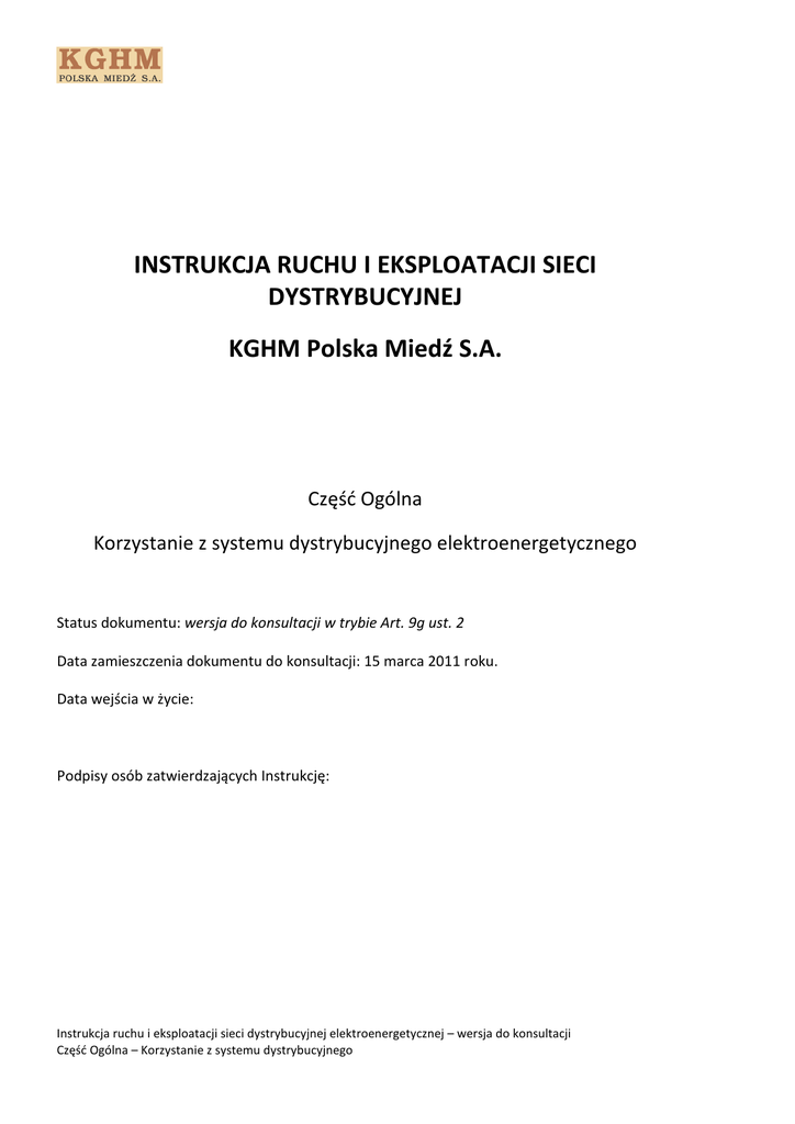 INSTRUKCJA RUCHU I EKSPLOATACJI SIECI DYSTRYBUCYJNEJ KGHM Polska Miedź S.A. Część Ogólna Korzystanie z systemu dystrybucyjnego elektroenergetycznego Status dokumentu: wersja do konsultacji w trybie Art. 9g ust. 2 Data zamieszczenia dokumentu do konsultacji: 15 marca 2011 roku. Data wejścia w życie: Podpisy osób zatwierdzających Instrukcję: Instrukcja ruchu i eksploatacji sieci dystrybucyjnej elektroenergetycznej – wersja do konsultacji Część Ogólna – Korzystanie z systemu dystrybucyjnego SPIS TREŚCI 1. DEFINICJE POJĘĆ 3 2. POSTANOWIENIA OGÓLNE 5 3. PRZYŁĄCZANIE NOWYCH ODBIORCÓW I ŹRÓDEŁ WYTWÓRCZYCH DO SIECI DYSTRYBUCYJNEJ KGHM 9 4. WYMAGANIA TECHNICZNE 16 5. EKSPLOATACJA URZĄDZEŃ, INSTALACJI I SIECI 19 6. BEZPIECZEŃSTWO FUNKCJONOWANIA SYSTEM ELEKTROENERGETYCZNEGO 24 7. WSPÓŁPRACA OSDN Z INNYMI OPERATORAMI I PRZEKAZYWANIE INFORMACJI POMIĘDZY OPERATORAMI ORAZ OPERATORAMI A UŻYTKOWNIKAMI SYSTEMU 30 8. PROWADZENIE RUCHU SIECI DYSTRYBUCYJNEJ 31 9. STANDARDY TECHNICZNE I BEZPIECZEŃSTWA PRACY SIECI DYSTRYBUCYJNEJ 37 10. PARAMETRY JAKOŚCIOWE ENERGII ELEKTRYCZNEJ 37 11. WSKAŹNIKI JAKOŚCI I NIEZAWODNOŚCI DOSTAW ENERGII ELEKTRYCZNEJ 37 12. DOPUSZCZALNE POZIOMY ZABURZEŃ PARAMETRÓW JAKOŚCIOWYCH ENERGII ELEKTRYCZNEJ 37 13. 38 STANDARDY JAKOŚCIOWE OBSŁUGI UŻYTKOWNIKÓW SYSTEMU ZAŁĄCZNIK NR 2. KARTY AKTUALIZACJI 40 2 Instrukcja ruchu i eksploatacji sieci dystrybucyjnej Część Ogólna – Korzystanie z systemu dystrybucyjnego 1. Definicje pojęć Operator Systemu Dystrybucyjnego (OSD) – przedsiębiorstwo energetyczne zajmujące się dystrybucją energii elektrycznej, odpowiedzialne ze ruch sieciowy w systemie dystrybucyjnym elektroenergetycznym, bieżące i długookresowe bezpieczeństwo funkcjonowania tego systemu, eksploatację, konserwację, remonty oraz niezbędną rozbudowę sieci dystrybucyjnej, w tym połączeń z innymi systemami elektroenergetycznymi. OSDn - KGHM Polska Miedź SA (KGHM) pełniący funkcję Operatora Systemu Dystrybucyjnego na własnej sieci dystrybucyjnej. OSDp – Operator Systemu Dystrybucyjnego nadrzędny w stosunku do OSDn (KGHM). Operator Systemu Przesyłowego (OSP) – przedsiębiorstwo energetyczne zajmujące się przesyłaniem energii elektrycznej, odpowiedzialne za ruch sieciowy w systemie przesyłowym, bieżące i długookresowe bezpieczeństwo funkcjonowania tego systemu, eksploatację, konserwację, remonty oraz niezbędną rozbudowę sieci przesyłowej, w tym połączeń z innymi systemami elektroenergetycznymi. Na terenie Polski Operatorem Systemu Przesyłowego jest PSE-Operator S.A. Sprzedawca – przedsiębiorstwo prowadzące działalność gospodarczą polegającą na sprzedaży energii elektrycznej przez niego wytworzonej lub przedsiębiorstwo energetyczne prowadzące działalność gospodarczą polegającą na obrocie energią elektryczną (posiadające koncesję na obrót energią elektryczną), Odbiorca – każdy kto pobiera energie elektryczną na podstawie umowy sprzedaży energii lub umowy kompleksowej zawartej z przedsiębiorstwem energetycznym, Sieć dystrybucyjna – sieć elektroenergetyczna wysokich, średnich i niskich napięć, za której ruch sieciowy jest odpowiedzialny operator systemu dystrybucyjnego, Miejsce dostarczania – punkt w sieci, do którego przedsiębiorstwa energetyczne dostarcza energię elektryczną, określony w umowie o przyłączenie, w umowie o świadczenie usług dystrybucji, w umowie sprzedaży energii elektrycznej albo umowie kompleksowej, MDD – Miejsce Dostarczania Energii Rynku Detalicznego MB – Miejsce dostarczania energii elektrycznej Rynku Bilansującego; umowny punkt w sieci, urządzeniu lub instalacji objętej obszarem Rynku Bilansującego lub punkt „poza siecią”, w którym następuje przekazanie energii pomiędzy Uczestnikiem Rynku Bilansującego a Rynkiem Bilansującym. MB może być określane jako fizyczne lub wirtualne URD – Uczestnik Rynku Detalicznego – podmiot, którego urządzenia lub instalacje są przyłączone do sieci dystrybucyjnej nie objętej obszarem rynku bilansującego oraz który zawarł umowę o świadczenie usług dystrybucji z właściwym OSD URDO – Uczestnik Rynku Detalicznego typu Odbiorca, 3 Instrukcja ruchu i eksploatacji sieci dystrybucyjnej Część Ogólna – Korzystanie z systemu dystrybucyjnego Moc przyłączeniowa – moc czynna planowana do pobierania lub wprowadzania do sieci, określana w umowie o przyłączenie jako wartość maksymalna za średnich wartości tej mocy w okresie 15 minut, służąca do zaprojektowania przyłącza, Punkt Poboru Energii (PPE) – najmniejsza jednostka, dla której odbywa się zbilansowanie dostaw, oraz dla której może nastąpić zmiana dostawcy, obejmująca jeden lub więcej fizycznych punktów pomiarowych, PDE – Punkt Dostarczania Energii; miejsce przyłączenia URD do sieci dystrybucyjnej poza obszarem Rynku Bilansującego, obejmujące jeden lub więcej punktów poboru energii, dla których realizowany jest proces bilansowania handlowego, FPP – Fizyczny Punkt Pomiarowy; punkt w sieci reprezentujący urządzenie zainstalowane na sieci OSD umożliwiające rejestrację rzeczywistego pomiaru przepływającej energii elektrycznej, Wirtualne Miejsce Dostarczania Energii Rynku Bilansującego (WMB) – miejsce w którym jest realizowana dostawa energii niepowiązane bezpośrednio z fizycznymi przepływani energii (punkt „poza siecią”). Ilość energii elektrycznej dostarczanej albo odebranej w WMB jest wyznaczana na podstawie wielkości energii wynikających z zawartych Umów Sprzedaży Energii, LSPR – Lokalny System Pomiarowo-Rozliczeniowy Rynek Bilansujący (RB) – mechanizm bieżącego bilansowania zapotrzebowania na energię elektryczną i wytwarzania tej energii z KSE POB – Podmiot Odpowiedzialny za bilansowanie handlowe, Energia elektryczna czynna – energia elektryczna przetwarzalna na inny rodzaj energii, Energia elektryczna bierna - energia elektryczna stale wy