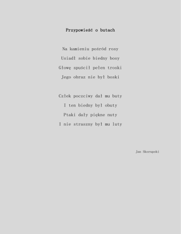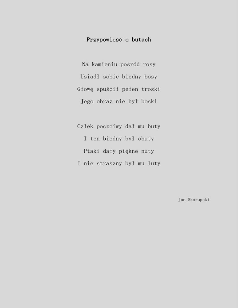 Przypowieść o butach Na kamieniu pośród rosy Usiadł sobie biedny bosy Głowę spuścił pełen troski Jego obraz nie był boski Człek poczciwy dał mu buty I ten biedny był obuty Ptaki dały piękne nuty I nie straszny był mu luty Jan Skorupski Przypowieść o istocie świata Czas napisać coś o świecie. Bo czymże jest świat? Tego nie wie nikt przecie. Odpowiedzi szukamy od lat... Świat to poszukiwanie. To wędrówka przez życie ludzkie. Choć życie to oczekiwanie, W porównaniu z czasem, tak krótkie. Świat to dróg plątanina, Pełna uczuć zdarzeń i ludzi. Życie się kończy i zaczyna, A po życiu się człowiek budzi. Maria Zdort Przypowieść o malarzu Pewnego razu, na pierwszym piętrze Był sobie malarz. Żył marzeniami. Miał bogate domu wnętrze obwieszone obrazami Jego cudownymi tworami Tworzył i tworzył, aż dnia pewnego Spojrzało na niego odbicie z lustra na ścianie zawieszonego Miał siwe włosy, cerę koloru prosa Nawet nie zauważył, gdy całe życie przeszło mu koło nosa. Autor anonimowy Przypowieść o przemijaniu Rano, kiedy dzień się budzi, Świeżość wiosny wita ludzi, Żar południa, lato, praca, Człowiek znów do domu wraca. Jesień, liście, przemijanie Co się jeszcze w życiu stanie? Ukołysze bielą zima I do wieosny tak nas trzyma. Krzysztof Bińkowski Przypowieść o pszczołach Ostatniej pogodnej wiosny Hodując wysokie sosny Spostrzegłem pszczoły bzyczące Z roślin nektar pijące Na kwiatkach przysiadały I pyszny miód zbierały Pracowite jak mróweczki Zapylały boróweczki Pracowici lepiej mają Dużo w życiu osiągają. Julia Weśniuk Przypowieść o rodzinie Choć byśmy się nie wiem jak postarali To bez domu byśmy nie wytrzymali Tam, gdzie mama pyszne ciasto upiecze Tata, czasem, z matmy się popisze Siostra nieraz w pokoju pobrudzi A brat samochodami nas zanudzi My to dla nich mimo wszystko zniesiemy Bo dla rodziny chyba wszystko zrobimy Alicja Wypych Przypowieść o skarpetkach Jedne szare, drugie białe, Jedne duże, drugie małe. Zawsze razem połączone Choć na różnych nogach one. Nosi mama, nosi tata. Znajdziesz także je u brata. Brudne, czyste to zależy. No, na pewno nie od jeży. Nie zapomnij więc o pralce, Proszek ci pomoże w walce. Z zapachami powojujesz, I swój honor uratujesz. Wiktor Anderman Przypowieść o szkole Nasza szkoła jest najlepsza w świecie Czy wy wszyscy o tym wiecie? Nauczyciele to dobrzy ludzie Nie chcemy przecież, by żyli w trudzie Zacznijmy więc pilnie lekcje odrabiać A na zajęciach nigdy nie gadać Nie denerwujmy nauczycieli miłych Bo chcemy przecież, by długo żyli Patrycja Plaskota