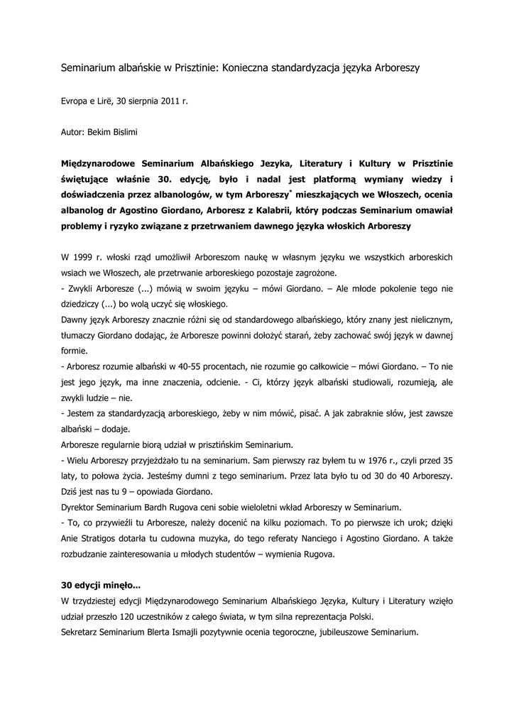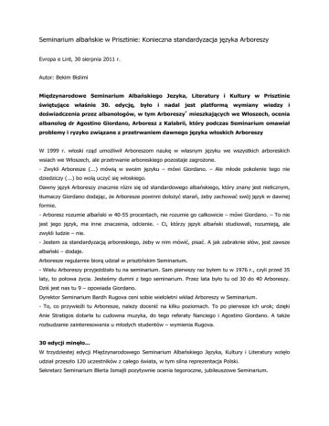 Seminarium albańskie w Prisztinie: Konieczna standardyzacja języka Arboreszy Evropa e Lirë, 30 sierpnia 2011 r. Autor: Bekim Bislimi Międzynarodowe Seminarium Albańskiego Jezyka, Literatury i Kultury w Prisztinie świętujące właśnie 30. edycję, było i nadal jest platformą wymiany wiedzy i doświadczenia przez albanologów, w tym Arboreszy* mieszkających we Włoszech, ocenia albanolog dr Agostino Giordano, Arboresz z Kalabrii, który podczas Seminarium omawiał problemy i ryzyko związane z przetrwaniem dawnego języka włoskich Arboreszy W 1999 r. włoski rząd umożliwił Arboreszom naukę w własnym języku we wszystkich arboreskich wsiach we Włoszech, ale przetrwanie arboreskiego pozostaje zagrożone. - Zwykli Arboresze (...) mówią w swoim języku – mówi Giordano. – Ale młode pokolenie tego nie dziedziczy (...) bo wolą uczyć się włoskiego. Dawny język Arboreszy znacznie różni się od standardowego albańskiego, który znany jest nielicznym, tłumaczy Giordano dodając, że Arboresze powinni dołożyć starań, żeby zachować swój język w dawnej formie. - Arboresz rozumie albański w 40-55 procentach, nie rozumie go całkowicie – mówi Giordano. – To nie jest jego język, ma inne znaczenia, odcienie. - Ci, którzy język albański studiowali, rozumieją, ale zwykli ludzie – nie. - Jestem za standardyzacją arboreskiego, żeby w nim mówić, pisać. A jak zabraknie słów, jest zawsze albański – dodaje. Arboresze regularnie biorą udział w prisztińskim Seminarium. - Wielu Arboreszy przyjeżdżało tu na seminarium. Sam pierwszy raz byłem tu w 1976 r., czyli przed 35 laty, to połowa życia. Jesteśmy dumni z tego seminarium. Przez lata było tu od 30 do 40 Arboreszy. Dziś jest nas tu 9 – opowiada Giordano. Dyrektor Seminarium Bardh Rugova ceni sobie wieloletni wkład Arboreszy w Seminarium. - To, co przywieźli tu Arboresze, należy docenić na kilku poziomach. To po pierwsze ich urok; dzięki Anie Stratigos dotarła tu cudowna muzyka, do tego referaty Nanciego i Agostino Giordano. A także rozbudzanie zainteresowania u młodych studentów – wymienia Rugova. 30 edycji minęło... W trzydziestej edycji Międzynarodowego Seminarium Albańskiego Języka, Kultury i Literatury wzięło udział przeszło 120 uczestników z całego świata, w tym silna reprezentacja Polski. Sekretarz Seminarium Blerta Ismajli pozytywnie ocenia tegoroczne, jubileuszowe Seminarium. - To, co czyni to Seminarium wyjątkowym, to obecność młodego pokolenia zagranicznych studentów, którzy (...) zaprezentowali tu ciekawe prace – powiedziała Ismajli. - Chodzi o to, że nie przyjeżdżają tylko, powiedzmy, weteranach seminarium, którzy dziś są znanymi profesorami, ale również młodzi, co jest dowodem rozwoju albanologii. Pozytywne opinie wyrażane przez seminarzystów są dla organizatorów najlepszą nagrodą. - To, że są zadowoleni z Seminarium i chcieliby wrócić w przyszłym roku, jest dla nas, jako organizatorów, pozytywnym sygnałem – dodała. – Od poniedziałku zaczynamy przygotowania do kolejnej edycji, za rok. * Arboresze (alb. Arbëreshë) to potomkowie Albańczyków, którzy w XV-XVIII w. emigrowali z Albanii do Włoch; mieszkają w 50 społecznościach w południowych Włoszech, przede wszystkim w Kalabrii, Apulii i na Sycylii, posługują się dialektem języka albańskiego, i są w większości katolikami obrządku wschodniego. Tłum. i red. Marta Kołczyńska