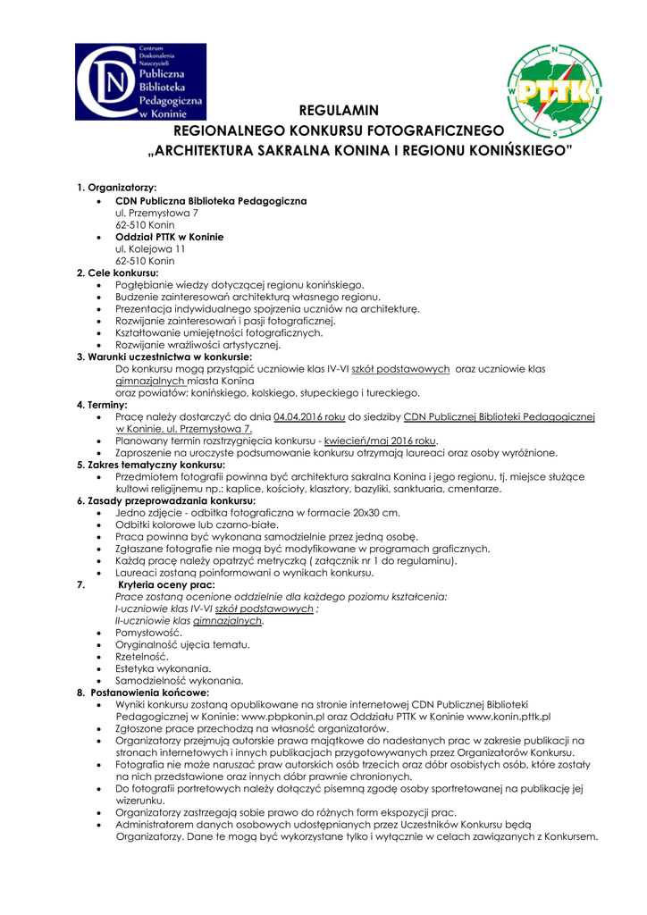 REGULAMIN REGIONALNEGO KONKURSU FOTOGRAFICZNEGO „ARCHITEKTURA SAKRALNA KONINA I REGIONU KONIŃSKIEGO” 1. Organizatorzy: • CDN Publiczna Biblioteka Pedagogiczna ul. Przemysłowa 7 62-510 Konin • Oddział PTTK w Koninie ul. Kolejowa 11 62-510 Konin 2. Cele konkursu: • Pogłębianie wiedzy dotyczącej regionu konińskiego. • Budzenie zainteresowań architekturą własnego regionu. • Prezentacja indywidualnego spojrzenia uczniów na architekturę. • Rozwijanie zainteresowań i pasji fotograficznej. • Kształtowanie umiejętności fotograficznych. • Rozwijanie wrażliwości artystycznej. 3. Warunki uczestnictwa w konkursie: Do konkursu mogą przystąpić uczniowie klas IV-VI szkół podstawowych oraz uczniowie klas gimnazjalnych miasta Konina oraz powiatów: konińskiego, kolskiego, słupeckiego i tureckiego. 4. Terminy: • Pracę należy dostarczyć do dnia 04.04.2016 roku do siedziby CDN Publicznej Biblioteki Pedagogicznej w Koninie, ul. Przemysłowa 7. • Planowany termin rozstrzygnięcia konkursu - kwiecień/maj 2016 roku. • Zaproszenie na uroczyste podsumowanie konkursu otrzymają laureaci oraz osoby wyróżnione. 5. Zakres tematyczny konkursu: • Przedmiotem fotografii powinna być architektura sakralna Konina i jego regionu, tj. miejsce służące kultowi religijnemu np.: kaplice, kościoły, klasztory, bazyliki, sanktuaria, cmentarze. 6. Zasady przeprowadzania konkursu: • Jedno zdjęcie - odbitka fotograficzna w formacie 20x30 cm. • Odbitki kolorowe lub czarno-białe. • Praca powinna być wykonana samodzielnie przez jedną osobę. • Zgłaszane fotografie nie mogą być modyfikowane w programach graficznych. • Każdą pracę należy opatrzyć metryczką ( załącznik nr 1 do regulaminu). • Laureaci zostaną poinformowani o wynikach konkursu. 7. Kryteria oceny prac: Prace zostaną ocenione oddzielnie dla każdego poziomu kształcenia: I-uczniowie klas IV-VI szkół podstawowych ; II-uczniowie klas gimnazjalnych. • Pomysłowość. • Oryginalność ujęcia tematu. • Rzetelność. • Estetyka wykonania. • Samodzielność wykonania. 8. Postanowienia końcowe: • Wyniki konkursu zostaną opublikowane na stronie internetowej CDN Publicznej Biblioteki Pedagogicznej w Koninie: www.pbpkonin.pl oraz Oddziału PTTK w Koninie www.konin.pttk.pl • Zgłoszone prace przechodzą na własność organizatorów. • Organizatorzy przejmują autorskie prawa majątkowe do nadesłanych prac w zakresie publikacji na stronach internetowych i innych publikacjach przygotowywanych przez Organizatorów Konkursu. • Fotografia nie może naruszać praw autorskich osób trzecich oraz dóbr osobistych osób, które zostały na nich przedstawione oraz innych dóbr prawnie chronionych. • Do fotografii portretowych należy dołączyć pisemną zgodę osoby sportretowanej na publikację jej wizerunku. • Organizatorzy zastrzegają sobie prawo do różnych form ekspozycji prac. • Administratorem danych osobowych udostępnianych przez Uczestników Konkursu będą Organizatorzy. Dane te mogą być wykorzystane tylko i wyłącznie w celach zawiązanych z Konkursem.