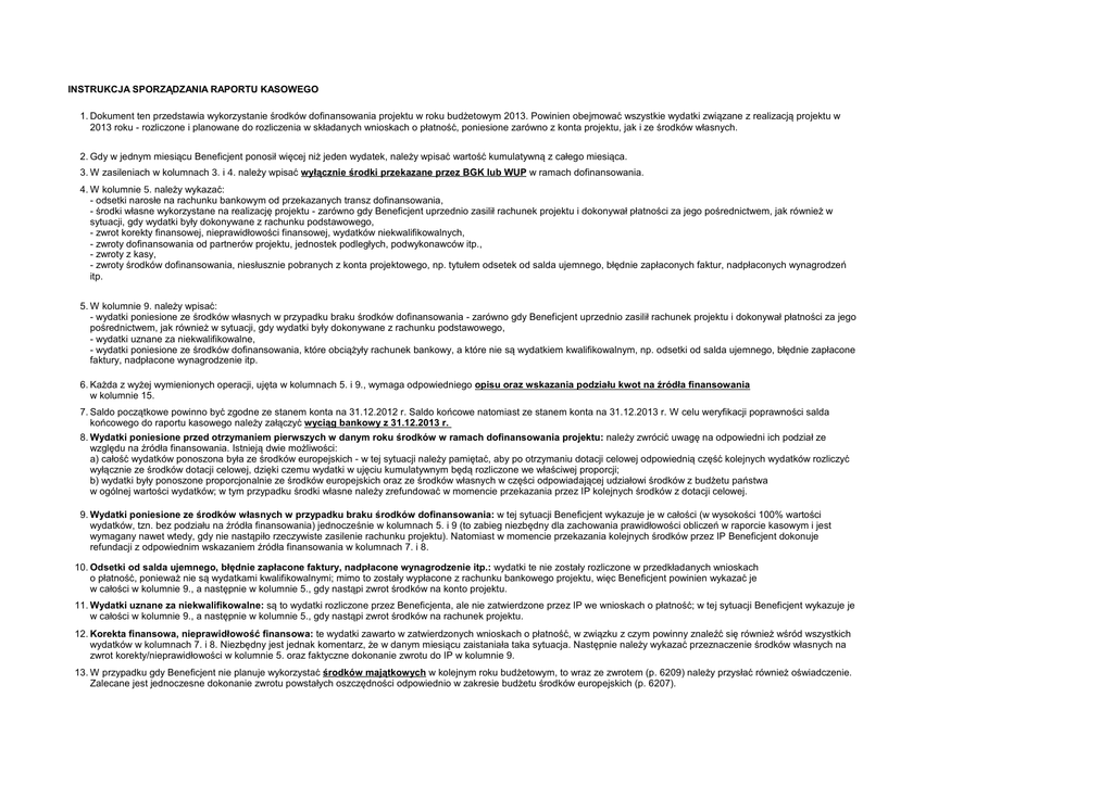 INSTRUKCJA SPORZĄDZANIA RAPORTU KASOWEGO 1. Dokument ten przedstawia wykorzystanie środków dofinansowania projektu w roku budżetowym 2013. Powinien obejmować wszystkie wydatki związane z realizacją projektu w 2013 roku - rozliczone i planowane do rozliczenia w składanych wnioskach o płatność, poniesione zarówno z konta projektu, jak i ze środków własnych. 2. Gdy w jednym miesiącu Beneficjent ponosił więcej niż jeden wydatek, należy wpisać wartość kumulatywną z całego miesiąca. 3. W zasileniach w kolumnach 3. i 4. należy wpisać wyłącznie środki przekazane przez BGK lub WUP w ramach dofinansowania. 4. W kolumnie 5. należy wykazać: - odsetki narosłe na rachunku bankowym od przekazanych transz dofinansowania, - środki własne wykorzystane na realizację projektu - zarówno gdy Beneficjent uprzednio zasilił rachunek projektu i dokonywał płatności za jego pośrednictwem, jak również w sytuacji, gdy wydatki były dokonywane z rachunku podstawowego, - zwrot korekty finansowej, nieprawidłowości finansowej, wydatków niekwalifikowalnych, - zwroty dofinansowania od partnerów projektu, jednostek podległych, podwykonawców itp., - zwroty z kasy, - zwroty środków dofinansowania, niesłusznie pobranych z konta projektowego, np. tytułem odsetek od salda ujemnego, błędnie zapłaconych faktur, nadpłaconych wynagrodzeń itp. 5. W kolumnie 9. należy wpisać: - wydatki poniesione ze środków własnych w przypadku braku środków dofinansowania - zarówno gdy Beneficjent uprzednio zasilił rachunek projektu i dokonywał płatności za jego pośrednictwem, jak również w sytuacji, gdy wydatki były dokonywane z rachunku podstawowego, - wydatki uznane za niekwalifikowalne, - wydatki poniesione ze środków dofinansowania, które obciążyły rachunek bankowy, a które nie są wydatkiem kwalifikowalnym, np. odsetki od salda ujemnego, błędnie zapłacone faktury, nadpłacone wynagrodzenie itp. 6. Każda z wyżej wymienionych operacji, ujęta w kolumnach 5. i 9., wymaga odpowiedniego opisu oraz wskazania podziału kwot na źródła finansowania w kolumnie 15. 7. Saldo początkowe powinno być zgodne ze stanem konta na 31.12.2012 r. Saldo końcowe natomiast ze stanem konta na 31.12.2013 r. W celu weryfikacji poprawności salda końcowego do raportu kasowego należy załączyć wyciąg bankowy z 31.12.2013 r. 8. Wydatki poniesione przed otrzymaniem pierwszych w danym roku środków w ramach dofinansowania projektu: należy zwrócić uwagę na odpowiedni ich podział ze względu na źródła finansowania. Istnieją dwie możliwości: a) całość wydatków ponoszona była ze środków europejskich - w tej sytuacji należy pamiętać, aby po otrzymaniu dotacji celowej odpowiednią część kolejnych wydatków rozliczyć wyłącznie ze środków dotacji celowej, dzięki czemu wydatki w ujęciu kumulatywnym będą rozliczone we właściwej proporcji; b) wydatki były ponoszone proporcjonalnie ze środków europejskich oraz ze środków własnych w części odpowiadającej udziałowi środków z budżetu państwa w ogólnej wartości wydatków; w tym przypadku środki własne należy zrefundować w momencie przekazania przez IP kolejnych środków z dotacji celowej. 9. Wydatki poniesione ze środków własnych w przypadku braku środków dofinansowania: w tej sytuacji Beneficjent wykazuje je w całości (w wysokości 100% wartości wydatków, tzn. bez podziału na źródła finansowania) jednocześnie w kolumnach 5. i 9 (to zabieg niezbędny dla zachowania prawidłowości obliczeń w raporcie kasowym i jest wymagany nawet wtedy, gdy nie nastąpiło rzeczywiste zasilenie rachunku projektu). Natomiast w momencie przekazania kolejnych środków przez IP Beneficjent dokonuje refundacji z odpowiednim wskazaniem źródła finansowania w kolumnach 7. i 8. 10. Odsetki od salda ujemnego, błędnie zapłacone faktury, nadpłacone wynagrodzenie itp.: wydatki te nie zostały rozliczone w przedkładanych wnioskach o płatność, ponieważ nie są wydatkami kwalifikowalnymi; mimo to zostały wypłacone z rachunku bankowego projektu, więc Beneficjent powinien wykazać je w całości w kolumnie 9., a następnie w kolumnie 5., gdy nastąpi zwrot środków na konto projektu. 11. Wydatki uznane za niekwalifikowalne: są to wydatki rozliczone przez Beneficjenta, ale nie zatwierdzone przez IP we wnioskach o płatność; w tej sytuacji Beneficjent wykazuje je w całości w kolumnie 9., a następnie w kolumnie 5., gdy nastąpi zwrot środków na rachunek projektu. 12. Korekta finansowa, nieprawidłowość finansowa: te wydatki zawarto w zatwierdzonych wnioskach o płatność, w związku z czym powinny znaleźć się również wśród wszystkich wydatków w kolumnach 7. i 8. Niezbędny jest jednak komentarz, że w danym miesiącu zaistaniała taka sytuacja. Następnie należy wykazać przeznaczenie środków własnych na zwrot korekty/nieprawidłowości w kolumnie 5. oraz faktyczne dokonanie zwrotu do IP w kolumnie 9. 13. W przypadku gdy Beneficjent nie planuje wykorzystać środków majątkowych w kolejnym roku budżetowym, to wraz ze zwrotem (p. 6209) należy przysłać również oświadczenie. Zalecane jest jednoczesne dokonanie zwrotu powstałych oszczędności odpowiednio w zakresie budżetu środków europejskich (p. 6207).