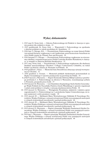 Wykaz dokumentów 1. 1915 maj 22, Nowy Jork. — Odezwa Paderewskiego do Polaków w Ameryce w sprawie pomocy dla rodaków w kraju. 13 2. 1915 paŸdziernik 26, Nowy Jork. — WypowiedŸ I. Paderewskiego na spotkaniu z dzieæmi polskimi ze szko³y parafialnej œw. Stanis³awa. 15 3. 1916 luty 5, Chicago, ILL. — Przemówienie Paderewskiego na temat historii Polski i jej sytuacji bie¿¹cej, wyg³oszone w sali Auditorium, przed koncertem–benefisem na rzecz Polski (znane pt. Poland. Past and Present). 16 4. 1916 listopad 27, Chicago. — Przemówienie Paderewskiego wyg³oszone na wieczornicy ¿a³obnej, zorganizowanej przez Polski Centralny Komitet Ratunkowy w Ameryce, w zwi¹zku ze œmierci¹ Henryka Sienkiewicza. 21 5. 1917 maj, Nowy Jork. — Przemówienie I. Paderewskiego wyg³oszone dla s³uchaczy Studium nauczycielskiego (Teachers’ College) Uniwersytetu Columbia, na temat Polski i jej historii. (Znane pt. Remarks on Poland). 26 6. 1918 grudzieñ 1, Pary¿. — Memoria³ Jana Strzembosza dotycz¹cy sytuacji wewnêtrznej na Ukrainie. 31 7. 1918 grudzieñ 3, Cieszyn. — Memoria³ polskich duchownych protestanckich ze Œl¹ska Cieszyñskiego w sprawie przy³¹czenia tej prowincji do Polski. 34 8. [19]19 styczeñ 2, Warszawa. — Raport Komendy G³ównej Milicji Ludowej o przebiegu powitania I. J. Paderewskiego na dworcu w Warszawie, wczeœniejszego pobytu w Poznaniu, przejazdu przez £ódŸ. 37 9. 1919 styczeñ 10, Warszawa. — List Stanis³awa Szeptyckiego Szefa Sztabu Generalnego Wojsk Polskich do Naczelnika Pañstwa Józefa Pi³sudskiego w sprawie organizacji i zadañ armii polskiej w zwi¹zku z sytuacj¹ miêdzynarodow¹ Polski. 38 10. 1919 styczeñ 14, Warszawa. — Wyst¹pienie Prezydenta, ministrów i ministra spraw zagranicznych I. J. Paderewskiego na 1. posiedzeniu Sejmu Ustawodawczego, na temat zamierzeñ i celów premiera i rz¹du. 39 11. 1919 styczeñ 20 — Meldunek Biura Wywiadowczego Oddzia³u II Naczelnego Dowództwa Wojska Polskiego o sytuacji wewnêtrznej Polski oraz panuj¹cych nastrojach w ró¿nych œrodowiskach zawodowych i partiach politycznych. 40 12. 1919 styczeñ 20 — Meldunek Biura Wywiadowczego Oddzia³u II Naczelnego Dowództwa Wojska Polskiego o sytuacji wewnêtrznej Polski oraz panuj¹cych nastrojach w ró¿nych œrodowiskach zawodowych i partiach politycznych. 44 13. 1919 styczeñ 22, Warszawa. — Raport sytuacyjny Wydzia³u ¯andarmerii Sztabu Generalnego Wojska Polskiego o sytuacji wewnêtrznej Polski oraz panuj¹cych nastrojach w ró¿nych œrodowiskach zawodowych i partiach politycznych. 46 14. 1919 luty 1, Warszawa. — Raport sytuacyjny Wydzia³u ¯andarmerii Sztabu Generalnego Wojska Polskiego o sytuacji wewnêtrznej Polski oraz panuj¹cych nastrojach w ró¿nych œrodowiskach zawodowych i partiach politycznych. 48 392 15. 1919 luty 7, Warszawa. — Raport sytuacyjny Wydzia³u ¯andarmerii Sztabu Generalnego Wojska Polskiego o sytuacji wewnêtrznej Polski oraz panuj¹cych nastrojach w ró¿nych œrodowiskach zawodowych i partiach politycznych. 50 16. 1919 luty 14, Warszawa. — Raport o sytuacji wewnêtrznej Polski oraz panuj¹cych nastrojach w ró¿nych œrodowiskach zawodowych i partiach politycznych. 52 17. 1919 luty 14, Pary¿. — Memoria³ pastora Juliusza Bursche o historii i sytuacji bie¿¹cej ewangelików w Polsce. 53 18. 1919 luty 16, Skoczów. — List Stanis³awa Dangela do Ministerstwa Spraw Zagranicznych RP w sprawie przebiegu prac Komisji Miêdzysojuszniczej na Œl¹sku Cieszyñskim. 54 19. 1919 luty 20, Warszawa. — Wyst¹pienie Prezydenta ministrów i ministra spraw zagranicznych I. J. Paderewskiego na 3. posiedzeniu Sejmu Ustawodawczego. Sprawozdanie na temat sytuacji w kraju w chwili objêcia urzêdu oraz w trakcie 23 dni sprawowania w³adzy. 57 20. 1919 luty 28, Warszawa. — Notatka w sprawie organizacji s³u¿by bezpieczeñstwa w Polsce. 66 21. 1919 marzec 5, Warszawa. — Wyst¹pienie Prezydenta, ministrów i ministra spraw zagranicznych I. J. Paderewskiego na 10. posiedzeniu Sejmu Ustawodawczego na temat stanu rokowañ z Ukrain¹. 68 22. 1919 marzec 8, Warszawa. — Memoria³ komisji dla ustalenia granic Polski w sprawie przebiegu prac. 69 23. 1919 marzec 10, Warszawa. — Memoria³ Delegacji Rad Polskich Litwy i Bia³orusi do rz¹du RP w sprawie koniecznoœci utrzymania ³¹cznoœci tych ziem z Polsk¹. 70 24. 1919 marzec 10, Warszawa. — Raport sytuacyjny Biura Wywiadowczego Oddzia³u II Naczelnego Dowództwa Wojska Polskiego o sytuacji wewnêtrznej Polski oraz panuj¹cych nastrojach w ró¿nych œrodowiskach zawodowych i partiach politycznych. 71 25. 1919 marzec 24, Pary¿. — Memoria³ Augustinasa Voldemarasa w sprawie postulatów terytorialnych przysz³ego pañstwa litewskiego. 75 26. 1919 marzec 26, Warszawa. — Wyst¹pienie Prezydenta ministrów i ministra spraw zagranicznych I. J. Paderewskiego na 18. posiedzeniu Sejmu Ustawodawczego na temat bie¿¹cej polityki wewnêtrznej i zagranicznej Polski. 77 27. 1919 marzec 29 — Memoria³ Erazma Piltza w sprawie koncepcji polskiej granicy wschodniej. 81 28. 1919 kwiecieñ 2, Warszawa. — Notatka o wypowiedzi Stanis³awa Povilanisa dla Dyrekcji Polskiej Agencji Telegraficznej o sytuacji wewnêtrznej na Litwie Kowieñskiej. 84 29. 1919 kwiecieñ 5, Pary¿. — Memoria³ Augustinasa Voldemarasa w sprawie postulatów terytorialnych przysz³ego pañstwa litewskiego oraz stosunków polsko–litewskich. 85 30. 1919 kwiecieñ 5, Cieszyn. — List Delegata Ministerstwa Spraw Zagranicznych przy Komisji Miêdzysojuszniczej w Cieszynie W³adys³awa Günthera do Komitetu Narodowego Polskiego w sprawie mo¿liwoœci przeprowadzenia plebiscytu na terenie Œl¹ska Cieszyñskiego. 87 31. 1919 kwiecieñ 7, [Cieszyn]. — Raport Delegata Ministerstwa Spraw Zagranicznych przy Komisji Miêdzysojuszniczej w Cieszynie W³adys³awa Günthera do I. Paderewskiego w sprawie dzia³alnoœci Komisji Miêdzysojuszniczej na Œl¹sku Cieszyñskim i panuj¹cej tam sytuacji. 88 393 32. 1919 kwie