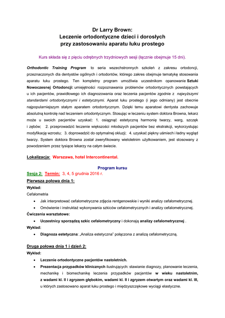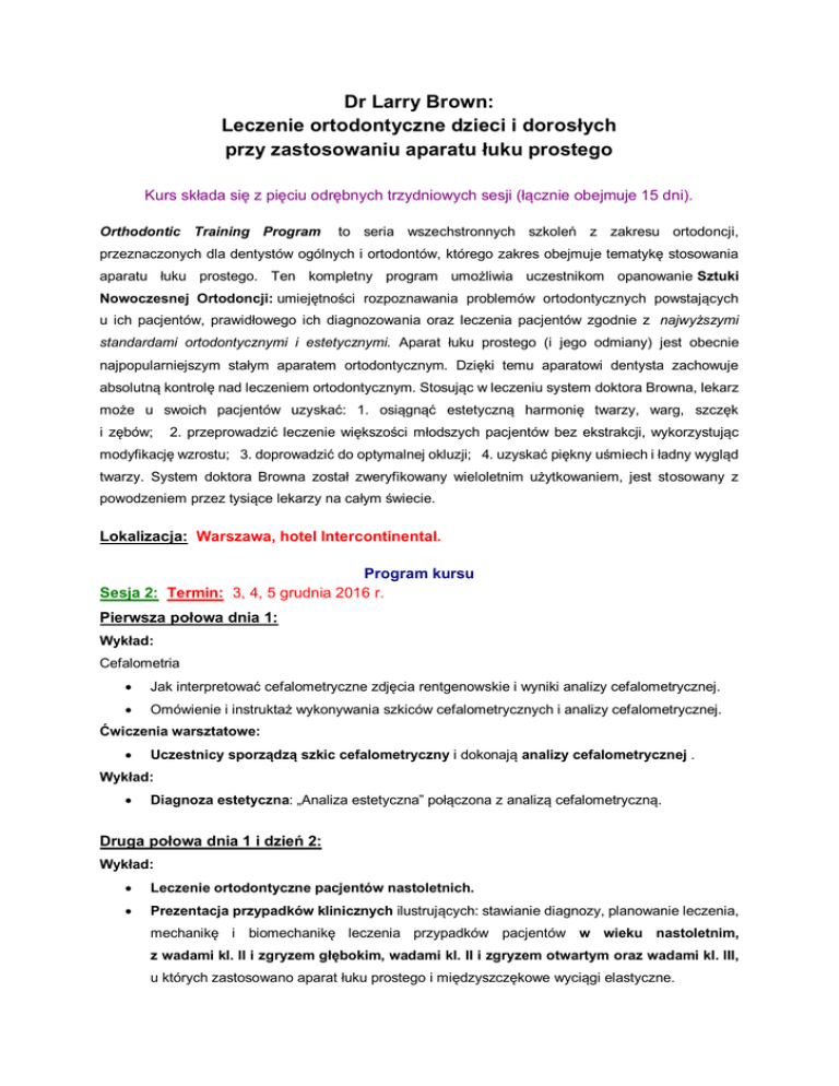 Dr Larry Brown: Leczenie ortodontyczne dzieci i dorosłych przy zastosowaniu aparatu łuku prostego Kurs składa się z pięciu odrębnych trzydniowych sesji (łącznie obejmuje 15 dni). Orthodontic Training Program to seria wszechstronnych szkoleń z zakresu ortodoncji, przeznaczonych dla dentystów ogólnych i ortodontów, którego zakres obejmuje tematykę stosowania aparatu łuku prostego. Ten kompletny program umożliwia uczestnikom opanowanie Sztuki Nowoczesnej Ortodoncji: umiejętności rozpoznawania problemów ortodontycznych powstających u ich pacjentów, prawidłowego ich diagnozowania oraz leczenia pacjentów zgodnie z najwyższymi standardami ortodontycznymi i estetycznymi. Aparat łuku prostego (i jego odmiany) jest obecnie najpopularniejszym stałym aparatem ortodontycznym. Dzięki temu aparatowi dentysta zachowuje absolutną kontrolę nad leczeniem ortodontycznym. Stosując w leczeniu system doktora Browna, lekarz może u swoich pacjentów uzyskać: 1. osiągnąć estetyczną harmonię twarzy, warg, szczęk i zębów; 2. przeprowadzić leczenie większości młodszych pacjentów bez ekstrakcji, wykorzystując modyfikację wzrostu; 3. doprowadzić do optymalnej okluzji; 4. uzyskać piękny uśmiech i ładny wygląd twarzy. System doktora Browna został zweryfikowany wieloletnim użytkowaniem, jest stosowany z powodzeniem przez tysiące lekarzy na całym świecie. Lokalizacja: Warszawa, hotel Intercontinental. Program kursu Sesja 2: Termin: 3, 4, 5 grudnia 2016 r. Pierwsza połowa dnia 1: Wykład: Cefalometria Jak interpretować cefalometryczne zdjęcia rentgenowskie i wyniki analizy cefalometrycznej. Omówienie i instruktaż wykonywania szkiców cefalometrycznych i analizy cefalometrycznej. Ćwiczenia warsztatowe: Uczestnicy sporządzą szkic cefalometryczny i dokonają analizy cefalometrycznej . Wykład: Diagnoza estetyczna: „Analiza estetyczna” połączona z analizą cefalometryczną. Druga połowa dnia 1 i dzień 2: Wykład: Leczenie ortodontyczne pacjentów nastoletnich. Prezentacja przypadków klinicznych ilustrujących: stawianie diagnozy, planowanie leczenia, mechanikę i biomechanikę leczenia przypadków pacjentów w wieku nastoletnim, z wadami kl. II i zgryzem głębokim, wadami kl. II i zgryzem otwartym oraz wadami kl. III, u których zastosowano aparat łuku prostego i międzyszczękowe wyciągi elastyczne. Wykład: Omówienie, instruktaż i prezentacja na żywo dopasowywania łuków stalowych 19x25. Biomechanika łuku pracującego. Ćwiczenia warsztatowe na typodontach: Dopasowywanie łuku stalowego 19x25 z haczykami: Formowanie łuku. Wykonywanie „dogięcia kołyskowego”. Torkowanie i odtorkowywanie łuku. Ćwiczenia warsztatowe: Demonstracja stosowania „lock-stopów” służących do zatrzymywania zębów, a także do ich przesuwania wzdłuż łuku, gdy są stosowane łącznie z otwartymi sprężynkami NiTi. Prezentacja przypadków klinicznych pacjentów, których leczenie przeprowadzono przy zastosowaniu tych prostych technik mechanicznych służących do przemieszczania zębów. Dzień 2: Pierwsza część dnia 2: Wykład: Kontynuacja: leczenie pacjentów w wieku nastoletnim. Druga część dnia 2 i dzień 3: Wykład: Leczenie ekstrakcyjne wad zgryzu kl. I i kl. II u pacjentów dorosłych: Objaśnienie i omówienie tematu zamykania przestrzeni przy użyciu „mechaniki poślizgu" siłami kl. I, kl. II i kl. III. Kamuflażowe leczenie kl. II Omówienie biomechaniki zamykania przestrzeni. Różne sytuacje zakotwienia. 1. Zakotwienie maksymalne. 2. Zakotwienie umiarkowane. 3. Zakotwienie minimalne. Jak uzyskać zakotwienie. Masowe (en masse) zamykanie przestrzeni. Dystalizacja kłów w pierwszej kolejności przy użyciu sprężynek zamkniętych i wewnątrzustnych wyciągów kl. I. Teoria 10-godzinnego oddziaływania siły: idea ta jest wykorzystywana przy przemieszczaniu zębów oraz dla uzyskania prawidłowego zakotwienia. Ćwiczenie warsztatowe na typodontach: zakładanie 200 g sprężynki zamkniętej od 1. Trzonowca do kła lub przedtrzonowca, w celu zamknięcia szpary. Prezentacja przypadków klinicznych: Przypadki ekstrakcyjne kl. I. Ekstrakcyjne leczenie kamuflażowe kl. II. Stosowanie różnych systemów zakotwienia. Wewnątrzustne wyciągi kl. I i kl. II stosowane w przypadkach ekstrakcyjnych. Stosowanie sprężynek zamkniętych NiTi. Stosowanie łańcuszków elastycznych. Informacje organizacyjne: Kurs prowadzony w języku angielskim, z tłumaczeniem konsekutywnym na język polski. Cena za pojedynczą, trzydniową sesję: 2295 zł. Rabaty od ceny podstawowej: przy wpłacie na min. miesiąc przed kursem (sesja II - do 03.11.2016 r.) – rabat w wysokości 100 zł; uczestnicy powtarzający sesję – rabat w wysokości 300 zł; studenci i stażyści będący członkami klubu LBO – rabat w wysokości 350 zł. Rabaty nie sumują się. Ostateczny termin wpłat za każdą z sesji upływa na dwa tygodnie przed jej rozpoczęciem (sesja II: 18.11.2016 r.). Płatności należy przelewać na dowolne z poniższych kont bankowych: 77 1030 0019 0109 8530 0037 7522 (Citi Handlowy) 88 1140 2004 0000 3102 4611 2077 (mBank) Właściciel: Ling Plus; Częstochowa, ul. Lechonia 5/39 UWAGA: w tytule przelewu prosimy koniecznie podawać nazwisko uczestnika i datę kursu, którego wpłata dotyczy. Opłata kaucyjna za typodont oraz podstawowe materiały warsztatowe zużywane podczas wszystkich sesji wynosi 200 zł (kwota ta nie obejmuje aparatu podniebiennego NiTi używanego na sesji 3). Kwota ta zostanie zwrócona uczestnikom po ukończeniu wszystkich pięciu sesji (zostanie odliczona od ceny sesji piątej). Uczestnicy przed poszczególnymi sesjami powinni zaopatrzyć się we wszystkie potrzebne narzędzia ortodontyczne, aby mieć możliwość pełnego uczestnictwa w warsztatach (narzędzia, oczywiście, będą później wykorzystywane podczas leczenia pacjentów). Dla wygody uczestników kursu są one dostępne u organizatorów – LBOrthodontics - w znacznie 