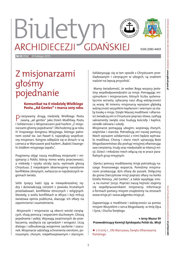 Nr 8 (316) • 21 lutego 2015 Z misjonarzami głośmy pojednanie Solidaryzując się w ten sposób z Chrystusem prześladowanym i cierpiącym w ubogich, są znakiem nadziei na lepszą przyszłość. Mamy świadomość, że wobec Boga wszyscy jesteśmy współodpowiedzialni za misje. Pomagając misjonarkom i misjonarzom, których liczba systematycznie wzrasta, spłacamy nasz dług wdzięczności za wiarę. W imieniu misjonarzy wyrażam głęboką wdzięczność wszystkim kapłanom i wiernym za stałą troskę o misje. Dzięki Waszej modlitwie i ofiarności świadczą oni o Chrystusie poprzez słowo, szafują sakramenty święte oraz budują kościoły i kaplice, ośrodki zdrowia i szkoły. Misjonarze pomagają ubogim, wspierają chorych, więźniów i starców. Potrzebują oni naszej pomocy. Niech wyrazem solidarności z nimi będzie wytrwała modlitwa. Chorzy i starsi niech upraszają Boże błogosławieństwo dla posługi misyjnej ofiarowując swe cierpienia, trudy oraz niedostatki w intencji misji. Dzieci i młodzież niech włączą się w prace parafialnych grup misyjnych. Komunikat na II niedzielę Wielkiego Postu „Ad Gentes” 1 marca 2015 roku P rzeżywamy drugą niedzielę Wielkiego Postu zwaną „ad gentes” jako Dzień Modlitwy, Postu i Solidarności z Misjonarzami pod hasłem „Z misjonarzami głośmy pojednanie”. Obchodzimy ją w roku IV Krajowego Kongresu Misyjnego, którego patronem został św. Jan Paweł II, największy współczesny misjonarz. Kongres odbędzie się w dniach 12-14 czerwca w Warszawie pod hasłem „Radość Ewangelii źródłem misyjnego zapału”. Pragniemy objąć naszą modlitwą misjonarki i misjonarzy z Polski, którzy mimo wielu przeciwności, a niekiedy i ryzyka utraty życia, wytrwale głoszą Chrystusa. Z niepokojem obserwujemy narastanie konfliktów zbrojnych, zwłaszcza w najuboższych regionach świata. Setki tysięcy ludzi żyją w niewyobrażalnej nędzy i doświadczają cierpień z powodu brutalnych prześladowań, konfliktów etnicznych i religijnych. Niestety, o wielu konfliktach w Afryce i Azji milczy światowa opinia publiczna, skazując ich ofiary na zapomnienie i osamotnienie. Zapewniając o modlitwie i wdzięczności za pomoc misjom Wszystkim z serca błogosławię: w Imię Ojca i Syna, i Ducha Świętego. Misjonarki i misjonarze są obecni wśród cierpiących, służą pomocą i wsparciem duchowym. Głoszą pojednanie i pokój. Wzywają zwaśnionych do przebaczenia, wyzbycia się uprzedzeń i wrogości. Uczą dialogu i odbudowują wzajemne zaufanie i szacunek. Misjonarze udzielają schronienia sierotom, porzuconym, chorym, niepełnosprawnym i starszym. + Jerzy Mazur SV Przewodniczący Komisji Episkopatu Polski ds. Misji ►►2 II 2015 r. , Ełk-Warszawa, Święto Ofiarowania Pańskiego 1 Biuletyn Archidiecezji Gdańskiej 21 lutego 2015 Oprócz pomocy modlitewnej misje potrzebują naszego finansowego wsparcia. Pomóżmy misjonarzom przekazując dziś ofiarę do puszek. Dołączmy do grona Darczyńców misji poprzez ofiary na konto Dzieła Pomocy „Ad Gentes”, a także wysyłając sms-a na numer 72032. Poprzez naszą hojność stajemy się współpracownikami misjonarzy. Informacje o formach pomocy misjom znajdziemy na stronach www.misje.pl i www.adgentes.misje.pl. Centrum Informacyjne Archidiecezji Gdańskiej www.gdansk.gosc.pl ISSN 2083-4403 Centrum Informacyjne Archidiecezji Gdańskiej www.gdansk.gosc.pl nr 8 (316) Komunikaty którzy po studiach lub kursach zarządzania i administracji, mogliby pomóc w opracowaniu planów logistycznych spotkań ŚDM 2016 w naszej Archidiecezji. Osoby, które będą chciały się zapisać powinny podać następujące dane: imię i nazwisko, adres zameldowania i zamieszkania, pesel, numer telefonu komórkowego oraz adres mailowy. Zgłoszenia prosimy kierować na adres: sdm2016gdansk.wolontariat@ gmail.com Rocznica świeceń biskupich Arcybiskupa Metropolity Gdańskiego Sławoja Leszka Głódzia D nia 23 lutego br. (poniedziałek) mija 24 rocznica święceń biskupich Arcybiskupa Metropolity Gdańskiego Sławoja Leszka Głódzia, które przyjął dnia 23 lutego 1991 r. w Bazylice Jasnogórskiej w Częstochowie. /-/ Ks. Stefan Pasternak Kanclerz Kurii /-/ Ks. Krzysztof Nowak Koordynator Przygotowań do ŚDM /-/ Ks. Stefan Pasternak Kanclerz Kurii Informacja o przygotowaniach do Światowych Dniach Młodzieży 2016 w Archidiecezji Gdańskiej /-/ Ks. Andrzej Pradela Dyrektor Wydziału Duszpasterskiego ►►23 lutego 2015 W ramach przygotowań do Światowych Dni Młodzieży, 26 lutego br. (czwar-tek) prosimy, aby w parafiach, domach zakonnych, kaplicach, poprowadzić spotkanie modlitewne i formacyjne. Sposób przeprowadzenia, czas i miejsce jest zależne od możliwości duszpasterskich. Prosimy, żeby podczas całego dnia, w miejscach modli-twy umieszczone były symbole ŚDM 2016 (zrobione we własnym zakresie lub zaku-pione), odczytana modlitwa 2016 oraz kapłani w krótkich słowach informowali wier-nych o idei i historii Światowych Dni Młodzieży. Przypominamy, że we wtorek, 24 lutego 2015 roku o godz. 20.30 odbędzie się kolejne spotkanie organizacyjne wszystkich służb biorących udział w przygoto-waniach do ŚDM. Miejsce spotkania: parafia pw. Bożego Ciała w Gdańsku–Morenie (ul. Piecewska 9). Zapraszamy na nie szczególnie kapłanów i świeckich, którzy są odpowiedzial-ni za organizację na diecezjalnych punktów przyjęć młodzieży w 2016 roku. Przed-stawimy zadania jakie będą im stawiane i sposoby ich realizacji. Przypominamy, że jest to kolejne ze spotkań, na których omawiamy konkretne plany związane ze Światowymi Dniami Młodzieży w 2016 roku. Informacje o zapisach do wolontariatu, który będzie posługiwał podczas Tygodnia w Archidiecezji Gdańskiej w ramach Światowych Dni Młodzieży 2016 Biuletyn Archidiecezji Gdańskiej 21 lutego 2015 W ydział Duszpasterstwa Młodzieży informuje, że trwają zapisy do wolontariatu, który będzie posługiwał podcz