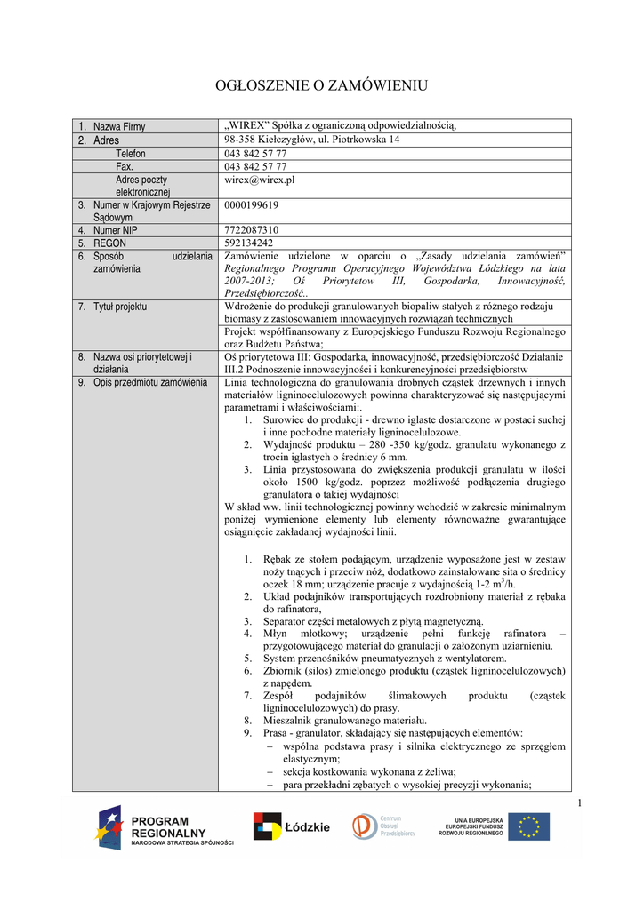 OGŁOSZENIE O ZAMÓWIENIU 1. Nazwa Firmy 2. Adres 3. 4. 5. 6. Telefon Fax. Adres poczty elektronicznej Numer w Krajowym Rejestrze Sądowym Numer NIP REGON Sposób udzielania zamówienia 7. Tytuł projektu 8. Nazwa osi priorytetowej i działania 9. Opis przedmiotu zamówienia „WIREX” Spółka z ograniczoną odpowiedzialnością, 98-358 Kiełczygłów, ul. Piotrkowska 14 043 842 57 77 043 842 57 77 [email protected] 0000199619 7722087310 592134242 Zamówienie udzielone w oparciu o „Zasady udzielania zamówień” Regionalnego Programu Operacyjnego Województwa Łódzkiego na lata 2007-2013; Oś Priorytetow III, Gospodarka, Innowacyjność, Przedsiębiorczość.. Wdrożenie do produkcji granulowanych biopaliw stałych z różnego rodzaju biomasy z zastosowaniem innowacyjnych rozwiązań technicznych Projekt współfinansowany z Europejskiego Funduszu Rozwoju Regionalnego oraz Budżetu Państwa; Oś priorytetowa III: Gospodarka, innowacyjność, przedsiębiorczość Działanie III.2 Podnoszenie innowacyjności i konkurencyjności przedsiębiorstw Linia technologiczna do granulowania drobnych cząstek drzewnych i innych materiałów ligninocelulozowych powinna charakteryzować się następującymi parametrami i właściwościami:. 1. Surowiec do produkcji - drewno iglaste dostarczone w postaci suchej i inne pochodne materiały ligninocelulozowe. 2. Wydajność produktu – 280 -350 kg/godz. granulatu wykonanego z trocin iglastych o średnicy 6 mm. 3. Linia przystosowana do zwiększenia produkcji granulatu w ilości około 1500 kg/godz. poprzez możliwość podłączenia drugiego granulatora o takiej wydajności W skład ww. linii technologicznej powinny wchodzić w zakresie minimalnym poniżej wymienione elementy lub elementy równoważne gwarantujące osiągnięcie zakładanej wydajności linii. 1. 2. 3. 4. 5. 6. 7. 8. 9. Rębak ze stołem podającym, urządzenie wyposażone jest w zestaw noży tnących i przeciw nóż, dodatkowo zainstalowane sita o średnicy oczek 18 mm; urządzenie pracuje z wydajnością 1-2 m3/h. Układ podajników transportujących rozdrobniony materiał z rębaka do rafinatora, Separator części metalowych z płytą magnetyczną. Młyn młotkowy; urządzenie pełni funkcję rafinatora – przygotowującego materiał do granulacji o założonym uziarnieniu. System przenośników pneumatycznych z wentylatorem. Zbiornik (silos) zmielonego produktu (cząstek ligninocelulozowych) z napędem. Zespół podajników ślimakowych produktu (cząstek ligninocelulozowych) do prasy. Mieszalnik granulowanego materiału. Prasa - granulator, składający się następujących elementów: − wspólna podstawa prasy i silnika elektrycznego ze sprzęgłem elastycznym; − sekcja kostkowania wykonana z żeliwa; − para przekładni zębatych o wysokiej precyzji wykonania; 1 − system smarowania ciśnieniowego z pompą olejową i silnikiem; 10. Przenośnik kubełkowy z napędem. 11. System schładzania granulatu z przesiewaczem i odciągiem części niezgranulowanych zawracanych automatycznie na granulator. 12. Przenośnik taśmowy do transportu gotowego granulatu z napędem. 13. Zbiornik samowyładowczy do gromadzenia granulatu; 14. Waga automatyczna i urządzenie workujące. 15. System odpylający składający się z wentylatora wyciągowego, cyklonu i filtra odpylającego. 16. System automatycznego sterowania całą linią z systemem kontroli 17. Wszystkie urządzenia muszą być nowe. 18. Maksymalny termin dostawy i instalacji linii - 31.10.2010 roku 10. Opis sposobu obliczania ceny 11. Opis kryteriów i ich znaczenie, sposób wyceny ofert Cena obejmuje wartość wyrażoną w jednostkach pieniężnych, którą Zamawiający jest obowiązany zapłacić za dostarczony towar, usługę lub roboty budowlane. W cenie uwzględnia się podatek od towarów i usług, podatek akcyzowy, jeżeli na podstawie odrębnych przepisów sprzedaż towaru usługi lub wykonanie robót budowlanych podlega obciążeniu podatkiem od towarów i usług oraz podatkiem akcyzowym. Cena w walucie innej niż PLN zostanie obliczona na podstawie średniego kursu NBP z ostatniego dnia roboczego poprzedzającego dzień otwarcia ofert. Należy podać cenę netto oraz cenę brutto podając stawkę i wysokość podatku VAT oraz stawkę i wysokość podatku akcyzowego. Cena – 70 % Formuły związane z liczeniem punktów za określone kryteria w ofercie Cena Liczba punktów = 70 * (Cena minimalna z wszystkich złożonych ofert / Cena analizowanej oferty) 12. Termin wykonania zamówienia 13. Opis sposobu przygotowania ofert 14. Miejsce oraz termin składania i otwarcia ofert 15. Opis warunków udziału w postępowaniu oraz sposobu dokonywania oceny spełnienia tych warunków Termin realizacji dostawy i instalacji linii – 30%. Formuły związane z liczeniem punktów za określone kryteria w ofercie Termin należy określić w pełnych miesiącach od momentu podpisania umowy na dostawę linii (np. 5 miesięcy). Liczba punktów = 30 * (Termin najkrótszy z wszystkich złożonych ofert / Termin analizowanej oferty) Maksymalny termin dostawy i instalacji linii - 31.10.2010 roku . Oferty proszę składać w formie pisemnej w języku polskim w zamkniętych kopertach z podaniem na kopercie nazwy składającego zamówienie oraz z dopiskiem „Odpowiedź na zamówienie - Linia technologiczna”. 98-358 Kiełczygłów, ul. Piotrkowska 14 – siedziba spółki. termin składania ofert – od 12.05.2010 do 21.05.2010 do godz. 15:00 termin otwarcia ofert - 21.05.2010 godz. 16:00 W przypadku nadania oferty przesyłką pocztową, kurierską lub w inny sposób oferta zostanie prawidłowo złożona jeżeli wpłynie do siedziby spółki przed upływem terminu składania ofert. Zamawiający zastrzega sobie możliwość zmiany warunków zamówienia lub unieważnienia postępowania. 2