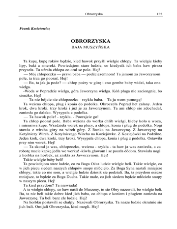 Obrorzyska 125 Frank Kmietowicz OBRORZYSKA BAJA MUSZYŃSKA Ta kupę, kupę roków będzie, kied hawok przyśli wielgie chłopy. Ta wielgie kieby lipy, buki a smereki. Powiedajom stare ludzie, co kiedysik ich baba haw pirsza przyszła. Ta uźrała chłopa co orał se pole. Hej! — Mój chłopeczku — prawi baba — podźciezemnom! Ta jamom za Jaworzynom pole, ta trza go poorać. Hej! — Ba, ta jak ja pode? — chłop poźry w górę i eno gembe baby widzi, taka ona wielga. -Woda w Popradzie wielga, góra Jaworzyna wielga. Kóń pługa nie zaciongnie, bo cienżko. Hej! — Ta nie bójcie sie chłopeczku - rzykła baba. - Ta ja wom pomogę! Ta wziena chłopa, pług i konia do podołka. Okroczeła Poprad het zalany. Jeden krok, dwa kroki, trzy kroki i już je za Jaworzynom. Ta ani chłop sie zdochadał, zaniesła go daleko. Wysypała z podołka. — Ta hawok pole! - rzykła. - Poorajcie go! Ta chłop poorał pole. Baba wziena do worka chlib wielgi, kieby koło u woza, i miensiwa kupę. Wsadzieła worek na plecy, a chłopa, konia i pług do podołka. Nogi stawia z wircha góry na wirch góry. Z Runka na Jaworzynę. Z Jaworzyny na Kotylniczy Wirch. Z Kotylniczego Wirchu na Koziejówke. Z Koziejówki na Podzilne. Jeden krok, dwa kroki, trzy kroki. Wysypała chłopa, konia i pług z podołka. Ostawiła przy nim worek. Hej! — Ta skond ja was, chłopeczku, wziena - rzykła - ta haw ja was zaniesła, a za robotę macie kapkę jedła we worku! -kiwła głowom i se poszła dódom. Stawiała nogi z horbka na horbek, aż znikła za Jaworzynom. Hej! Takie wielgie baby beli! Ta powiedajom stare ludzie, co za Boga Oćca ludzie wielgie beli. Takie wielgie, co w jich piecu siedem naszych chłopów snopy młócieło. Za Boga Syna nastali mniejsze chłopy, takie co me som, a wielgie ludzie dziesik sie podziali. Ba, ta przydom eszcze mniejsze, to będzie za Boga Ducha. Takie małe, co jich siedem będzie młócieło snopy w naszym piecu. Hej! Ta kied przydom? Ta niewiada! A te wielgie chłopy, co haw naśli do Muszeny, to sie Obry nazewali, bo wielgie beli. Ba, ta nie beli takie dobre kied jich baba, co chłopa z koniem i pługiem zaniesła na Jaworzynę. Ta beli barz złe ludzie. Hej! Na horbku postawili se chałpy. Nazewali Obrorzyska. Ta nasze ludzie okrutnie sie jich bali. Omijali Obrorzyska, kied mogli. Hej! 126 Frank Kmietowicz Ta z wiesnom Obry śli na zbój, het daleko za góry i lasy, a pod zimę schodzieli sie na Obrorzyskach i haw na zimę ostawali. Oj, dokuczali naszym ludziom, dokuczali! Śmichy se z nich robieli! Ta do telagi, co ma dwa kółka, zaprzongali śtyry nasze dziopy i poganiali biczami. Tak se robieli wyścigi z Obrorzysków do Muszeny i nazad. Bili dziopy i rechotali sie. A nikto ni móg jim dać rady. Stara Pikulina pada do swoich dziopów: — Ta za siódmom górom i za trzeciom rzykom je na Madziarach okrutnie mondry baczą. Ta pódziecie do niego i wszyćko opowicie, co te Obry hawok wychadujom. Ta ón wom powi, co trza porobieć. Hej! Ta pośli dziopy na Madziary. Ta naśli baczę, co miał wielgie kierdele owców. Kied jemu wszyćko powiedali, baczą sie ozwał: — Ta te Obry na zimę do was przychodzom? — Hej! Zawdy na zimę! — Ta u was ostanom na zawdy! — Ta nas śmierciom zamenczom! — Nic wom i nikiemu nie zrobiom! Nie bójcie sie! Eno jim rzeknijcie, kied z wiesnom bedom śli za góry, kieby nie wracali, bo na Obrorzyskach ostanom na wieki. Hej! Ta dziopy przyśli nazad i rozpowiedali, co beło na Madziarach. — Ta me zrobeme jako baczą prawi! - rzykła Pikulina. Ta kied z wiesnom Obry sie zabirali na zbój, rzykła do nich Pikulina: — Ta idźcie se, dzie was oczy poniesom, a nie przychodźcie nazad, bo ostaniecie hawok na zawdy! A Obry zaczli sie rechotać i od śmichu turlać nad Popradem. Ta to co Pikulina rzykła, beł gla nich wielgi śmich. Ale jij nic nie zrobieli, bo wiedzieli, co Pikulina je mondra baba, wiela porobieć może jak kóżda czarownica. Hej! Ta pod zimę Obry przyśli nazad. Ta hukali, krzyczeli i rechotali. Przynieśli se kupę jedła, co na zbójowaniu nachapali. Hej! A na drugi dziń ludzie patrzom, na Obrorzyskach je wielgi las. Wielgie lipy kieby Obry. W chałpach ni ma nikiego. Ta sie ludzie zdochadali, co Obrów baczą pomienił na lipy. Chałpy jich spróchnieli i rozlecieli sie, co śladu po nich ni ma. W całem kraju lipy sie potracieli, ale nie w Muszenie. Hawok na Obrorzyskach bedom zawdy kwitnóć, bo to som na zawdy zaklente Obry. Hej!