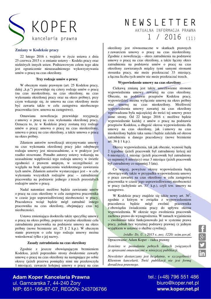 NEWSLETTER AKTUALNA INFORMACJA PRAWNA 1 / 2016 Zmiany w Kodeksie pracy 22 lutego 2016 r. wejdzie w życie ustawa z dnia 25 czerwca 2015 r. o zmianie ustawy – Kodeks pracy oraz niektórych innych ustaw. Podstawowym celem tego aktu jest ograniczenie nieuzasadnionego wykorzystywania umów o pracę na czas określony. Trzy rodzaje umów o pracę W obecnym stanie prawnym (art. 25 Kodeksu pracy, dalej „k.p.”) przewiduje się cztery rodzaje umów o pracę (na czas nieokreślony, na czas określony, na czas wykonania określonej pracy oraz na okres próbny), przy czym wskazuje się, że umowa na czas określony może być zawarta także w celu zastępstwa nieobecnego pracownika (tzw. umowa na zastępstwo). Omawiana nowelizacja przewiduje rezygnację z umowy o pracę na czas wykonania określonej pracy. Oznacza to, że w Kodeksie pracy zostaną trzy rodzaje umów o pracę: umowa o pracę na czas nieokreślony, umowa o pracę na czas określony, a także umowa o pracę na okres próbny. Zdaniem autorów nowelizacji utrzymywanie umowy na czas wykonania określonej pracy jako odrębnego rodzaju umowy jest nieuzasadnione, a w praktyce jest rzadko stosowane. Ponadto autorzy ustawy wskazują na uzasadnione wątpliwości tego rodzaju umowy w świetle zgodności z prawem unijnym, w szczególności ze względu na brak ograniczenia wielokrotnego zawierania tych umów. Zdaniem autorów wystarczające jest – w celu wykonania wszystkich rodzajów prac – zatrudnienie pracownika na podstawie jednego z trzech pozostałych rodzajów umów o pracę. Nadal natomiast możliwe będzie zawieranie umów o pracę na czas określony w celu zastępstwa pracownika w czasie jego usprawiedliwionej nieobecności w pracy. Pracodawca wciąż będzie mógł zatrudnić innego pracownika na czas określony, obejmujący czas tej nieobecności. Ustawa zmieniająca dookreśla także specyfikę umowy o pracę na okres próbny, poprzez wyraźne określenie celu zatrudnienia pracownika na podstawie umowy na okres próbny (nowe brzmienie art. 25 § 2 k.p.). W obecnym stanie prawnym o celu tego rodzaju umowy można wnioskować tylko z jej nazwy. Zasady zatrudniania na czas określony Zgodnie z jeszcze obowiązującym brzmieniem Kodeksu, jeżeli poprzednio strony dwukrotnie zawarły umowę o pracę na czas określony na następujące po sobie okresy (jeżeli przerwa pomiędzy nimi nie przekroczyła 1 miesiąca), zawarcie kolejnej umowy o pracę na czas (11) określony jest równoznaczne w skutkach prawnych z zawarciem umowy o pracę na czas nieokreślony. Zgodnie z nowelizacją – okres zatrudnienia na podstawie umowy o pracę na czas określony, a także łączny okres zatrudnienia na podstawie umów o pracę na czas określony zawieranych między tymi samymi stronami stosunku pracy, nie może przekraczać 33 miesięcy, a łączna liczba tych umów nie może przekraczać trzech. Wypowiedzenie umowy na czas określony Ciekawą zmianą jest także umożliwienie stronom wypowiedzenia umowy zawartej na czas określony. Obecnie, na podstawie przepisów Kodeksu pracy, wypowiedzieć można wyłącznie umowę na okres próbny oraz umowę na czas nieokreślony. Możliwość wypowiedzenia umowy zawartej na czas określony wprowadzana była najczęściej do treści tej umowy przez same strony. Od 22 lutego 2016 r. możliwe będzie wypowiedzenie każdej z umów o pracę na podstawie przepisów Kodeksu, a długość okresu wypowiedzenia dla umowy na czas określony, jak i umowy na czas nieokreślony będzie taka sama i będzie zależała od okresu zatrudnienia u danego pracodawcy (nowe brzmienie art. 36 § 1 k.p.). Okresy wypowiedzenia, tak jak obecnie, wynosić będą 2 tygodnie (jeżeli pracownik był zatrudniony krócej niż 6 miesięcy), 1 miesiąc (jeżeli pracownik był zatrudniony co najmniej 6 miesięcy) oraz 3 miesiące (jeżeli pracownik był zatrudniony co najmniej 3 lata). Co więcej, powyższe okresy wypowiedzenia będą obowiązywały także w przypadku wypowiedzenia umowy o prace zawartej na czas określony w celu zastępstwa pracownika w czasie jego usprawiedliwionej nieobecności w pracy (uchylenie art. 331 k.p.), czyli tzw. umowy na zastępstwo. W Kodeksie pracy znajdzie się także nowy art. 362, zgodnie z którym w związku z wypowiedzeniem pracodawca będzie mógł zwolnić pracownika z obowiązku świadczenia pracy do upływu okresu wypowiedzenia. W okresie tego zwolnienia pracownik zachowa prawo do wynagrodzenia. W ramach wyjaśnienia – zwolnienie takie funkcjonowało już w systemie prawa pracy, jednak bez wyraźnej podstawy prawnej (z jednym wyjątkiem w ustawie o służbie cywilnej). źródło: Dz. U. z 2015 r., poz. 1220; sejm.gov.pl. Opracowanie: Adam Koper – radca prawny Jesteśmy w posiadaniu pełnych danych związanych ze sprawami omawianymi w niniejszej publikacji. Newsletter dostarczany jest bezpłatnie, w szczególności Klientom kancelarii. Treść publikacji nie jest formą doradztwa prawnego.
