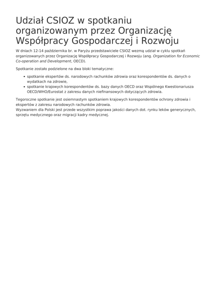 Udział CSIOZ w spotkaniu organizowanym przez Organizację Współpracy Gospodarczej i Rozwoju W dniach 12-14 października br. w Paryżu przedstawiciele CSIOZ wezmą udział w cyklu spotkań organizowanych przez Organizację Współpracy Gospodarczej i Rozwoju (ang. Organization for Economic Co-operation and Development, OECD). Spotkanie zostało podzielone na dwa bloki tematyczne: spotkanie ekspertów ds. narodowych rachunków zdrowia oraz korespondentów ds. danych o wydatkach na zdrowie, spotkanie krajowych korespondentów ds. bazy danych OECD oraz Wspólnego Kwestionariusza OECD/WHO/Eurostat z zakresu danych niefinansowych dotyczących zdrowia. Tegoroczne spotkanie jest osiemnastym spotkaniem krajowych korespondentów ochrony zdrowia i ekspertów z zakresu narodowych rachunków zdrowia. Wyzwaniem dla Polski jest przede wszystkim poprawa jakości danych dot. rynku leków generycznych, sprzętu medycznego oraz migracji kadry medycznej.