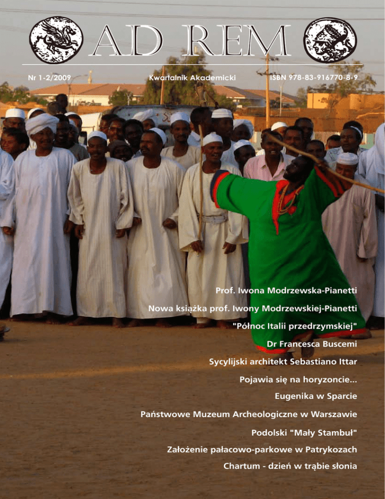 Nr 1-2/2009 Kwartalnik Akademicki ISBN 978-83-916770-8-9 Prof. Iwona Modrzewska-Pianetti Nowa książka prof. Iwony Modrzewskiej-Pianetti "Północ Italii przedrzymskiej" Dr Francesca Buscemi Sycylijski architekt Sebastiano Ittar Pojawia się na horyzoncie... Eugenika w Sparcie Państwowe Muzeum Archeologiczne w Warszawie Podolski "Mały Stambuł" Założenie pałacowo-parkowe w Patrykozach Chartum - dzień w trąbie słonia SPIS TREŚCI Gesta et Homines : Kończy się kolejny rok akademicki na naszym Uniwersytecie. Jak zwykle archeolodzy prowadzą już wykopaliska w wielu krajach, historycy sztuki przebywają na badaniach terenowych w Polsce i zagranicą. Biblioteki pustoszeją z dnia na dzień. Odbywają się za to liczne egzaminy magisterskie i obrony doktorskie. Jest tylko jeden ewenement. W tym właśnie momencie wychodzi pierwszy tegoroczny numer Kwartalnika Akademickiego AD REM - pisma, które studenci i pracownicy dostaną do rąk z początkiem nowego roku akademickiego. Będzie to miła niespodzianka dla wielu! W poszczególnych działach zaprezentowano sylwetki badaczy, recenzje prac naukowych, streszczenia wykładów, artykuły poświęcone muzealnictwu, sztuce i historii starożytnej, jak też założeniu pałacowemu. Nie zabrakło również sprawozdań z podróży – tym razem na Ukrainę i do Sudanu. Zachęcam więc studentów i kolegów z Wydziału Historycznego UW do lektury i współpracy z redakcją! Przypomnę tylko jako stary profesor, że w roku 1986 – gdy pełniłem funkcję prodziekana - otrzymałem od ówczesnego dziekana Juliusza Łukasiewicza zadanie przygotowania założeń dla pracowni architektonicznej studium projektowego przekształcenia Gmachu Szkoły Głównej (wówczas Wydziału Biologii) dla pomieszczenia dwóch Instytutów: Archeologii i Historii Sztuki. Projekty te nie zostały zrealizowane. W tamtych latach prace budowlane trwały długo, a poziom materiałów i wykonawstwa był bardzo niski. Kilka lat temu powiększony osobowo Instytut Archeologii uzyskał nowy gmach w całości, z czego i ja się cieszę. Mam nadzieję na owocną współpracę i większą integrację dyscyplin reprezentowanych na naszym Wydziale. Do tego celu zmierza również Kwartalnik Akademicki AD REM, który sprzyja nawiązaniu kontaktów między przedstawicielami różnych specjalizacji, co prowadzi do pogłębionych wyników badań. prof. Juliusz A. Chrościcki Patronat honorowy: Prof. Iwona Modrzewska-Pianetti dr Tomasz Scholl Nowa książka prof. Iwony Modrzewskiej-Pianetti prof. Andrzej Buko "Północ Italii przedrzymskiej" prof. Iwona Modrzewska-Pianetti Dr Francesca Buscemi prof. Iwona Modrzewska-Pianetti Sycylijski architekt Sebastiano Ittar dr Francesca Buscemi Archeologia : Pojawia się na horyzoncie... Piotr Czerkwiński Historia : Rada Naukowa: Prof. Zbigniew Bania Prof. Andrzej Buko Prof. Juliusz A. Chrościcki Prof. Piotr Dyczek Prof. Iwona Modrzewska-Pianetti Prof. Ewa Wipszycka-Bravo Cennik reklam i ogłoszeń: 1/3 str. (58 mm x 258 mm) - 650 zł II lub III str. okładki (kolor) - 2000 zł 2 4 5 7 8 9 Eugenika w Sparcie 11 Państwowe Muzeum Archeologiczne w Warszawie 12 Błażej Popławski Halina Czubaszek Artes : Podolski "Mały Stambuł" 15 „Założenie pałacowo-parkowe w Patrykozach 19 Chartum - dzień w trąbie słonia 21 Ewa Korpysz Joanna Czarnocka Mirabilia Mundi : Paulina Komar Kwartalnik Akademicki AD REM nr 1-2/2009 Wydawca: Ośrodek Badań nad Antykiem Europy Południowo-Wschodniej UW ul. Krakowskie Przedmieście 32 00-927 Warszawa e-mail: [email protected] 3 Zespół redakcyjny: Redaktor Naczelny – Piotr Sypczuk Redaktorzy Działów: Gesta et Homines – Joanna Lasek Archeologia – Piotr Sypczuk Historia – Błażej Popławski Artes – Piotr Lasek Mirabilia Mundi – Monika Rubach Skład: Łukasz Celiński Druk: Autograf-Druk 1/2 str. (180 mm x 128 mm) - 900 zł IV str. okładki (kolor) - 2500 zł Redakcja nie zwraca materiałów nie zamówionych oraz zastrzega sobie prawo do redagowania nadesłanych artykułów. Kopiowanie i rozpowszechnianie publikowanych artykułów wymaga zgody redaktora naczelnego i autora tekstu. Wydanie publikacji dofinansowała Fundacja Uniwersytetu Warszawskiego Rada Konsultacyjna ds. Studenckiego Ruchu Naukowego UW cała str. (180 mm x 260 mm) - 1500 zł AD REM 1-2/2009 GESTA ET HOMINes Prof. Iwona Modrzewska-Pianetti dr Tomasz Scholl Obecną Panią Profesor Iwonę ModrzewskąPianetti miałem przyjemność poznać w październiku 1969 r., kiedy rozpoczęliśmy studia na I roku archeologii śródziemnomorskiej w ówczesnej Katedrze Archeologii Śródziemnomorskiej na Wydziale Historycznym Uniwersytetu Warszawskiego. Już na studiach zainteresowania naukowe Iwony Modrzewskiej skierowały się ku rzymskiej kulturze materialnej. Jej obroniona w 1974 r. praca magisterska na temat lampek pochodzących z polskich wykopalisk w Palmyrze, powstała pod kierunkiem prof. Anny Sadurskiej - wybitnej znawczyni kultury Imperium Rzymskiego. Praca doktorska, napisana także pod naukowym kierownictwem prof. Anny Sadurskiej, dotyczyła ikonologii lampek syro-palestyńskich. Podejmując pracę w dawnym Instytucie Historii Kultury Materialnej Polskiej Akademii Nauk w Warszawie związała się z badaniami geofizycznymi i z Włochami. Italii starożytnej, ale także i współczesnej, pozostała wierna do dzisiaj. Z czasem poszerzyła zakres terytorialny swoich zainteresowań o Hiszpanię. Tym terenom jak i swoim zainteresowaniom naukowym (lampki, amfory, wraki antycznych statków, handel) poświęca szczególną uwagę do dnia dzisiejszego. W 1995 r. Wydział Historyczny Uniwersytetu Warszawskiego nadał Jej tytuł doktora nauk humanistycznych na podstawie książki dotyczącej amfor iberyjskich z rejonu Veneto. Iwona Modrzewska-Pianetti jest także autorką wielu książek (w tym tak niesłychanie potrzebnych w dydaktyce podręczników akademickich) dotyczących jej ukochanych dziedzin zainteresowań. Kilkadziesiąt artykułów opubli