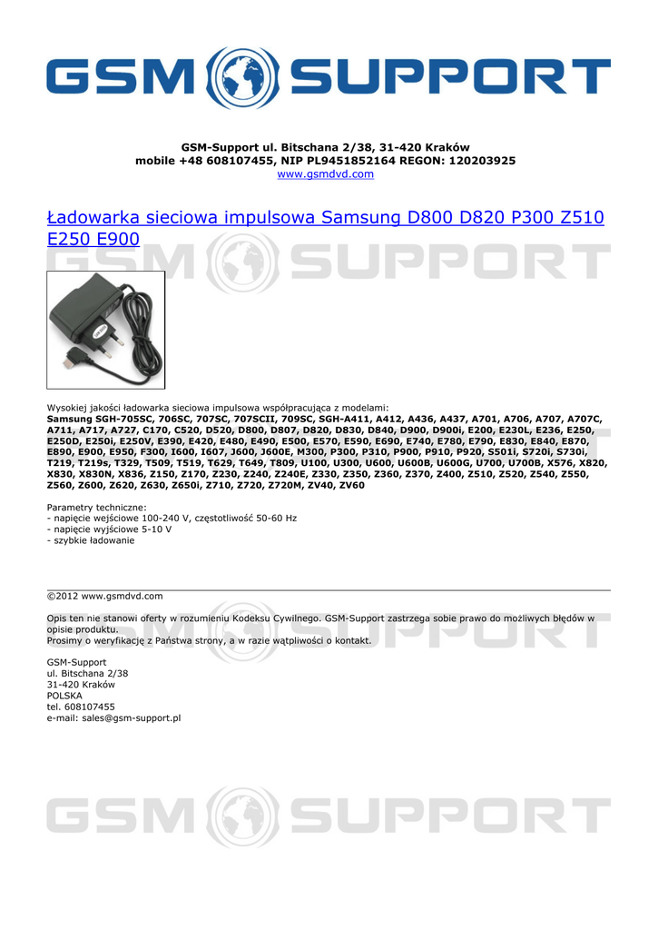 GSM-Support ul. Bitschana 2/38, 31-420 Kraków mobile +48 608107455, NIP PL9451852164 REGON: 120203925 www.gsmdvd.com Ładowarka sieciowa impulsowa Samsung D800 D820 P300 Z510 E250 E900 Wysokiej jakości ładowarka sieciowa impulsowa współpracująca z modelami: Samsung SGH-705SC, 706SC, 707SC, 707SCII, 709SC, SGH-A411, A412, A436, A437, A701, A706, A707, A707C, A711, A717, A727, C170, C520, D520, D800, D807, D820, D830, D840, D900, D900i, E200, E230L, E236, E250, E250D, E250i, E250V, E390, E420, E480, E490, E500, E570, E590, E690, E740, E780, E790, E830, E840, E870, E890, E900, E950, F300, I600, I607, J600, J600E, M300, P300, P310, P900, P910, P920, S501i, S720i, S730i, T219, T219s, T329, T509, T519, T629, T649, T809, U100, U300, U600, U600B, U600G, U700, U700B, X576, X820, X830, X830N, X836, Z150, Z170, Z230, Z240, Z240E, Z330, Z350, Z360, Z370, Z400, Z510, Z520, Z540, Z550, Z560, Z600, Z620, Z630, Z650i, Z710, Z720, Z720M, ZV40, ZV60 Parametry techniczne: - napięcie wejściowe 100-240 V, częstotliwość 50-60 Hz - napięcie wyjściowe 5-10 V - szybkie ładowanie ©2012 www.gsmdvd.com Opis ten nie stanowi oferty w rozumieniu Kodeksu Cywilnego. GSM-Support zastrzega sobie prawo do możliwych błędów w opisie produktu. Prosimy o weryfikację z Państwa strony, a w razie wątpliwości o kontakt. GSM-Support ul. Bitschana 2/38 31-420 Kraków POLSKA tel. 608107455 e-mail: [email protected] Powered by TCPDF (www.tcpdf.org)