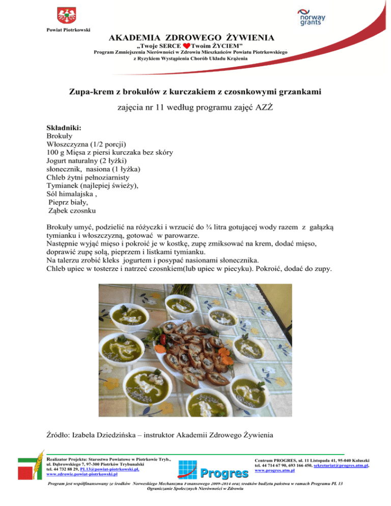 Powiat Piotrkowski AKADEMIA ZDROWEGO ŻYWIENIA „Twoje SERCE Twoim ŻYCIEM” Program Zmniejszenia Nierówności w Zdrowiu Mieszkańców Powiatu Piotrkowskiego z Ryzykiem Wystąpienia Chorób Układu Krążenia Zupa-krem z brokułów z kurczakiem z czosnkowymi grzankami zajęcia nr 11 według programu zajęć AZŻ Składniki: Brokuły Włoszczyzna (1/2 porcji) 100 g Mięsa z piersi kurczaka bez skóry Jogurt naturalny (2 łyżki) słonecznik, nasiona (1 łyżka) Chleb żytni pełnoziarnisty Tymianek (najlepiej świeży), Sól himalajska , Pieprz biały, Ząbek czosnku Brokuły umyć, podzielić na różyczki i wrzucić do ¾ litra gotującej wody razem z gałązką tymianku i włoszczyzną, gotować w parowarze. Następnie wyjąć mięso i pokroić je w kostkę, zupę zmiksować na krem, dodać mięso, doprawić zupę solą, pieprzem i listkami tymianku. Na talerzu zrobić kleks jogurtem i posypać nasionami słonecznika. Chleb upiec w tosterze i natrzeć czosnkiem(lub upiec w piecyku). Pokroić, dodać do zupy. Źródło: Izabela Dziedzińska – instruktor Akademii Zdrowego Żywienia Realizator Projektu: Starostwo Powiatowe w Piotrkowie Tryb., ul. Dąbrowskiego 7, 97-300 Piotrków Trybunalski tel. 44 732 88 29, [email protected], www.zdrowie.powiat-piotrkowski.pl Centrum PROGRES, ul. 11 Listopada 41, 95-040 Koluszki tel. 44 714 67 90, 693 166 450, [email protected], www.progres.atm.pl Program jest współfinansowany ze środków Norweskiego Mechanizmu Finansowego 2009-2014 oraz środków budżetu państwa w ramach Programu PL 13 Ograniczanie Społecznych Nierówności w Zdrowiu Powiat Piotrkowski AKADEMIA ZDROWEGO ŻYWIENIA „Twoje SERCE Twoim ŻYCIEM” Program Zmniejszenia Nierówności w Zdrowiu Mieszkańców Powiatu Piotrkowskiego z Ryzykiem Wystąpienia Chorób Układu Krążenia Słonecznik dostarcza nienasyconych kwasów tłuszczowych przede wszystkim z grupy omega 6 (co przy niskiej zawartości kwasów omega 3 w słoneczniku stanowi jego lekką wadę). Kwasy omega są niezbędne do odbudowywania błon komórkowych wszystkich komórek ciała. Nieprażone ziarna posiadają w składzie dużą ilość fitosteroli - roślinnych sterydów obniżających poziom cholesterolu we krwi i chroniących przed chorobami serca i zapobiegających prostacie. Choć ziarna słonecznika mają dużo kalorii (ok. 600 kcal w 100 gramach produktu jadalnego), nie grozi przybieraniem na wadze, gdyż na tą ilość wpływają zdrowe tłuszcze i niskoglikemiczne węglowodany, ponadto tłuszcz ze słonecznika ma dużą wartość sytną, a więc nie zjemy go dużo. Realizator Projektu: Starostwo Powiatowe w Piotrkowie Tryb., ul. Dąbrowskiego 7, 97-300 Piotrków Trybunalski tel. 44 732 88 29, [email protected], www.zdrowie.powiat-piotrkowski.pl Centrum PROGRES, ul. 11 Listopada 41, 95-040 Koluszki tel. 44 714 67 90, 693 166 450, [email protected], www.progres.atm.pl Program jest współfinansowany ze środków Norweskiego Mechanizmu Finansowego 2009-2014 oraz środków budżetu państwa w ramach Programu PL 13 Ograniczanie Społecznych Nierówności w Zdrowiu