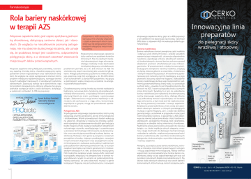 Farmakoterapia Farmakoterapia Rola bariery naskórkowej w terapii AZS Atopowe zapalenie skóry jest często spotykaną jednostką chorobową, dotyczącą zarówno dzieci, jak i dorosłych. Ze względu na niecałkowicie poznaną patogenezę, nie ma obecnie skutecznego leczenia, ale uznaje Pacjentom z AZS zazwyczaj towarzyszą inne choroby atopowe – często w pierwszych latach życia obserwuje się alergię pokarmową, następnie alergiczny nieżyt nosa czy astmę. się, że podstawą terapii jest codzienna, odpowiednia pielęgnacja skóry, a w okresach zaostrzeń miejscowych leków przeciwzapalnych. Atopowe zapalenie skóry (AZS) jest przewlekłą, nawrotową, zapalną chorobą skóry, charakteryzującą się występowaniem zmian wypryskowych oraz nawrotowym świądem. Ze względu na częste występowanie stanowi istotny problem medyczno-epidemiologiczny, wymaga również dużych nakładów finansowych z narodowych systemów zdrowotnych. Zazwyczaj rozwija się w dzieciństwie, stąd też problem terapeutyczny dotyczy głównie tej grupy, swiatfarmacji.pdf 21-06-13 13:47:59 jednakże występuje także u osób dorosłych, dotykając, w zależności od badań, 2–10% tej populacji. Rozpoznanie atopowego zapalenia stosowanie skóry ustala się na podstawie kryteriów klinicznych. Nie ma żadnych markerów laboratoryjnych tego schorzenia, dlatego niekiedy może dochodzić do błędnej diagnozy, a dodatkowym problemem jest fakt, że u ok. 2/3 chorych na AZS nie stwierdza się atopii rozumianej jako uczulenie IgE-zależne. Alergia pokarmowa (uczulenie na mleko krowie, jajo, pszenicę, soję itd.) występuje u ok. 33–63% dzieci z tym schorzeniem. U ponad 90% pacjentów z tej grupy w późniejszym wieku rozwija się uczulenie na alergeny powietrznopochodne. Charakterystyczną cechą choroby są również nadkażenia bakteryjne i wirusowe skóry, tendencja do przebarwień, niekiedy bliznowacenia, a największy klinicznie problem stanowią kłopoty ze snem, wynikające z uporczywego świądu. Zaburzenia snu mają istotne implikacje w odniesieniu do zachowania w ciągu dnia, koncentracji, współżycia w grupie, mogą też powodować upośledzenie wzrostu. Patogeneza AZS W patogenezie atopowego zapalenia skóry istotną rolę odgrywają czynniki genetyczne, ale też immunologiczne i środowiskowe. Wyniki prowadzonych badań wskazują na udział ok. 40 genów w rozwoju tej choroby, aczkolwiek największe zainteresowanie wzbudził gen kodujący białko filagrynę (FLG), będące niezbędnym składnikiem naturalnego czynnika nawilżającego i uczestniczące w procesie terminalnego różnicowania się keratynocytów oraz warunkujące prawidłową budowę bariery naskórkowej. Mutacje w tym genie są związane z wczesnym początkiem choroby, cięższym przebiegiem, rozwojem innych schorzeń atopowych oraz szczególnymi cechami fenotypowymi, zwłaszcza suchą skórą i nadmiernym pobruzdowaniem dłoniowej powierzchni rąk. O licznych związkach pomiędzy czynnikami genetycznymi i środowiskowymi świadczy m.in. fakt, że obecność mutacji genu FLG trzykrotnie zwiększa ryzyko rozwoju AZS, natomiast w przypadku ekspozycji na alergeny kota w okresie noworodkowym ryzyko to wzrasta aż jedenastokrotnie. Należy zaznaczyć, że sama obecność mutacji w genie kodującym filagrynę nie jest jednoznaczna z rozwojem C M Y CM MY CY CMY K 14 atopowego zapalenia skóry, gdyż aż u 40% populacji z tym defektem nie obserwuje się choroby, natomiast 50% dzieci z objawami AZS nie wykazuje defektu genetycznego. Bariera naskórkowa Bariera naskórkowa stanowi zewnętrzną część naskórka i odgrywa wiele istotnych funkcji – przede wszystkim zapewnia jego integralność, utrzymuje odpowiednie nawilżenie, zapobiega wnikaniu szkodliwych substancji środowiskowych, stanowi barierę ochronną przed działaniem promieni ultrafioletowych oraz mikroorganizmów. W przestrzeniach między korneocytami, budującymi zewnętrzne warstwy naskórka, znajdują się lipidy, złożone głównie z ceramidów, cholesterolu i wolnych kwasów tłuszczowych. W warstwie tej syntetyzowany jest naturalny czynnik nawilżający, a w jego powstaniu kluczowy udział ma filagryna. Uszkodzenie bariery naskórkowej skutkuje więc bezpośrednio nadmierną przeznaskórkową utratą wody, co powoduje suchość skóry – zjawisko to jest charakterystyczne dla chorych na AZS, nawet w przypadku braku czynnych zmian klinicznych. Świadczy to o tym, że uszkodzenie bariery naskórkowej jest najbardziej charakterystyczną cechą atopowego zapalenia skóry, dlatego dbanie o jej odbudowę stanowi najważniejszy cel leczenia tego schorzenia, a być może jest też najskuteczniejszą formą prewencji nawrotów i rozwoju zapalenia. Zwiększona przeznaskórkowa utrata wody jest zjawiskiem obecnym zarówno u chorych posiadających mutację w genie filagryny, jak i u osób bez defektu genetycznego, aczkolwiek w przypadku mutacji jest istotnie bardziej nasilona. U pacjentów z AZS obserwuje się również zaburzenie składu i ilości lipidów naskórkowych, szczególnie mniejszą ilość ceramidów, zwłaszcza w obrębie skóry zmienionej chorobowo. Nadmierne przesuszenie skóry prowadzi do rozwoju świądu, co z kolei implikuje odruch drapania, w wyniku czego dochodzi do dalszego mechanicznego uszkadzania naskórka, zwiększonej przepuszczalności bariery naskórkowej dla czynników środowiskowych (alergenów, drobnoustrojów, czynników toksycznych) i rozwoju zapalenia. Alergeny, po przejściu przez barierę naskórkową, wchodzą w interakcje z komórkami prezentującymi antygen i inicjują odpowiedź immunologiczną. Należy również wspomnieć, że przeciwbakteryjna funkcja bariery naskórkowej zależy od jej odpowiedniego pH oraz od produkcji naturalnych białek przeciwbakteryjnych. Na skórze osób zdrowych obserwuje się wzrost bakterii komensalnych, które hamują rozrost szczepów pato15 Farmakoterapia gennych, np. gronkowca złocistego. U chorych n