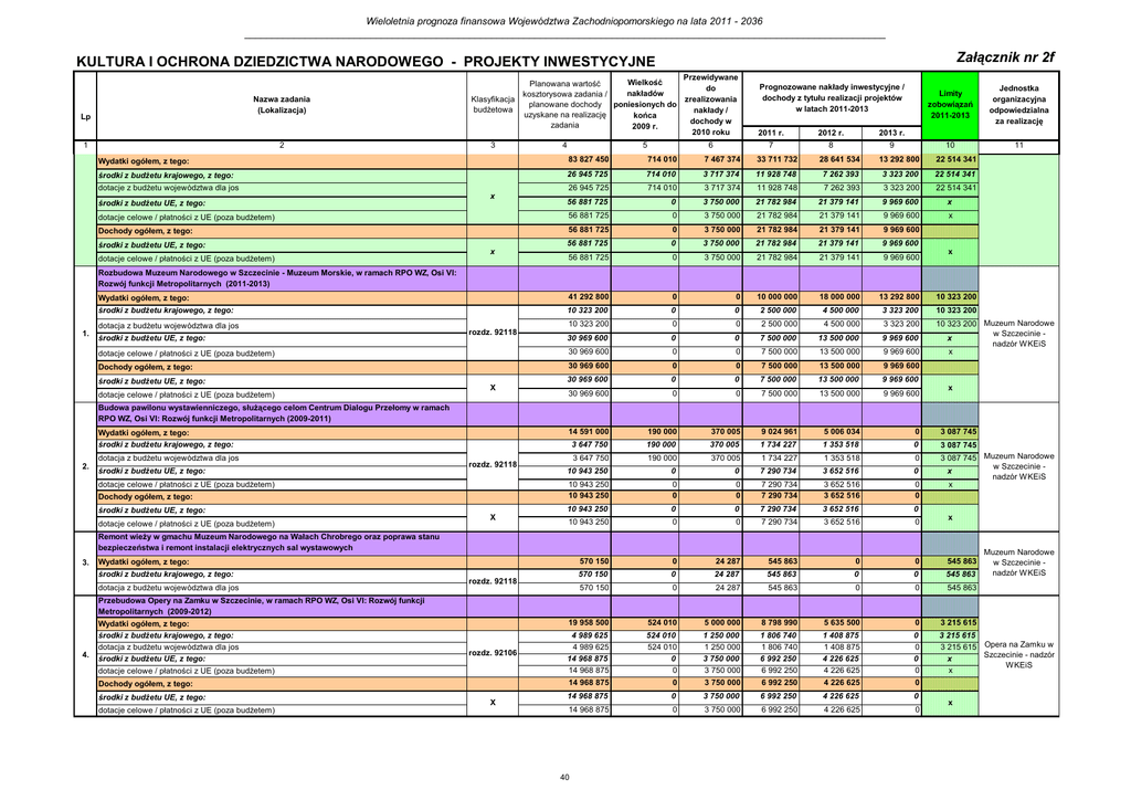 Wieloletnia prognoza finansowa Województwa Zachodniopomorskiego na lata 2011 - 2036 _____________________________________________________________________________________________________________________ Załącznik nr 2f KULTURA I OCHRONA DZIEDZICTWA NARODOWEGO - PROJEKTY INWESTYCYJNE Lp Nazwa zadania (Lokalizacja) Klasyfikacja budŜetowa 2 3 1 Przewidywane Wielkość Planowana wartość do nakładów kosztorysowa zadania / zrealizowania planowane dochody poniesionych do nakłady / uzyskane na realizację końca dochody w zadania 2009 r. 2010 roku 4 5 6 Prognozowane nakłady inwestycyjne / dochody z tytułu realizacji projektów w latach 2011-2013 2011 r. 2012 r. 7 8 Limity zobowiązań 2011-2013 Jednostka organizacyjna odpowiedzialna za realizację 10 11 2013 r. 9 Wydatki ogółem, z tego: 83 827 450 714 010 7 467 374 33 711 732 28 641 534 13 292 800 22 514 341 środki z budŜetu krajowego, z tego: 26 945 725 714 010 3 717 374 11 928 748 7 262 393 3 323 200 22 514 341 dotacje z budŜetu województwa dla jos 26 945 725 714 010 3 717 374 11 928 748 7 262 393 3 323 200 22 514 341 56 881 725 0 3 750 000 21 782 984 21 379 141 9 969 600 x dotacje celowe / płatności z UE (poza budŜetem) 56 881 725 0 3 750 000 21 782 984 21 379 141 9 969 600 x Dochody ogółem, z tego: 56 881 725 0 3 750 000 21 782 984 21 379 141 9 969 600 56 881 725 0 3 750 000 21 782 984 21 379 141 9 969 600 56 881 725 0 3 750 000 21 782 984 21 379 141 9 969 600 środki z budŜetu UE, z tego: środki z budŜetu UE, z tego: dotacje celowe / płatności z UE (poza budŜetem) x x x Rozbudowa Muzeum Narodowego w Szczecinie - Muzeum Morskie, w ramach RPO WZ, Osi VI: Rozwój funkcji Metropolitarnych (2011-2013) 1. Wydatki ogółem, z tego: 41 292 800 0 0 10 000 000 18 000 000 13 292 800 środki z budŜetu krajowego, z tego: 10 323 200 0 0 2 500 000 4 500 000 3 323 200 10 323 200 dotacja z budŜetu województwa dla jos 10 323 200 0 0 2 500 000 4 500 000 3 323 200 10 323 200 Muzeum Narodowe w Szczecinie x nadzór WKEiS x środki z budŜetu UE, z tego: rozdz. 92118 30 969 600 0 0 7 500 000 13 500 000 9 969 600 dotacje celowe / płatności z UE (poza budŜetem) 30 969 600 0 0 7 500 000 13 500 000 9 969 600 Dochody ogółem, z tego: 30 969 600 0 0 7 500 000 13 500 000 9 969 600 środki z budŜetu UE, z tego: 30 969 600 0 0 7 500 000 13 500 000 9 969 600 30 969 600 0 0 7 500 000 13 500 000 9 969 600 dotacje celowe / płatności z UE (poza budŜetem) X 10 323 200 x Budowa pawilonu wystawienniczego, słuŜącego celom Centrum Dialogu Przełomy w ramach RPO WZ, Osi VI: Rozwój funkcji Metropolitarnych (2009-2011) Wydatki ogółem, z tego: środki z budŜetu krajowego, z tego: dotacja z budŜetu województwa dla jos 2. środki z budŜetu UE, z tego: rozdz. 92118 dotacje celowe / płatności z UE (poza budŜetem) Dochody ogółem, z tego: środki z budŜetu UE, z tego: dotacje celowe / płatności z UE (poza budŜetem) X 14 591 000 190 000 370 005 9 024 961 5 006 034 0 3 087 745 3 647 750 190 000 370 005 1 734 227 1 353 518 0 3 087 745 3 087 745 Muzeum Narodowe w Szczecinie x nadzór WKEiS x 3 647 750 190 000 370 005 1 734 227 1 353 518 0 10 943 250 0 0 7 290 734 3 652 516 0 10 943 250 10 943 250 0 0 0 0 7 290 734 7 290 734 3 652 516 3 652 516 0 0 10 943 250 0 0 7 290 734 3 652 516 0 10 943 250 0 0 7 290 734 3 652 516 0 570 150 0 24 287 545 863 0 0 545 863 570 150 0 24 287 545 863 0 0 545 863 570 150 0 24 287 545 863 0 0 545 863 x Remont wieŜy w gmachu Muzeum Narodowego na Wałach Chrobrego oraz poprawa stanu bezpieczeństwa i remont instalacji elektrycznych sal wystawowych 3. Wydatki ogółem, z tego: środki z budŜetu krajowego, z tego: dotacja z budŜetu województwa dla jos 4. Przebudowa Opery na Zamku w Szczecinie, w ramach RPO WZ, Osi VI: Rozwój funkcji Metropolitarnych (2009-2012) Wydatki ogółem, z tego: środki z budŜetu krajowego, z tego: dotacja z budŜetu województwa dla jos środki z budŜetu UE, z tego: rozdz. 92118 rozdz. 92106 dotacje celowe / płatności z UE (poza budŜetem) Dochody ogółem, z tego: środki z budŜetu UE, z tego: dotacje celowe / płatności z UE (poza budŜetem) X Muzeum Narodowe w Szczecinie nadzór WKEiS 19 958 500 524 010 5 000 000 8 798 990 5 635 500 0 3 215 615 4 989 625 4 989 625 14 968 875 14 968 875 14 968 875 524 010 524 010 0 0 0 1 250 000 1 250 000 3 750 000 3 750 000 3 750 000 1 806 740 1 806 740 6 992 250 6 992 250 6 992 250 1 408 875 1 408 875 4 226 625 4 226 625 4 226 625 0 0 0 0 0 3 215 615 3 215 615 Opera na Zamku w Szczecinie - nadzór x WKEiS x 14 968 875 0 3 750 000 6 992 250 4 226 625 0 14 968 875 0 3 750 000 6 992 250 4 226 625 0 40 x Wieloletnia prognoza finansowa Województwa Zachodniopomorskiego na lata 2011 - 2036 _____________________________________________________________________________________________________________________ Lp 1 Nazwa zadania (Lokalizacja) Klasyfikacja budŜetowa 2 3 Przewidywane Wielkość Planowana wartość do nakładów kosztorysowa zadania / zrealizowania planowane dochody poniesionych do nakłady / uzyskane na realizację końca dochody w zadania 2009 r. 2010 roku 4 5 6 Prognozowane nakłady inwestycyjne / dochody z tytułu realizacji projektów w latach 2011-2013 2011 r. 2012 r. 2013 r. 7 8 9 Zakup i budowa hali strukturalnej z przeznaczeniem na tymczasową siedzibę Opery na Zamku w Szczecinie (2010 - 2011) 5. Wydatki ogółem, z tego: środki z budŜetu krajowego, z tego: dotacja z budŜetu województwa dla jos rozdz. 92106 Wydatki ogółem, z tego: środki z budŜetu krajowego, z tego: dotacja z budŜetu województwa dla jos 11 2 000 000 5 000 000 0 0 7 000 000 0 2 000 000 5 000 000 0 0 Opera na Zamku w 5 000 000 Szczecinie - nadzór 5 000 000 WKEiS 2 000 000 5 000 000 0 0 5 000 000 415 000 0 73 082 341 918 0 0 415 000 0 73 082 341 918 0 0 Opera na Zamku w 341 918 Szczecinie - nadzór WKEiS 341 918 415 000 0 73 082 341 918 0 0 341 918 Uwaga! Dotacje celowe/płatności z budŜetu UE dla ww. projektów podaje się informacyjnie; nie stanowi