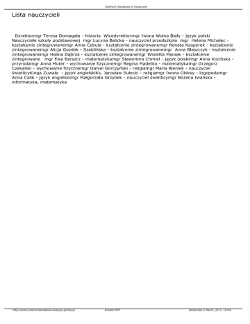 Centrum Oświatowe w Koszycach Lista nauczycieli Dyrektormgr Teresa Domagała - historia Wicedyrektormgr Iwona Wolna Biały - język polski Nauczyciele szkoły podstawowej mgr Lucyna Balicka - nauczyciel przedszkola mgr Helena Michalec kształcenie zintegrowanemgr Anna Cebula - kształcenie zintegrowanemgr Renata Kasperek - kształcenie zintegrowanemgr Alicja Gozdek - Szablińska - kształcenie zintegrowanemgr Anna Błaszczyk - kształcenie zintegrowanemgr Halina Dąbroś - kształcenie zintegrowanemgr Wioletta Maniak - kształcenie zintegrowane mgr Ewa Barszcz - matematykamgr Sławomira Chmiel - język polskimgr Anna Kocińska przyrodamgr Anna Muter - wychowanie fizycznemgr Regina Madetko - matematykamgr Grzegorz Czekalski - wychowanie fizycznemgr Daniel Gorczyński - religiamgr Maria Bieniek - nauczyciel świetlicyKinga Zuwała - język angielskiKs. Jarosław Sułecki - religiamgr Iwona Oleksy - logopedamgr Anna Calik - język angielskimgr Małgorzata Grzybek - nauczyciel świetlicymgr Bożena Iwańska informatyka, matematyka http://www.centrumoswiatowe.koszyce.gmina.pl Kreator PDF Utworzono 2 March, 2017, 19:44