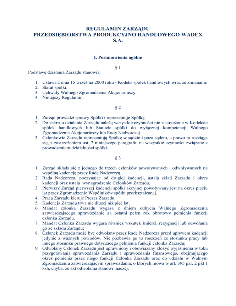 REGULAMIN ZARZĄDU PRZEDSIĘBIORSTWA PRODUKCYJNO HANDLOWEGO WADEX S.A. I. Postanowienia ogólne §1 Podstawę działania Zarządu stanowią: 1. 2. 3. 4. Ustawa z dnia 15 września 2000 roku - Kodeks spółek handlowych wraz ze zmianami. Statut spółki. Uchwały Walnego Zgromadzenia Akcjonariuszy. Niniejszy Regulamin. §2 1. Zarząd prowadzi sprawy Spółki i reprezentuje Spółkę. 2. Do zakresu działania Zarządu należą wszystkie czynności nie zastrzeżone w Kodeksie spółek handlowych lub Statucie spółki do wyłącznej kompetencji Walnego Zgromadzenia Akcjonariuszy lub Rady Nadzorczej. 3. Członkowie Zarządu reprezentują Spółkę w sądzie i poza sądem, a prawo to rozciąga się, z zastrzeżeniem ust. 2 niniejszego paragrafu, na wszystkie czynności związane z prowadzeniem działalności spółki. §3 1. Zarząd składa się z jednego do trzech członków powoływanych i odwoływanych na wspólną kadencję przez Radę Nadzorczą. 2. Rada Nadzorcza, poczynając od drugiej kadencji, ustala skład Zarządu i okres kadencji oraz ustala wynagrodzenie Członków Zarządu. 3. Pierwszy Zarząd pierwszej kadencji spółki akcyjnej powoływany jest na okres pięciu lat przez Zgromadzenie Wspólników spółki przekształcanej. 4. Pracą Zarządu kieruje Prezes Zarządu. 5. Kadencja Zarządu trwa nie dłużej niż pięć lat. 6. Mandat członka Zarządu wygasa z dniem odbycia Walnego Zgromadzenia zatwierdzającego sprawozdanie za ostatni pełen rok obrotowy pełnienia funkcji członka Zarządu. 7. Mandat Członka Zarządu wygasa również wskutek śmierci, rezygnacji lub odwołania go ze składu Zarządu; 8. Członek Zarządu może być odwołany przez Radę Nadzorczą przed upływem kadencji jedynie z ważnych powodów. Nie pozbawia go to roszczeń ze stosunku pracy lub innego stosunku prawnego dotyczącego pełnienia funkcji członka Zarządu; 9. Odwołany Członek Zarządu jest uprawniony i obowiązany złożyć wyjaśnienia w toku przygotowania sprawozdania Zarządu i sprawozdania finansowego, obejmującego okres pełnienia przez niego funkcji Członka Zarządu oraz do udziału w Walnym Zgromadzeniu zatwierdzającym sprawozdania, o których mowa w art. 395 par. 2 pkt 1 ksh, chyba, że akt odwołania stanowi inaczej. 10. Zawieszenie w czynnościach poszczególnych lub wszystkich członków Zarządu może nastąpić z ważnych powodów na mocy uchwały Rady Nadzorczej; 11. Członek Zarządu składa rezygnację Radzie Nadzorczej na piśmie na ręce Przewodniczącego Rady; 12. W przypadku rezygnacji lub odwołania Członka Zarządu ze składu Zarządu w trakcie kadencji, Rada Nadzorcza uzupełnia skład Zarządu o tego Członka Zarządu; 13. Mandat Członka Zarządu powołanego przed upływem danej kadencji Zarządu wygasa równocześnie z wygaśnięciem mandatów pozostałych Członków Zarządu. 14. Członek Zarządu może być odwołany lub zawieszony w czynnościach również przez Walne Zgromadzenie. II. Zakres i zasady działania Zarządu §4 1. W przypadku powołania Zarządu jednoosobowego do składania oświadczeń woli upoważniony jest Prezes Zarządu samodzielnie. W przypadku powołania Zarządu wieloosobowego do składania oświadczeń woli i podpisywania w imieniu spółki upoważniony jest Prezes Zarządu samodzielnie lub pozostali Członkowie Zarządu łącznie albo Członek Zarządu łącznie z Prokurentem. 2. Członek Zarządu ponosi w stosunku do Spółki pełną odpowiedzialność odszkodowawczą i dyscyplinarną za naruszenie rygorów określonych w ust.1 niniejszego paragrafu. §5 Uchwały Zarządu wymagają sprawy określone w statucie i kodeksie spółek handlowych, a w szczególności: ustanowienie i odwołanie Prokury ( wymaga zgody wszystkich Członków Zarządu); udzielanie gwarancji kredytowych i poręczeń majątkowych oraz wystawianie weksli; zbywanie i nabywanie nieruchomości lub udziału w nieruchomości; przyjęcie rocznych planów rzeczowo – finansowych oraz strategicznych planów wieloletnich; 5. zaciąganie kredytów i pożyczek. 6. sprawy, o których rozpatrzenie Zarząd zwraca się do Rady Nadzorczej; 1. 2. 3. 4. III. Zakres indywidualnego działania Członków Zarządu §6 1. Z zastrzeżeniem § 6 poszczególni Członkowie Zarządu uprawnieni i obowiązani są do samodzielnego działania w sprawach opisanych w niniejszym Paragrafie. W zakresie spraw im powierzonych Członkowie Zarządu ponoszą odpowiedzialność wobec Spółki, jak również wobec osób trzecich, chyba że inaczej stanowią bezwzględnie obowiązujące przepisy prawa. 2. Prezes Zarządu - odpowiada za: koordynację i organizację pracy Zarządu, wydawanie wewnętrznych aktów normatywnych, doskonalenie procesów zarządzania, kreowanie i realizowanie polityki ekonomiczno-finansowej zapewniającej spółce płynność finansową i zdolność rozwoju, nadzór nad prowadzonymi przez spółkę ewidencjami zdarzeń gospodarczych w sposób prawidłowy, rzetelny i zgodny z przepisami prawa, sprawozdawczość finansową spółki, rozliczenia z budżetem państwa wynikające z tytułu podatków i innych obciążeń o charakterze podatkowym (z wyłączeniem podatku od osób fizycznych), politykę kadrową i płacową, utrzymanie statusu Zakładu Pracy Chronionej przez spółkę; 3. Członek Zarządu – odpowiada za: organizację procesu produkcyjnego, nadzór nad kontrolą wewnętrzną, windykację należności, nadzorowanie działalności public relation; wyznaczanie celów handlowych spółki i strategii ich osiągania, organizację i standaryzację procesów sprzedaży w spółce; działalność marketingową, badania i analizy rynku, rozwój nowych produktów, realizacja funkcji controllingu oraz systemu informacji zarządczej, nadzór nad obsługą informatyczną spółki; nadzór nad prawidłowym funkcjonowaniem służb bhp, administrowanie danymi osobowymi, nadzór nad pozyskiwaniem nowych klientów dla spółki i utrzymaniem dotychczasowych klientów Spółki, procesami rek