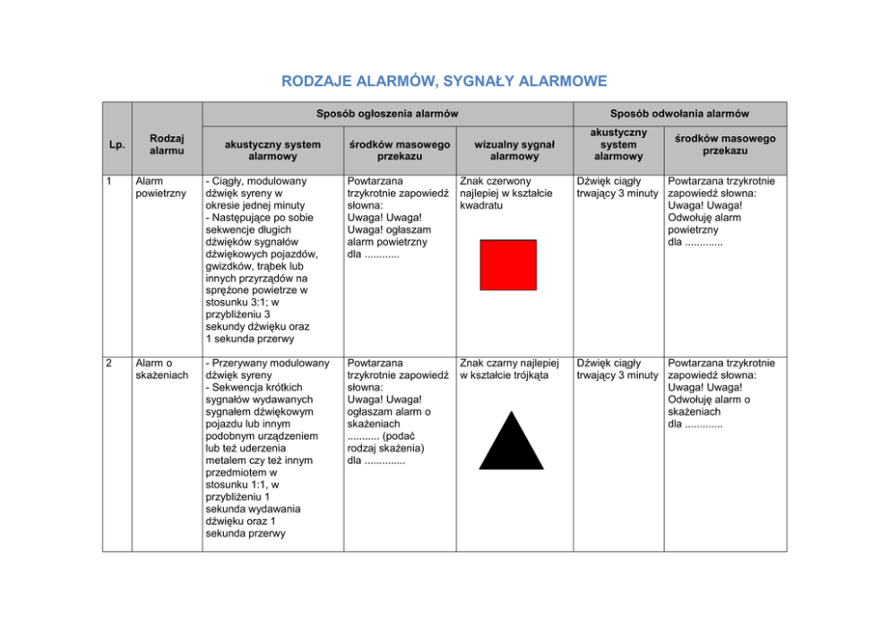 RODZAJE ALARMÓW, SYGNAŁY ALARMOWE