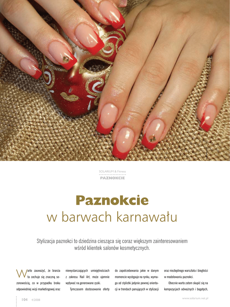 www.studiokreacji.pl SOLARIUM & Fitness PAZNOKCIE Paznokcie w barwach karnawału Stylizacja paznokci to dziedzina ciesząca się coraz większym zainteresowaniem wśród klientek salonów kosmetycznych. W arto zauważyć, że branża niewystarczających umiejętnościach do zapotrzebowania jakie w danym oraz niezbędnego warsztatu i biegłości ta cechuje się znaczną se- z zakresu Nail Art, może ujemnie momencie występuje na rynku, wyma- w modelowaniu paznokci. wpływać na generowane zyski. ga od stylistki jedynie pewnej orienta- Obecnie warto zatem skupić się na cji w trendach panujących w stylizacji kompozycjach odważnych i bogatych, zonowością, co w przypadku braku odpowiedniej wizji marketingowej oraz 104 4/2008 Tymczasem dostosowanie oferty www.solarium.net.pl gdyż w gorącym okresie karnawało- wydaniu, zapewni nutkę oryginal- Umieszczone na odpowiednio przypi- Na koniec warto wspomnieć o wa- wym, to właśnie one będą wiodły prym ności. Ciekawym zatem pomysłem łowanej krzywej C, z pewnością wy- riancie naprawdę spektakularnym. i wzbudzały największe zainteresowa- jest wykonanie końcówki w dowolnie trzymają całonocne szaleństwa i będą Paznokcie typu szpic szturmem wdar- nie wśród klienteli. Celem salonu po- wybranym kolorze – odpowiadają- stanowiły nietuzinkową ozdobę. ły się w łaski branży, w ekspresowym winno być wykorzystanie koniunktury cym zazwyczaj gustowi klientki, jej w celu promocji zdobień oryginalnych preferencjom w zakresie stroju lub i nietypowych, gdyż wśród szerokiego też dostosowanym do konkretnej spektrum zdobniczych możliwości, okazji. Krwisty frencz jest zdobieniem każda z pań znajdzie dla siebie opcję drapieżnym i rzucającym się w oczy, idealną. toteż pozostałe dodatki stosujemy tradycyjnego w minimalnej ilości. Delikatny złoty frencz manicure możemy więc za- lub srebrny element powinien tylko proponować niewielki wzór w kolorze dopełnić całości i stanowić swoistą korespondującym z ulubioną biżuterią „kropkę nad i” oraz uwieńczenie sty- lub konkretną kreacją. Najbezpiecz- lizacji. By zapewnić maksymalnie bo- niejszym rozwiązaniem są uniwersal- Zwolenniczkom tempie wypierając tradycyjne łopatki Przedłużanie paznokci to jednak nie tylko wszechobecny frencz. Coraz większą popularnością cieszą się także paznokcie krystaliczne, i zastępując finezyjne migdałki. Ten wbrew pozorom ogromnie wygodny i poręczny kształt w jednych budzi zachwyt, innych przyprawia o mdłości, jednak nikogo nie pozostawia obojętnym. To zatem doskonała propozycja dla tej rzeszy klientek, które uwielbiają szokować i testować wszelkie nowinki. Skoro stawiamy tu na ekstremalny zwane też szklanymi, lodowymi lub kształt, bezpieczniej nie folgować so- gaty wybór kolorystyczny, należy brać clear. W akrylowy lub żelowy szkielet bie w kwestii kolorów. Tradycyjne po- pod uwagę zarówno kolorowe żele jak wtapiamy w takim przypadku dowol- łączenie czerni i bieli w wydaniu à la w tych tonacjach powinny usatysfak- i akryle, a w razie konieczności łączyć ne ozdoby, które widoczne zarówno Charlie Chaplin, okraszone srebrnymi cjonować nawet najbardziej zacho- oba systemy w tzw. metodę Combo. z wierzchu jak i od spodu wolnego kamieniami i akrylowymi kwiatami ne srebro, złoto i czerń, toteż elementy wawcze z klientek. By efekt był moż- Wśród klientek rekrutujących się brzegu tworzą niepowtarzalny efekt 3D to propozycja niezwykle oryginalna liwie najdelikatniejszy, ozdoby można z grona uczennic i studentek, furorę kolorowego szkła. Możliwości zdob- i efektowna. Klientkom, które zdecy- umieścić jedynie na palcach serdecz- robi jeszcze inna odsłona frencza – nicze są tutaj absolutnie nieograni- dowały się „pójść na całość” można podsunąć jeszcze jedną ciekawą opcję – wyłożenie cyrkoniami spodu paznokci. Tego typu stylizacja to koszt rzędu kilkuset złotych, ale efekt piorunujący! Nasuwa się zatem konkluzja, iż warto wyjść naprzeciw preferencjom klienteli i w miarę możliwości urozmaicać wykonywane stylizacje. Bywalczynie salonów z czasem przyzwyczają się do nowinek z zakresu Nail nych i w typowym miejscu jakim jest końcówka brokatowa. Wybór barw, czone, zależą tylko i wyłącznie od in- smile line. Zatopione pod materiałem ziarnistości i rodzaju połysku jest w tej wencji klientki oraz asortymentu jakim na linii uśmiechu kruszone muszle, materii olbrzymi, zatem wskazanie dysponuje stylistka. W celu osiągnię- bulion, moro, hologramy czy piegu- wariantu kolorystycznego może na- cia subtelnego efektu warto postawić ski będą bardzo ładnie współgrały stręczać nieco trudności mniej zdecy- jednak na pyłek oraz pazłotko – pa- z umieszczonymi na powierzchni cyr- dowanym paniom. Pamiętajmy jednak, zurki szklane same w sobie są na tyle koniami Swarovskiego. Należy jedynie że w tym sezonie modne są wszelkie widowiskowe, że ozdobami warto im pamiętać by solidnie przytwierdzić odcienie fioletu, wrzosu i śliwki, stąd nadać jedynie delikatnego i efeme- kamienie – starannie zalane glossem, warto skierować uwagę klientek w te rycznego charakteru. Niezależnie od będą zdobić nawet miesiąc. właśnie rejony. Błyszcząca końcówka tego jakich akcesoriów stylistka bę- Odchodząc od utartych i szablono- może jednak okazać się zbyt skrom- dzie używała, priorytetem jest dbałość wych wzorów, można wykonać frencz, na dla jej odważnej nosicielki, stąd o zachowanie maksymalnie cienkiej ale nieco odmienny. Wiecznie modna swoisty crême de la crême stanowić linii włosa, bowiem grubość paznokci czerwień zawsze wygląda elegancko może nowość w branży – dużego roz- nie powinna przekroczyć jednego mi- na paznokciach, zaś użyta w innym miaru cyrkonie w owalnym kształcie. limetra. www.solarium.net.pl Art i domagając się kolejnych zdobień, będą szturmowały gabinety już nie tylko z oka
