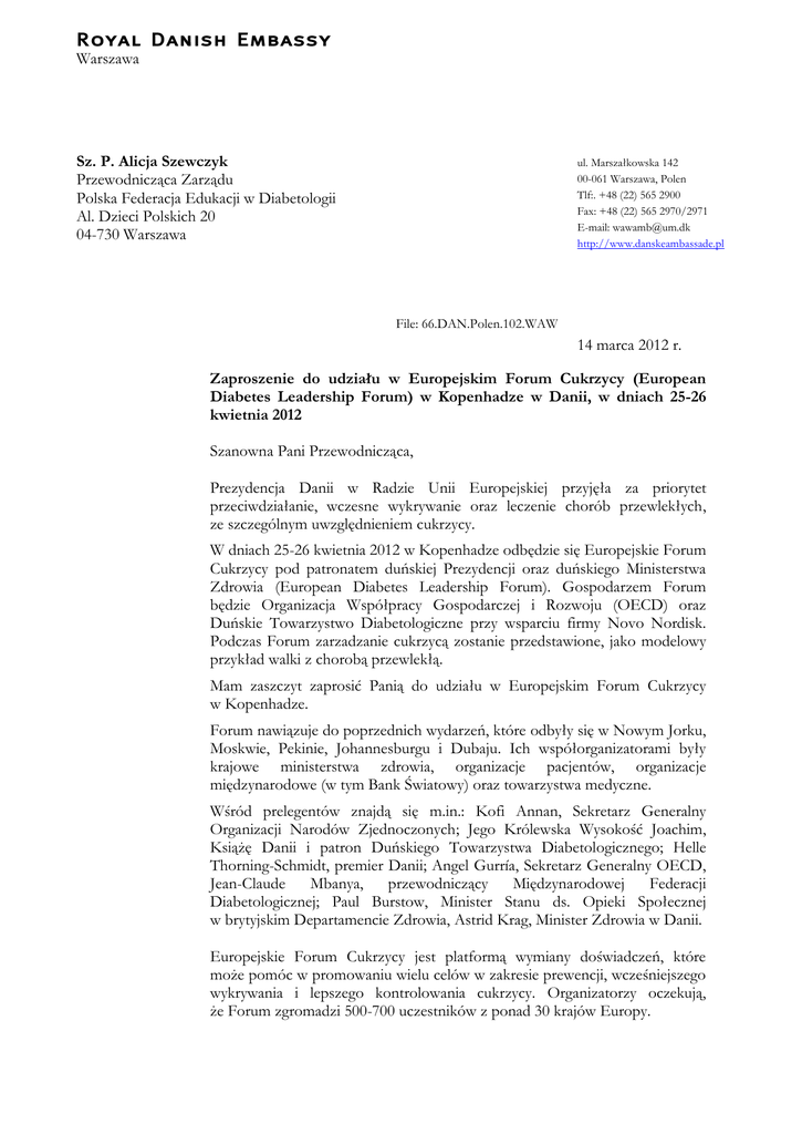 Warszawa Sz. P. Alicja Szewczyk Przewodnicząca Zarządu Polska Federacja Edukacji w Diabetologii Al. Dzieci Polskich 20 04-730 Warszawa ul. Marszałkowska 142 00-061 Warszawa, Polen Tlf:. +48 (22) 565 2900 Fax: +48 (22) 565 2970/2971 E-mail: [email protected] http://www.danskeambassade.pl File: 66.DAN.Polen.102.WAW 14 marca 2012 r. Zaproszenie do udziału w Europejskim Forum Cukrzycy (European Diabetes Leadership Forum) w Kopenhadze w Danii, w dniach 25-26 kwietnia 2012 Szanowna Pani Przewodnicząca, Prezydencja Danii w Radzie Unii Europejskiej przyjęła za priorytet przeciwdziałanie, wczesne wykrywanie oraz leczenie chorób przewlekłych, ze szczególnym uwzględnieniem cukrzycy. W dniach 25-26 kwietnia 2012 w Kopenhadze odbędzie się Europejskie Forum Cukrzycy pod patronatem duńskiej Prezydencji oraz duńskiego Ministerstwa Zdrowia (European Diabetes Leadership Forum). Gospodarzem Forum będzie Organizacja Współpracy Gospodarczej i Rozwoju (OECD) oraz Duńskie Towarzystwo Diabetologiczne przy wsparciu firmy Novo Nordisk. Podczas Forum zarzadzanie cukrzycą zostanie przedstawione, jako modelowy przykład walki z chorobą przewlekłą. Mam zaszczyt zaprosić Panią do udziału w Europejskim Forum Cukrzycy w Kopenhadze. Forum nawiązuje do poprzednich wydarzeń, które odbyły się w Nowym Jorku, Moskwie, Pekinie, Johannesburgu i Dubaju. Ich współorganizatorami były krajowe ministerstwa zdrowia, organizacje pacjentów, organizacje międzynarodowe (w tym Bank Światowy) oraz towarzystwa medyczne. Wśród prelegentów znajdą się m.in.: Kofi Annan, Sekretarz Generalny Organizacji Narodów Zjednoczonych; Jego Królewska Wysokość Joachim, Książę Danii i patron Duńskiego Towarzystwa Diabetologicznego; Helle Thorning-Schmidt, premier Danii; Angel Gurría, Sekretarz Generalny OECD, Jean-Claude Mbanya, przewodniczący Międzynarodowej Federacji Diabetologicznej; Paul Burstow, Minister Stanu ds. Opieki Społecznej w brytyjskim Departamencie Zdrowia, Astrid Krag, Minister Zdrowia w Danii. Europejskie Forum Cukrzycy jest platformą wymiany doświadczeń, które może pomóc w promowaniu wielu celów w zakresie prewencji, wcześniejszego wykrywania i lepszego kontrolowania cukrzycy. Organizatorzy oczekują, że Forum zgromadzi 500-700 uczestników z ponad 30 krajów Europy. Birgit Dohmann Chang 2 Celem Europejskiego Forum Cukrzycy jest omówienie czynników ryzyka cukrzycy oraz potencjalnej roli interwencji państwowej, jak również wpływu takich działań na prewencję, wykrywanie i leczenie. W czasie Forum zostanie podkreślone znaczenie partnerstwa publiczno-prywatnego w służbie zdrowia, w tym innowacyjnych modeli finansowania, wspierających indywidualną produktywność i szerzej rozumiany wzrost gospodarczy. Agenda Forum będzie dotyczyć trzech najważniejszych tematów: Kluczowa rola poprawy stanu zdrowia i kondycji systemów służby zdrowia we wspieraniu rozwoju europejskiego; Tworzenie nowych modeli dostarczania opieki zdrowotnej poprzez partnerstwa publiczno-prywatne; oraz Znaczenie kompleksowego, ukierunkowanego na pacjenta podejścia do opieki zdrowotnej, umożliwiającej pacjentowi samodzielny wybór kierunku leczenia. W załączeniu do niniejszego listu przesyłamy szczegółowy program Europejskiego Forum Cukrzycy. Dzięki wspólnym wysiłkom Polskiego Towarzystwa Diabetologicznego, Koalicji na Rzecz Walki z Cukrzycą, Instytutu Praw Pacjenta i Edukacji Zdrowotnej oraz magazynu Służba Zdrowia, Polskie Forum Zmieniajmy Cukrzycę odbyło się również w Warszawie 6 września 2011 roku. Honorowy patronat nad tym wydarzeniem objęła Ambasada Królestwa Danii w Polsce. W związku z tym, że Ambasada zamierza kontynuować swoje zaangażowanie na rzecz walki z cukrzycą, zamierzam osobiście wziąć udział w Forum w Kopenhadze. Jako że Europejskie Forum Cukrzycy jest pewnego rodzaju kontynuacją dyskusji nad cukrzycą, która miała miejsce podczas Polskiego Forum Zmieniajmy Cukrzycę z dnia 6 września ubiegłego roku, Ambasada Danii planuje zorganizowanie seminarium w maju bieżącego roku. Celem spotkania będzie podzielenie się osiągnięciami Forum z szerszym gronem ekspertów. O szczegółach będziemy informowali w terminie późniejszym. Będę zaszczycony, jeśli przyjmie Pani moje zaproszenie. Wszelkie kwestie praktyczne związane z udziałem w Europejskim Forum Cukrzycy zostaną Pani przekazane przez komitet organizacyjny po wyrażeniu chęci uczestnictwa. Z poważaniem, Thomas Østrup Møller Ambasador Królestwa Danii