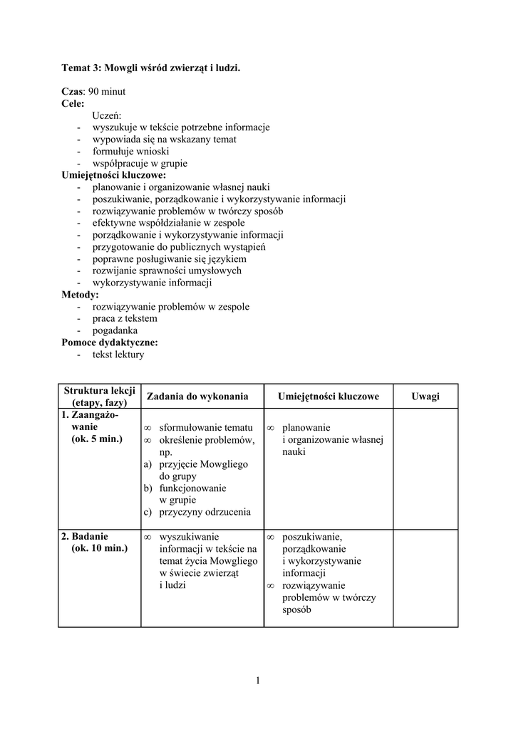 Temat 3: Mowgli wśród zwierząt i ludzi. Czas: 90 minut Cele: Uczeń