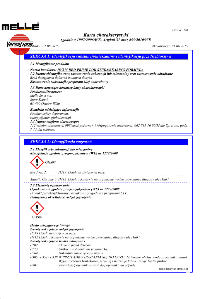 41.0 strona: 1/8 Karta charakterystyki zgodnie z 1907/2006/WE, Artykuł 31 oraz 453/2010/WE Data druku: 01.06.2015 Aktualizacja: 01.06.2015 SEKCJA 1: Identyfikacja substancji/mieszaniny i identyfikacja przedsiębiorstwa · 1.1 Identyfikator produktu · Nazwa handlowa: DV275 RED PRIME LOK STUD&BEARING FORMULA · 1.2 Istotne zidentyfikowane zastosowania substancji lub mieszaniny oraz zastosowania odradzane Brak dostępnych dalszych istotnych danych · Zastosowanie substancji / preparatu Klej anaerobowy · 1.3 Dane dotyczące dostawcy karty charakterystyki · Producent/Dostawca: Melle Sp. z o.o. Stary Staw 9 63-400 Ostrów Wlkp. · Komórka udzielająca informacji: Product safety department. [email protected] · 1.4 Numer telefonu alarmowego: 112(telefon alarmowy), 998(straż pożarna), 999(pogotowie medyczne), 062 735 16 00(Melle Sp. z o.o. godz. 7-15 dni robocze) SEKCJA 2: Identyfikacja zagrożeń · 2.1 Klasyfikacja substancji lub mieszaniny · Klasyfikacja zgodnie z rozporządzeniem (WE) nr 1272/2008 GHS07 Eye Irrit. 2 H319 Działa drażniąco na oczy. Aquatic Chronic 3 H412 Działa szkodliwie na organizmy wodne, powodując długotrwałe skutki. · 2.2 Elementy oznakowania · Oznakowanie zgodnie z rozporządzeniem (WE) nr 1272/2008 Produkt jest klasyfikowany i oznakowany zgodnie z przepisami CLP. · Piktogramy określające rodzaj zagrożenia GHS07 · Hasło ostrzegawcze Uwaga · Zwroty wskazujące rodzaj zagrożenia H319 Działa drażniąco na oczy. H412 Działa szkodliwie na organizmy wodne, powodując długotrwałe skutki. · Zwroty wskazujące środki ostrożności P102 Chronić przed dziećmi. P273 Unikać uwolnienia do środowiska. P264 Dokładnie umyć ręce po użyciu. P305+P351+P338 W PRZYPADKU DOSTANIA SIĘ DO OCZU: Ostrożnie płukać wodą przez kilka minut. Wyjąć soczewki kontaktowe, jeżeli są i można je łatwo usunąć.Nadal płukać. P501 Zawartość/pojemnik usuwać do pojemnika na odpady. (ciąg dalszy na stronie 2) PL 41.0 strona: 2/8 Karta charakterystyki zgodnie z 1907/2006/WE, Artykuł 31 oraz 453/2010/WE Data druku: 01.06.2015 Aktualizacja: 01.06.2015 Nazwa handlowa: DV275 RED PRIME LOK STUD&BEARING FORMULA (ciąg dalszy od strony 1) · 2.3 Inne zagrożenia · Wyniki oceny właściwości PBT i vPvB · PBT: Nie nadający się do zastosowania. · vPvB: Nie nadający się do zastosowania. SEKCJA 3: Skład/informacja o składnikach · 3.2 Charakterystyka chemiczna: Mieszaniny · Opis: Mieszanka: składająca się z niżej wymienionych składników wraz z bezpiecznymi domieszkami. · Składniki niebezpieczne: CAS: 80-15-9 hydronadtlenek 2-fenylopropan-2-ylu 2,5-<3% EINECS: 201-254-7 Org. Perox. EF, H242; Acute Tox. 3, H331; STOT RE 2, H373; Skin Corr. 1B, H314; Aquatic Chronic 2, H411; Acute Tox. 4, H302; Acute Tox. 4, H312 · Wskazówki dodatkowe: Pełna treść przytoczonych wskazówek dotyczących zagrożeń znajduje się w rozdziale 16. SEKCJA 4: Środki pierwszej pomocy · 4.1 Opis środków pierwszej pomocy · Wskazówki ogólne: Osoby porażone należy wynieść na świeże powietrze. · Po wdychaniu: Dostarczyć świeże powietrze, w razie dolegliwości wezwać lekarza. · Po styczności ze skórą: Ogólnie produkt nie działa drażniąco na skórę. · Po styczności z okiem: Płukać oczy z otwartą powieką przez kilka minut pod bieżącą wodą. W przypadku utrzymującej się dolegliwości zasięgnąć porady lekarza. · Po przełknięciu: Przy trwałych dolegliwościach porozumieć się z lekarzem. · 4.2 Najważniejsze ostre i opóźnione objawy oraz skutki narażenia Brak dostępnych dalszych istotnych danych · 4.3 Wskazania dotyczące wszelkiej natychmiastowej pomocy lekarskiej i szczególnego postępowania z poszkodowanym Brak dostępnych dalszych istotnych danych SEKCJA 5: Postępowanie w przypadku pożaru · 5.1 Środki gaśnicze · Przydatne środki gaśnicze: CO2, proszek gaśniczy lub strumień wody. Większy pożar zwalczać strumieniem wody lub pianą odporną na działanie alkoholu. · 5.2 Szczególne zagrożenia związane z substancją lub mieszaniną Brak dostępnych dalszych istotnych danych · 5.3 Informacje dla straży pożarnej · Specjalne wyposażenie ochronne: Środki specjalne nie są konieczne. · Inne dane Zagrożone zbiorniki ochłodzić strumieniem wody. PL (ciąg dalszy na stronie 3) 41.0 strona: 3/8 Karta charakterystyki zgodnie z 1907/2006/WE, Artykuł 31 oraz 453/2010/WE Data druku: 01.06.2015 Aktualizacja: 01.06.2015 Nazwa handlowa: DV275 RED PRIME LOK STUD&BEARING FORMULA (ciąg dalszy od strony 2) SEKCJA 6: Postępowanie w przypadku niezamierzonego uwolnienia do środowiska · 6.1 Indywidualne środki ostrożności, wyposażenie ochronne i procedury w sytuacjach awaryjnych Nie konieczne. · 6.2 Środki ostrożności w zakresie ochrony środowiska: W przypadku przedostania się do zbiorników wodnych lub kanalizacji zawiadomić właściwe władze. Nie dopuścić do przeniknięcia do kanalizacji /wód powierzchniowych /wód gruntowych. · 6.3 Metody i materiały zapobiegające rozprzestrzenianiu się skażenia i służące do usuwania skażenia: Zebrać za pomocą materiału wiążącego ciecze (piasek, ziemia okrzemkowa, materiał wiążący kwasy, materiał wiążący uniwersalny, trociny). Zadbać o wystarczające przewietrzenie. · 6.4 Odniesienia do innych sekcji Informacje na temat bezpiecznej obsługi patrz rozdział 7. Informacje na temat osobistego wyposażenia ochronnego patrz rozdział 8. Informacje na temat utylizacji patrz rozdział 13. SEKCJA 7: Postępowanie z substancjami i mieszaninami oraz ich magazynowanie · 7.1 Środki ostrożności dotyczące bezpiecznego postępowania Przy fachowym użyciu nie są potrzebne szczególne zabiegi. · Wskazówki dla ochrony przeciwpożarowej i przeciwwybuchowej: Nie są potrzebne szczególne zabiegi. · 7.2 Warunki bezpiecznego magazynowania, łącznie z informacjami dotyczącymi wszelkich wzajemnych niezgodności · Składowanie: · Wymagania w stosunku do pomieszcze
