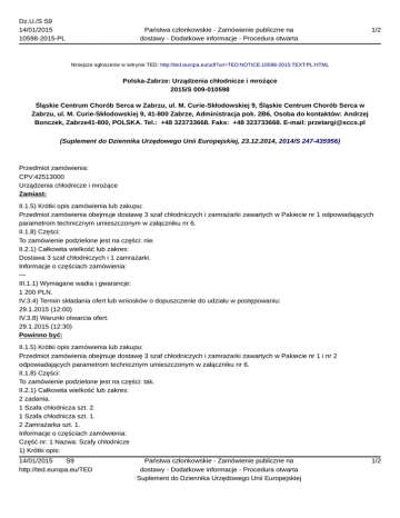 Dz.U./S S9 14/01/2015 10598-2015-PL Państwa członkowskie - Zamówienie publiczne na dostawy - Dodatkowe informacje - Procedura otwarta 1/2 Niniejsze ogłoszenie w witrynie TED: http://ted.europa.eu/udl?uri=TED:NOTICE:10598-2015:TEXT:PL:HTML Polska-Zabrze: Urządzenia chłodnicze i mrożące 2015/S 009-010598 Śląskie Centrum Chorób Serca w Zabrzu, ul. M. Curie-Skłodowskiej 9, Śląskie Centrum Chorób Serca w Zabrzu, ul. M. Curie-Skłodowskiej 9, 41-800 Zabrze, Administracja pok. 2B6, Osoba do kontaktów: Andrzej Bonczek, Zabrze41-800, POLSKA. Tel.: +48 323733668. Faks: +48 323733668. E-mail: [email protected] (Suplement do Dziennika Urzędowego Unii Europejskiej, 23.12.2014, 2014/S 247-435956) Przedmiot zamówienia: CPV:42513000 Urządzenia chłodnicze i mrożące Zamiast: II.1.5) Krótki opis zamówienia lub zakupu: Przedmiot zamówienia obejmuje dostawę 3 szaf chłodniczych i zamrażarki zawartych w Pakiecie nr 1 odpowiadających parametrom technicznym umieszczonym w załączniku nr 6. II.1.8) Części: To zamówienie podzielone jest na części: nie. II.2.1) Całkowita wielkość lub zakres: Dostawa 3 szaf chłodniczych i 1 zamrażarki. Informacje o częściach zamówienia: — III.1.1) Wymagane wadia i gwarancje: 1 200 PLN. IV.3.4) Termin składania ofert lub wniosków o dopuszczenie do udziału w postępowaniu: 29.1.2015 (12:00) IV.3.8) Warunki otwarcia ofert: 29.1.2015 (12:30) Powinno być: II.1.5) Krótki opis zamówienia lub zakupu: Przedmiot zamówienia obejmuje dostawę 3 szaf chłodniczych i zamrażarki zawartych w Pakiecie nr 1 i nr 2 odpowiadających parametrom technicznym umieszczonym w załączniku nr 6. II.1.8) Części: To zamówienie podzielone jest na części: tak. II.2.1) Całkowita wielkość lub zakres: 2 zadania. 1 Szafa chłodnicza szt. 2. 1 Szafa chłodnicza szt. 1. 2 Zamrażarka szt. 1. Informacje o częściach zamówienia: Część nr: 1 Nazwa: Szafy chłodnicze 1) Krótki opis: 14/01/2015 S9 http://ted.europa.eu/TED Państwa członkowskie - Zamówienie publiczne na dostawy - Dodatkowe informacje - Procedura otwarta Suplement do Dziennika Urzędowego Unii Europejskiej 1/2 Dz.U./S S9 14/01/2015 10598-2015-PL Państwa członkowskie - Zamówienie publiczne na dostawy - Dodatkowe informacje - Procedura otwarta 2/2 Szafa chłodnicza do przechowywania krwi z szufladami szt. 2. Szafa chłodnicza do przechowywania krwi ze stelażem na podwieszane pojemniki z krwią szt. 1. 2) Wspólny Słownik Zamówień (CPV): 42513000 3) Wielkość lub zakres: Szafa chłodnicza do przechowywania krwi z szufladami szt. 2. Szafa chłodnicza do przechowywania krwi ze stelażem na podwieszane pojemniki z krwią szt. 1. Część nr: 2 Nazwa: Zamrażarka 1) Krótki opis: Zamrażarka do przechowywania składników krwi. 2) Wspólny Słownik Zamówień (CPV): 42513000 3) Wielkość lub zakres: 1 szt. III.1.1) Wymagane wadia i gwarancje: — Pakiet nr 1 – 900 PLN, — pakiet nr 2 – 300 PLN. IV.3.4) Termin składania ofert lub wniosków o dopuszczenie do udziału w postępowaniu: 2.2.2015 (12:00) IV.3.8) Warunki otwarcia ofert: 2.2.2015 (12:30) Inne dodatkowe informacje Informacje do poprawienia lub dodania w odpowiedniej dokumentacji przetargowej. Więcej informacji w odpowiedniej dokumentacji przetargowej. 14/01/2015 S9 http://ted.europa.eu/TED Państwa członkowskie - Zamówienie publiczne na dostawy - Dodatkowe informacje - Procedura otwarta Suplement do Dziennika Urzędowego Unii Europejskiej 2/2