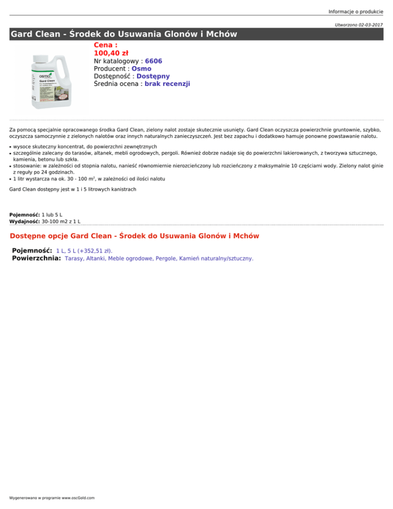 Informacje o produkcie Utworzono 02-03-2017 Gard Clean - Środek do Usuwania Glonów i Mchów Cena : 100,40 zł Nr katalogowy : 6606 Producent : Osmo Dostępność : Dostępny Średnia ocena : brak recenzji Za pomocą specjalnie opracowanego środka Gard Clean, zielony nalot zostaje skutecznie usunięty. Gard Clean oczyszcza powierzchnie gruntownie, szybko, oczyszcza samoczynnie z zielonych nalotów oraz innych naturalnych zanieczyszczeń. Jest bez zapachu i dodatkowo hamuje ponowne powstawanie nalotu. ● ● ● ● wysoce skuteczny koncentrat, do powierzchni zewnętrznych szczególnie zalecany do tarasów, altanek, mebli ogrodowych, pergoli. Również dobrze nadaje się do powierzchni lakierowanych, z tworzywa sztucznego, kamienia, betonu lub szkła. stosowanie: w zależności od stopnia nalotu, nanieść równomiernie nierozcieńczony lub rozcieńczony z maksymalnie 10 częściami wody. Zielony nalot ginie z reguły po 24 godzinach. 1 litr wystarcza na ok. 30 - 100 m2, w zależności od ilości nalotu Gard Clean dostępny jest w 1 i 5 litrowych kanistrach Pojemność: 1 lub 5 L Wydajność: 30-100 m2 z 1 L Dostępne opcje Gard Clean - Środek do Usuwania Glonów i Mchów Pojemność: 1 L, 5 L (+352,51 zł). Powierzchnia: Tarasy, Altanki, Meble ogrodowe, Pergole, Kamień naturalny/sztuczny. Wygenerowano w programie www.oscGold.com