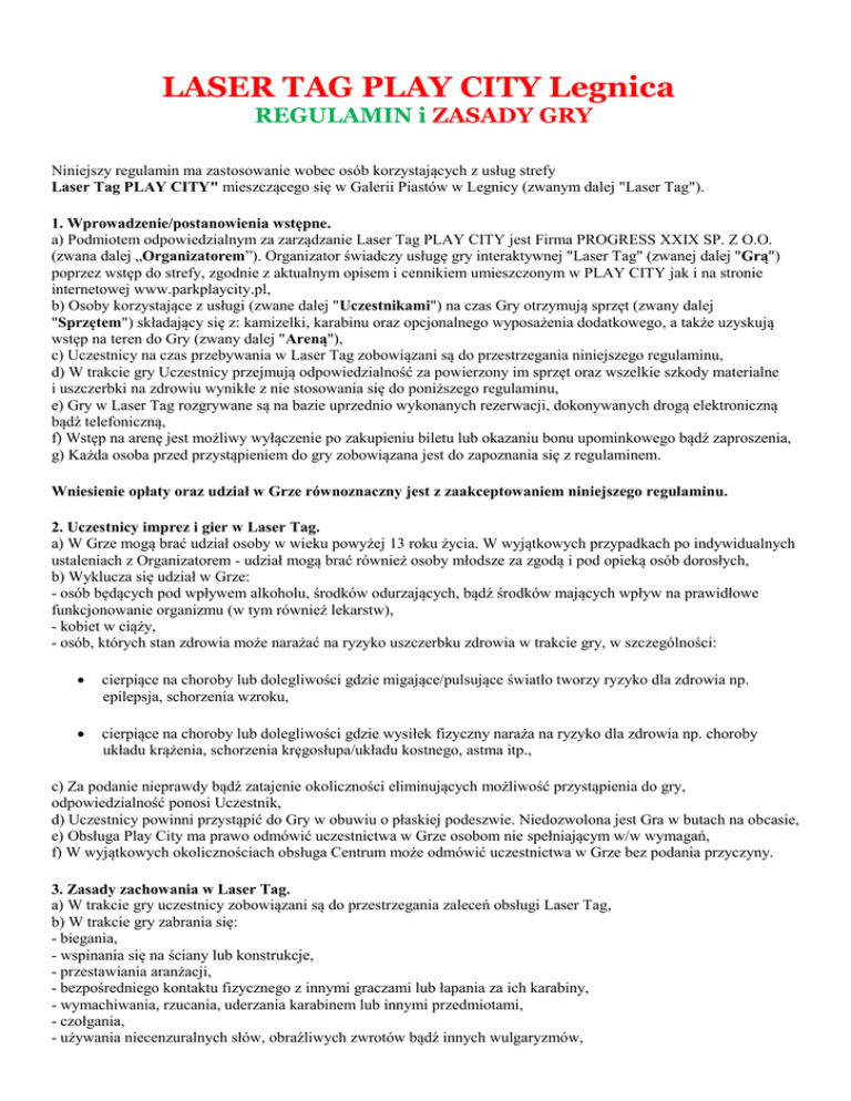 LASER TAG PLAY CITY Legnica REGULAMIN i ZASADY GRY Niniejszy regulamin ma zastosowanie wobec osób korzystających z usług strefy Laser Tag PLAY CITY" mieszczącego się w Galerii Piastów w Legnicy (zwanym dalej "Laser Tag"). 1. Wprowadzenie/postanowienia wstępne. a) Podmiotem odpowiedzialnym za zarządzanie Laser Tag PLAY CITY jest Firma PROGRESS XXIX SP. Z O.O. (zwana dalej „Organizatorem”). Organizator świadczy usługę gry interaktywnej "Laser Tag" (zwanej dalej "Grą") poprzez wstęp do strefy, zgodnie z aktualnym opisem i cennikiem umieszczonym w PLAY CITY jak i na stronie internetowej www.parkplaycity.pl, b) Osoby korzystające z usługi (zwane dalej "Uczestnikami") na czas Gry otrzymują sprzęt (zwany dalej "Sprzętem") składający się z: kamizelki, karabinu oraz opcjonalnego wyposażenia dodatkowego, a także uzyskują wstęp na teren do Gry (zwany dalej "Areną"), c) Uczestnicy na czas przebywania w Laser Tag zobowiązani są do przestrzegania niniejszego regulaminu, d) W trakcie gry Uczestnicy przejmują odpowiedzialność za powierzony im sprzęt oraz wszelkie szkody materialne i uszczerbki na zdrowiu wynikłe z nie stosowania się do poniższego regulaminu, e) Gry w Laser Tag rozgrywane są na bazie uprzednio wykonanych rezerwacji, dokonywanych drogą elektroniczną bądź telefoniczną, f) Wstęp na arenę jest możliwy wyłączenie po zakupieniu biletu lub okazaniu bonu upominkowego bądź zaproszenia, g) Każda osoba przed przystąpieniem do gry zobowiązana jest do zapoznania się z regulaminem. Wniesienie opłaty oraz udział w Grze równoznaczny jest z zaakceptowaniem niniejszego regulaminu. 2. Uczestnicy imprez i gier w Laser Tag. a) W Grze mogą brać udział osoby w wieku powyżej 13 roku życia. W wyjątkowych przypadkach po indywidualnych ustaleniach z Organizatorem - udział mogą brać również osoby młodsze za zgodą i pod opieką osób dorosłych, b) Wyklucza się udział w Grze: - osób będących pod wpływem alkoholu, środków odurzających, bądź środków mających wpływ na prawidłowe funkcjonowanie organizmu (w tym również lekarstw), - kobiet w ciąży, - osób, których stan zdrowia może narażać na ryzyko uszczerbku zdrowia w trakcie gry, w szczególności: cierpiące na choroby lub dolegliwości gdzie migające/pulsujące światło tworzy ryzyko dla zdrowia np. epilepsja, schorzenia wzroku, cierpiące na choroby lub dolegliwości gdzie wysiłek fizyczny naraża na ryzyko dla zdrowia np. choroby układu krążenia, schorzenia kręgosłupa/układu kostnego, astma itp., c) Za podanie nieprawdy bądź zatajenie okoliczności eliminujących możliwość przystąpienia do gry, odpowiedzialność ponosi Uczestnik, d) Uczestnicy powinni przystąpić do Gry w obuwiu o płaskiej podeszwie. Niedozwolona jest Gra w butach na obcasie, e) Obsługa Play City ma prawo odmówić uczestnictwa w Grze osobom nie spełniającym w/w wymagań, f) W wyjątkowych okolicznościach obsługa Centrum może odmówić uczestnictwa w Grze bez podania przyczyny. 3. Zasady zachowania w Laser Tag. a) W trakcie gry uczestnicy zobowiązani są do przestrzegania zaleceń obsługi Laser Tag, b) W trakcie gry zabrania się: - biegania, - wspinania się na ściany lub konstrukcje, - przestawiania aranżacji, - bezpośredniego kontaktu fizycznego z innymi graczami lub łapania za ich karabiny, - wymachiwania, rzucania, uderzania karabinem lub innymi przedmiotami, - czołgania, - używania niecenzuralnych słów, obraźliwych zwrotów bądź innych wulgaryzmów, - używania ognia, - używania Sprzętu niezgodnie z przeznaczeniem, niszczenia bądź celowego zanieczyszczania, - zasłaniania czujników trafień odzieżą lub innymi przedmiotami, - wnoszenia na Arenę jedzenia, picia oraz wszelkich zbędnych do przeprowadzenia Gry przedmiotów, c) Karabin w trakcie Gry powinien być trzymany przez Uczestnika oburącz, d) W trakcie Gry na Arenie mogą przebywać jedynie jej Uczestnicy oraz obsługa Play City, pozostałe osoby powinny czekać na jej zakończenie w poczekalni; e) Uczestnik, który ma problem z obsługą Sprzętu lub zauważył jego nieprawidłowe działanie zobowiązany jest niezwłocznie zgłosić się do obsługi Play City, f) Na terenie Play City obowiązuje całkowity zakaz palenia tytoniu, oraz zakaz spożywania alkoholu, g) Uczestnicy nie mogą opuszczać terenu Play City wraz z powierzonym im Sprzętem, h) Osoby nie stosujące się do powyższych uregulowań mogą zostać wyproszone z Areny przed upływem czasu gry, bez prawa do zwrotu opłaty za usługę. W w/w przypadku dla zachowania porządku może zostać wezwana Ochrona Play City, i) Uczestnicy powinni przechowywać drobne i cenne przedmioty w zamykanych szafkach udostępnionych przez Organizatora przy strefie biurowej. W razie zagubienia udostępnionego kluczyka Klient jest zobowiązany uiścić kwotę 15 zł., celem pokrycia kosztu wyrobienia nowego kluczyka, j) Uczestnicy noszący okulary bądź elementy ozdobne ubioru, powinni je zdjąć lub zapewnić odpowiednie ich zabezpieczenie. 4. Odpowiedzialność stron. a) Uczestnicy Gry przyjmują do wiadomości, że Arena jest pomieszczeniem o słabym oświetleniu, a Gra jest sportem wymagającym wysiłku psychofizycznego oraz mogącym powodować kontuzje (otarcia, zadrapania, siniaki czy inne negatywne skutki zdrowotne) i będąc tego świadomym dobrowolnie decydują się na udział w Grze, b) Organizator oświadcza, że posiada ubezpieczenie Odpowiedzialności Cywilnej oraz środki pierwszej pomocy, c) Organizator nie ponosi odpowiedzialności za szkody i wszelkie uszczerbki na zdrowiu wynikłe z nie stosowania się do niniejszego regulaminu, d) W przypadku uszkodzenia sprzętu wynikającego z celowego działania lub zaniedbania, Uczestnik może zostać obciążony kosztami jego naprawy zgodnie z fakturą wystawioną przez producenta - nie dotyczy to powstawania rys i kosmetycznego zużywania sprzętu, e) W przypadku uszkodzeń ścianek, konstrukcji c