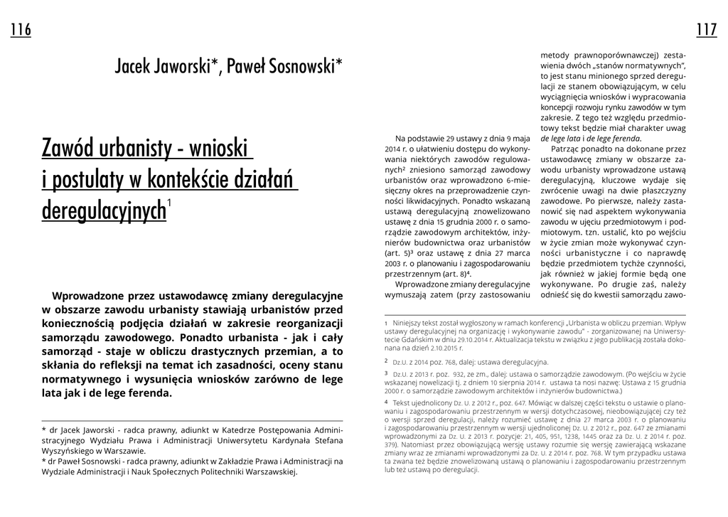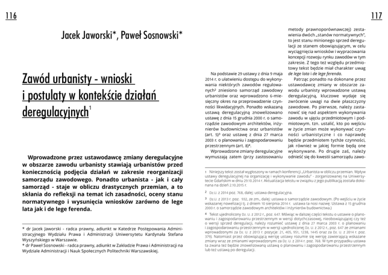 116 117 Jacek Jaworski*, Paweł Sosnowski* Zawód urbanisty - wnioski i postulaty w kontekście działań deregulacyjnych 1 Wprowadzone przez ustawodawcę zmiany deregulacyjne w obszarze zawodu urbanisty stawiają urbanistów przed koniecznością podjęcia działań w zakresie reorganizacji samorządu zawodowego. Ponadto urbanista - jak i cały samorząd - staje w obliczu drastycznych przemian, a to skłania do refleksji na temat ich zasadności, oceny stanu normatywnego i wysunięcia wniosków zarówno de lege lata jak i de lege ferenda. * dr Jacek Jaworski - radca prawny, adiunkt w Katedrze Postępowania Administracyjnego Wydziału Prawa i Administracji Uniwersytetu Kardynała Stefana Wyszyńskiego w Warszawie. * dr Paweł Sosnowski - radca prawny, adiunkt w Zakładzie Prawa i Administracji na Wydziale Administracji i Nauk Społecznych Politechniki Warszawskiej. Na podstawie 29 ustawy z dnia 9 maja 2014 r. o ułatwieniu dostępu do wykonywania niektórych zawodów regulowanych² zniesiono samorząd zawodowy urbanistów oraz wprowadzono 6 -miesięczny okres na przeprowadzenie czynności likwidacyjnych. Ponadto wskazaną ustawą deregulacyjną znowelizowano ustawę z dnia 15 grudnia 2000 r. o samorządzie zawodowym architektów, inżynierów budownictwa oraz urbanistów (art. 5)³ oraz ustawę z dnia 27 marca 2003 r. o planowaniu i zagospodarowaniu przestrzennym (art. 8)⁴. Wprowadzone zmiany deregulacyjne wymuszają zatem (przy zastosowaniu metody prawnoporównawczej) zestawienia dwóch „stanów normatywnych”, to jest stanu minionego sprzed deregulacji ze stanem obowiązującym, w celu wyciągnięcia wniosków i wypracowania koncepcji rozwoju rynku zawodów w tym zakresie. Z tego też względu przedmiotowy tekst będzie miał charakter uwag de lege lata i de lege ferenda. Patrząc ponadto na dokonane przez ustawodawcę zmiany w obszarze zawodu urbanisty wprowadzone ustawą deregulacyjną, kluczowe wydaje się zwrócenie uwagi na dwie płaszczyzny zawodowe. Po pierwsze, należy zastanowić się nad aspektem wykonywania zawodu w ujęciu przedmiotowym i podmiotowym. tzn. ustalić, kto po wejściu w życie zmian może wykonywać czynności urbanistyczne i co naprawdę będzie przedmiotem tychże czynności, jak również w jakiej formie będą one wykonywane. Po drugie zaś, należy odnieść się do kwestii samorządu zawo- Niniejszy tekst został wygłoszony w ramach konferencji „Urbanista w obliczu przemian. Wpływ ustawy deregulacyjnej na organizację i wykonywanie zawodu” - zorganizowanej na Uniwersytecie Gdańskim w dniu 29.10.2014 r. Aktualizacja tekstu w związku z jego publikacją została dokonana na dzień 2.10.2015 r. 1 2 Dz.U. z 2014 poz. 768 , dalej: ustawa deregulacyjna. Dz.U. z 2013 r. poz. 932, ze zm., dalej: ustawa o samorządzie zawodowym. (Po wejściu w życie wskazanej nowelizacji tj. z dniem 10 sierpnia 2014 r. ustawa ta nosi nazwę: Ustawa z 15 grudnia 2000 r. o samorządzie zawodowym architektów i inżynierów budownictwa.) 3 4 Tekst ujednolicony Dz. U. z 2012 r., poz. 647. Mówiąc w dalszej części tekstu o ustawie o planowaniu i zagospodarowaniu przestrzennym w wersji dotychczasowej, nieobowiązującej czy też o wersji sprzed deregulacji, należy rozumieć ustawę z dnia 27 marca 2003 r. o planowaniu i zagospodarowaniu przestrzennym w wersji ujednoliconej Dz. U. z 2012 r., poz. 647 ze zmianami wprowadzonymi za Dz. U. z 2013 r. pozycje: 21, 405, 951, 1238 , 1445 oraz za Dz. U. z 2014 r. poz. 379). Natomiast przez obowiązującą wersję ustawy rozumie się wersję zawierającą wskazane zmiany wraz ze zmianami wprowadzonymi za Dz. U. z 2014 r. poz. 768. W tym przypadku ustawa ta zwana też będzie znowelizowaną ustawą o planowaniu i zagospodarowaniu przestrzennym lub też ustawą po deregulacji. 118 METROPOLITAN NR 2 ( 2 ) / 2014 dowego jako zrzeszenia osób wykonujących zawód urbanisty w aspekcie jego przeorganizowania w zakresie formalnoprawnym oraz zmiany celów i zasad działania. Dopiero te dwie płaszczyzny składają się bowiem na szerokie ujęcie zawodu decydując zarazem o jego randze i perspektywie dalszego rozwoju. Co do aspektu wykonywania zawodu, to kluczowym przepisem wyznaczającym krąg podmiotów zdolnych do świadczenia tzw. czynności urbanistycznych jest art. 5 ustawy o planowaniu i zagospodarowaniu przestrzennym (w wersji po nowelizacji). Zgodnie z nim, projekty planów zagospodarowania przestrzennego województwa, studium uwarunkowań i kierunków zagospodarowania przestrzennego gminy oraz miejscowego planu zagospodarowania przestrzennego sporządzają osoby, które spełniają jeden z poniższych warunków: 1. nabyły uprawnienia do projektowania w planowaniu przestrzennym na pod stawie ustawy z dnia 12 lipca 1984 r. o planowaniu przestrzennym⁵; 2. nabyły uprawnienia urbanistyczne na podstawie art. 51 ustawy z dnia 7 lipca 1994 r. o zagospodarowaniu przestrzennym⁶; 3. posiadają kwalifikacje do wykonywania zawodu urbanisty na terytorium Rzeczypospolitej Polskiej uzyskane na podstawie ustawy z dnia 15 grudnia 2000 r. o samorządach zawodo5 Dz. U. z 1989 r. Nr 17, poz. 99, z późn. zm. 6 Dz. U. z 1999 r. Nr 15, poz. 139, z późn. zm. 7 Dz. U. z 2013 r. poz. 932 i 1650. wych architektów, inżynierów budo wnictwa oraz urbanistów⁷; 4. posiadają dyplom ukończenia studiów wyższych w zakresie architektury, urba nistyki lub gospodarki przestrzennej; 5. posiadają dyplom ukończenia studiów wyższych w zakresie innym niż okreś lony w pkt 4 oraz ukończyły studia podyplomowe w zakresie planowania przestrzennego, urbanistyki lub gos podarki przestrzennej; 6. są obywatelami państw członkowskich Unii Europejskiej, Konfederacji Szwajcarskiej lub państwa członkowskiego Europejskiego Porozumienia o Wolnym Handlu (EFTA ) - strony umowy o Europejskim Obszarze Gospodarczym, którzy nabyli kwalifikacje zawodowe do projektowania zagospodarowania przestrzeni i za gospodarowania przestrzennego w skali lokalnej i regionalnej