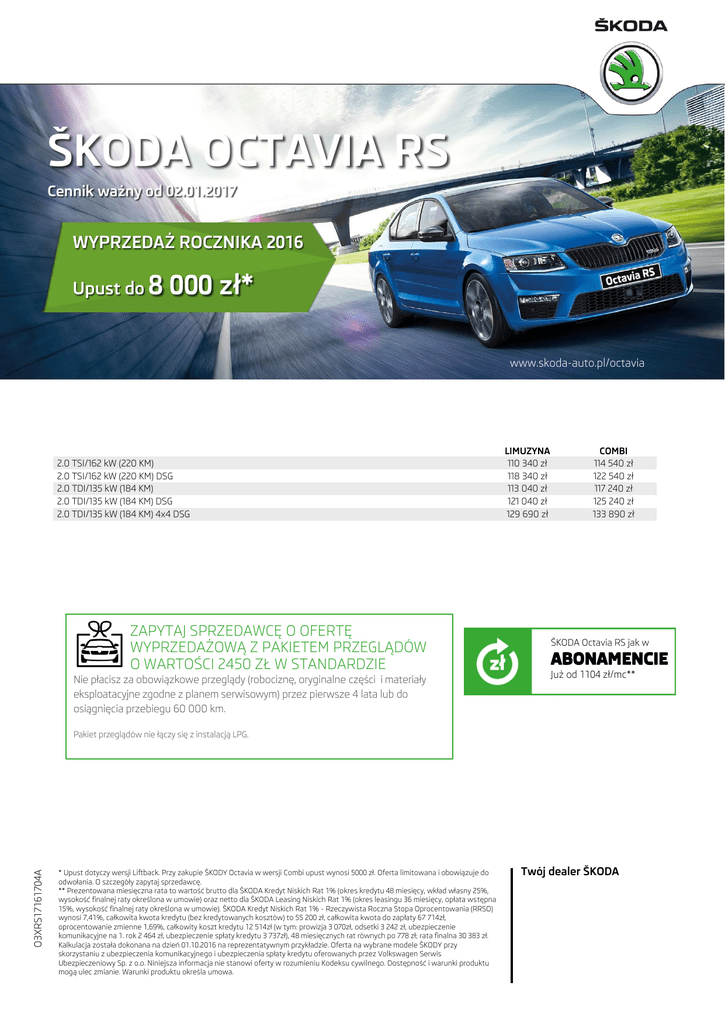 Cennik - Nowa OCTAVIA RS wyprzedaż rocznika 2016