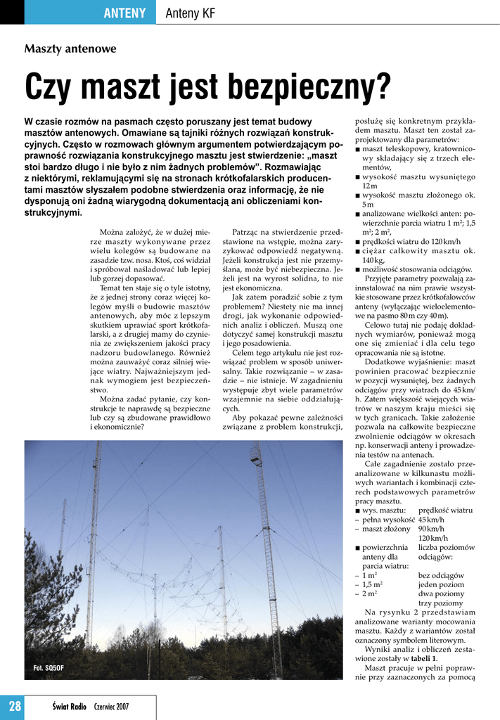 ANTENY Anteny KF Maszty antenowe Czy maszt jest bezpieczny? W czasie rozmów na pasmach często poruszany jest temat budowy masztów antenowych. Omawiane są tajniki różnych rozwiązań konstrukcyjnych. Często w rozmowach głównym argumentem potwierdzającym poprawność rozwiązania konstrukcyjnego masztu jest stwierdzenie: „maszt stoi bardzo długo i nie było z nim żadnych problemów”. Rozmawiając z niektórymi, reklamującymi się na stronach krótkofalarskich producentami masztów słyszałem podobne stwierdzenia oraz informację, że nie dysponują oni żadną wiarygodną dokumentacją ani obliczeniami konstrukcyjnymi. Można założyć, że w dużej mierze maszty wykonywane przez wielu kolegów są budowane na zasadzie tzw. nosa. Ktoś, coś widział i spróbował naśladować lub lepiej lub gorzej dopasować. Temat ten staje się o tyle istotny, że z jednej strony coraz więcej kolegów myśli o budowie masztów antenowych, aby móc z lepszym skutkiem uprawiać sport krótkofalarski, a z drugiej mamy do czynienia ze zwiększeniem jakości pracy nadzoru budowlanego. Również można zauważyć coraz silniej wiejące wiatry. Najważniejszym jednak wymogiem jest bezpieczeństwo. Można zadać pytanie, czy konstrukcje te naprawdę są bezpieczne lub czy są zbudowane prawidłowo i ekonomicznie? Fot. SQ5OF 28 Świat Radio Czerwiec 2007 Patrząc na stwierdzenie przedstawione na wstępie, można zaryzykować odpowiedź negatywną. Jeżeli konstrukcja jest nie przemyślana, może być niebezpieczna. Jeżeli jest na wyrost solidna, to nie jest ekonomiczna. Jak zatem poradzić sobie z tym problemem? Niestety nie ma innej drogi, jak wykonanie odpowiednich analiz i obliczeń. Muszą one dotyczyć samej konstrukcji masztu i jego posadowienia. Celem tego artykułu nie jest rozwiązać problem w sposób uniwersalny. Takie rozwiązanie – w zasadzie – nie istnieje. W zagadnieniu występuje zbyt wiele parametrów wzajemnie na siebie oddziałujących. Aby pokazać pewne zależności związane z problem konstrukcji, posłużę się konkretnym przykładem masztu. Maszt ten został zaprojektowany dla parametrów: maszt teleskopowy, kratownicowy składający się z trzech elementów, wysokość masztu wysuniętego 12 m wysokość masztu złożonego ok. 5m analizowane wielkości anten: powierzchnie parcia wiatru 1 m2; 1,5 m2; 2 m2, prędkości wiatru do 120 km/h ciężar całkowity masztu ok. 140 kg, możliwość stosowania odciągów. Przyjęte parametry pozwalają zainnstalować na nim prawie wszystkie stosowane przez krótkofalowców anteny (wyłączając wieloelementowe na pasmo 80 m czy 40 m). Celowo tutaj nie podaję dokładnych wymiarów, ponieważ mogą one się zmieniać i dla celu tego opracowania nie są istotne. Dodatkowe wyjaśnienie: maszt powinien pracować bezpiecznie w pozycji wysuniętej, bez żadnych odciągów przy wiatrach do 45 km/ h. Zatem większość wiejących wiatrów w naszym kraju mieści się w tych granicach. Takie założenie pozwala na całkowite bezpieczne zwolnienie odciągów w okresach np. konserwacji anteny i prowadzenia testów na antenach. Całe zagadnienie zostało przeanalizowane w kilkunastu możliwych wariantach i kombinacji czterech podstawowych parametrów pracy masztu. prędkość wiatru wys. masztu: – pełna wysokość 45 km/h – maszt złożony 90 km/h 120 km/h liczba poziomów powierzchnia anteny dla odciągów: parcia wiatru: – 1 m2 bez odciągów – 1,5 m2 jeden poziom – 2 m2 dwa poziomy trzy poziomy Na rysynku 2 przedstawiam analizowane warianty mocowania masztu. Każdy z wariantów został oznaczony symbolem literowym. Wyniki analiz i obliczeń zestawione zostały w tabeli 1. Maszt pracuje w pełni poprawnie przy zaznaczonych za pomocą Tab. 1. Pełna wysokość Powierzchnia anteny W Prędkość wiatru A. Wersja bez odciągów Bez odciągów 1 poziom odciągów B. Wersja z jednym poziomem odciągów – model 1 2 poziomy odciągów 3 poziomy odciągów 1m 1,5 m2 2 2 m2 45 90 120 45 90 120 45 90 120 A X N N X N N X N N B X X X X X X X X X C X X X X X X X X N D X X N X N N X N N E X X X X X X X X X F X X X X X X X X N G X X X X X X X X X Maszt złożony Powierzchnia anteny C. Wersja z jednym poziomem odciągów – model 2 D. Wersja z jednym poziomem odciągów – model 3 E. Wersja z dwoma poziomami odciągów – model 1 F. Wersja z dwoma poziomami odciągów – model 2 G. Wersja z trzema poziomami odciągów H. Wersja bez odciągów (maszt złożony) J. Wersja z jednym poziomem odciągów (maszt złożony) W Prędkość wiatru 1 m2 1,5 m2 2 m2 45 90 120 45 90 120 45 90 120 Bez odciągów H X X X X X N X X N 1 poziom odciągów J X X X X X X X X X znaku „X” kombinacjach parametrów. Warianty kombinacji oznaczone znakiem „N” nie są dozwolone. Użycie ich może grozić wypadkiem z powodu przekroczenia dopuszczalnych naprężeń w elementach konstrukcji lub elementach mocowania masztu. Analiza przedstawionej tabeli jednoznacznie wskazuje, jak istotne znaczenie dla bezpiecznej pracy konstrukcji ma wielkość anteny i sposób zamocowania masztu. Zatem stwierdzenie, że maszt już stał, bez dokonania odpowiedniej oceny jego konstrukcji jest w pełni błędne i również bardzo ryzykowne z punktu widzenia bezpieczeństwa. Błędne jest również stwierdzenie, że jeżeli np. ten maszt waży 140 kg i pracuje poprawnie z daną anteną, to inny, który waży 500 kg też na pewno jest dobry. W takim przypadku można stwierdzić tylko jedno, że na pewno ten drugi maszt nie jest ekonomiczny. Czy pracuje poprawnie – niekoniecznie! Pragnę zwrócić uwagę, że przedstawiona analiza pokazuje pewien mechanizm pozwalający ocenić konstrukcję i została wykonana dla konkretnego rozwiązania konstrukcyjnego masztu. Nie może ona być przeniesiona na inną konstrukcję bez wykonania odpowiednich obliczeń. Celem jej było wyłącznie pokazanie problemu, a nie rozwiązanie wszystkich konstrukcji. Jeszcze raz należy stwierdzić, że
