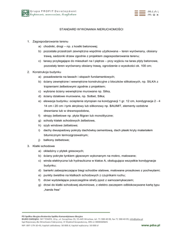 STANDARD WYKONANIA NIERUCHOMOŚCI 1. Zagospodarowanie terenu a) chodniki, drogi – np. z kostki betonowej; b) pozostała przestrzeń zewnętrzna wspólnie użytkowana – teren wyrównany, obsiany trawą, sadzonki drzew zgodnie z projektem zagospodarowania terenu; c) tarasy przylegające do mieszkań na I piętrze – przy wyjściu na taras płyty betonowe, pozostały teren wyrównany obsiany trawą, ogrodzenie o wysokości ok. 100 cm; 2. Konstrukcja budynku a) posadowienie na ławach i stopach fundamentowych; b) ściany zewnętrzne i wewnętrzne konstrukcyjne z bloczków silikatowych, np. SILKA z trzpieniami żelbetowymi zgodnie z projektem; c) wybrane ściany wewnętrzne murowane np. Silka, d) ściany działowe murowane, np. Solbet, Silka; e) elewacja budynku: ocieplenie styropian na kondygnacji 1 gr. 12 cm, kondygnacja 2 - 4 14 cm i 20 cm i tynk akrylowy lub silikonowy np. BAUMIT, elementy ozdobne drewniane lub w drewnopodobne, f) stropy żelbetowe np. płyta filigran lub monolityczne; g) schody klatek schodowych żelbetowe, h) szyb windowe żelbetowe; i) dachy dwuspadowy pokryty dachówką cementową, dach płaski kryty materiałem bitumicznym termozgrzewalnym; j) balkony żelbetowe; 3. Klatki schodowe a) okładziny z płytek gresowych; b) ściany pokryte tynkiem gipsowym wykonanym na mokro, malowane; c) winda elektryczna lub hydrauliczna w klatce A, obsługująca wszystkie kondygnacje budynku; d) barierki zabezpieczające biegi schodów stalowe, malowane proszkowo z pochwytami; e) punkty świetlne na klatkach schodowych z czujnikami ruchu; f) drzwi wydzielające poszczególne strefy ppoż z samozamykaczem; g) drzwi do klatki schodowej aluminiowe, z elektro zaczepem odblokowywane kartą typu „hands free” PD Spółka Akcyjna Braterska Spółka Komandytowo-Akcyjna BIURO ZARZĄDU: SKY TOWER, 10 p., ul. Szczęśliwa 33, 53-445 Wrocław, tel. 71 388 40 00, fax 71 388 40 09, [email protected] Sąd Rejonowy dla Wrocławia-Fabrycznej, VI Wydział Gospodarczy, KRS nr 0000469645 NIP: 897-179-10-43, kapitał zakładowy: 50 000 zł, kapitał wpłacony: 50 000 zł www.pdsa.pl 4. Instalacje a) instalacja elektryczna, b) Instalacje niskoprądowe: i. antena satelitarna na dachu; ii. antena zbiorcza cyfrowej telewizji naziemnej oraz radiowa na dachu; iii. widedomofonowa przy wejściach do klatek schodowych; iv. system monitoringu nieruchomości z kamerami przy wjeździe do garażu oraz wejściach do klatek schodowych z urządzeniami nagrywającymi w pomieszczeniu technicznym; c) instalacja wodna z tworzywa sztucznego lub stalowa; d) instalacja kanalizacyjna z PCV; e) instalacja c.o. dla budynków zasilana węzła cieplnego zlokalizowanego w kondygnacji 1 budynku - hala garażu; 5. Mieszkanie a) drzwi wejściowe do lokalu o zwiększonej odporności na włamanie klasy 3 zgodnie z normą PN-ENV 1627:2006 np. DIERRE; b) stolarka okienna PCV pięciokomorowa, w kolorze białym jednostronnie okleinowana w kolorze grafitowym zgodnie z projektem, rolety zewnętrzne na kondygnacji 2 od strony patio; c) parapety okienne wewnętrzne z konglomeratu lub kamienne; d) parapety zewnętrzne z blachy ocynkowanej powlekanej; e) podłoże z zaprawy cementowej pod posadzkę, bez okładzin; f) tynki na ścianach - gipsowe wykonane na mokro, w łazienkach gipsowe zatarte na ostro; g) balustrady na loggiach i balkonach stalowe, ocynkowane malowane proszkowo lub pełne żelbetowe; h) posadzka balkonowa wykończona okładzinami z płytek gresowych mrozoodpornych lub deska tarasowa, przegrody balkonowe ażurowe; i) instalacja elektryczna o mocy 14 kW - bez opraw oświetleniowych, gniazda wtykowe, wyłączniki oświetlenia wg. projektu; zasilanie i gniazdo pod płytę kuchenną o napięciu 400V; na poziomie parteru przy wejściach na tarasy oświetlenie zewnętrzne w postaci kinkietów naściennych; j) instalacje niskoprądowe wg. projektu: i. TV – jedno gniazdo podwójne w pokoju dzienny, ii. Internetowo – telefoniczna – KT RJ45 w każdym pokoju; iii. domofonowa – aparat przy drzwiach wejściowych do mieszkania; k) instalacja wodna z tworzywa sztucznego, rozprowadzona w warstwach izolacyjnych posadzki i w ścianach podtynkowo lub natynkowo, wyjścia zaślepione; PD Spółka Akcyjna Braterska Spółka Komandytowo-Akcyjna BIURO ZARZĄDU: SKY TOWER, 10 p., ul. Szczęśliwa 33, 53-445 Wrocław, tel. 71 388 40 00, fax 71 388 40 09, [email protected] Sąd Rejonowy dla Wrocławia-Fabrycznej, VI Wydział Gospodarczy, KRS nr 0000469645 NIP: 897-179-10-43, kapitał zakładowy: 50 000 zł, kapitał wpłacony: 50 000 zł www.pdsa.pl l) instalacja kanalizacyjna z PCV zgodna z projektem, rozprowadzona częściowo w posadzkach i nad posadzką oraz na ścianach zewnętrznie, wyjścia zaślepione; m) instalacja centralnego ogrzewania - rozprowadzenie technologii rur np. wielowarstwowych polietylenowych z grzejnikami konwektorowymi w pokojach i drabinkowymi w łazience; n) wentylacja w kuchni i łazience grawitacyjna; o) liczniki wody i zużycia energii cieplnej zlokalizowane w szachtach na klatce schodowej; 6. Garaż wielostanowiskowy – komórka lokatorska a) ściany murowane, w części ażurowe lub z siatki stalowej; b) komórka lokatorska zamykana drzwiami ażurowymi; c) punkt świetlny; 7. Garaż wielostanowiskowy - Miejsca postojowe a) automatyczne, otwierane pilotem, segmentowe bramy do garażu podziemnego; b) ściany białkowane; c) wylewka betonowa utwardzona powierzchniowo, miejsca wyznaczone liniami; PD Spółka Akcyjna Braterska Spółka Komandytowo-Akcyjna BIURO ZARZĄDU: SKY TOWER, 10 p., ul. Szczęśliwa 33, 53-445 Wrocław, tel. 71 388 40 00, fax 71 388 40 09, [email protected] Sąd Rejonowy dla Wrocławia-Fabrycznej, VI Wydział Gospodarczy, KRS nr 0000469645 NIP: 897-179-10-43, kapitał zakładowy: 50 000 zł, kapitał wpłacony: 50 000 zł www.pdsa.pl