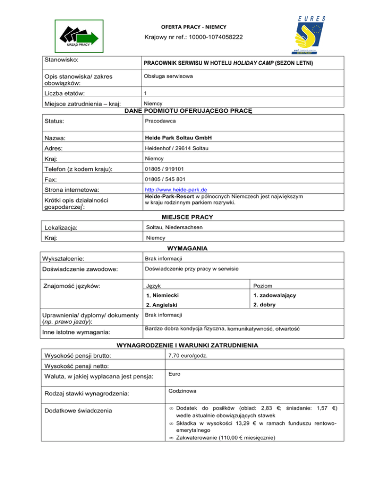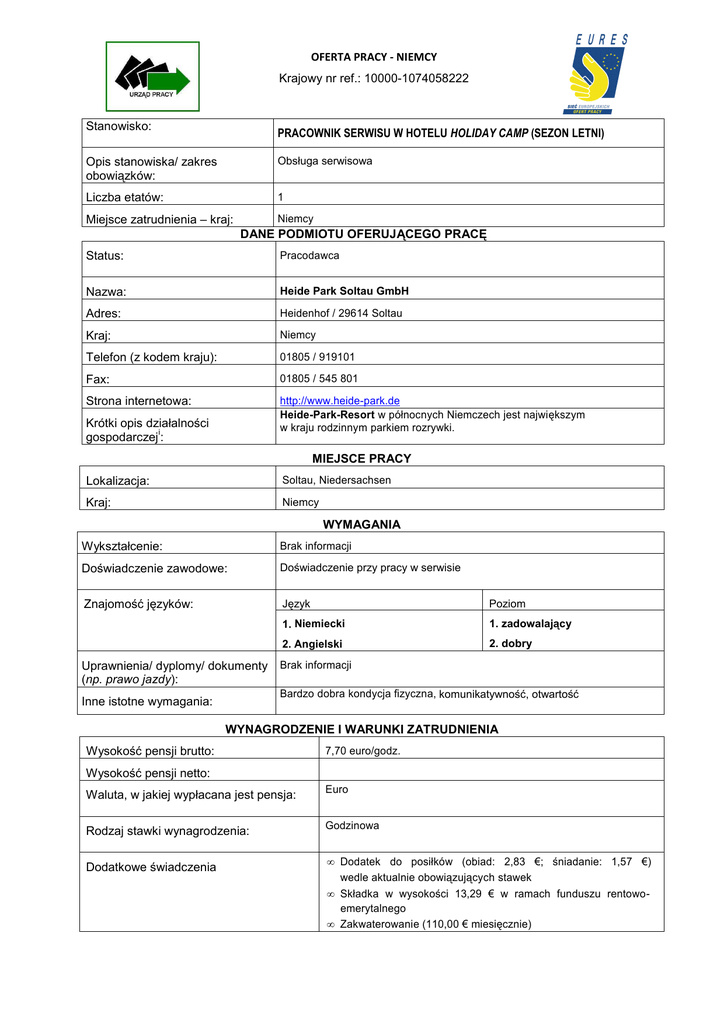 OFERTA PRACY - NIEMCY Krajowy nr ref.: 10000-1074058222 Stanowisko: PRACOWNIK SERWISU W HOTELU HOLIDAY CAMP (SEZON LETNI) Opis stanowiska/ zakres obowiązków: Obsługa serwisowa Liczba etatów: 1 Niemcy Miejsce zatrudnienia – kraj: DANE PODMIOTU OFERUJĄCEGO PRACĘ Status: Pracodawca Nazwa: Heide Park Soltau GmbH Adres: Heidenhof / 29614 Soltau Kraj: Niemcy Telefon (z kodem kraju): 01805 / 919101 Fax: 01805 / 545 801 Strona internetowa: http://www.heide-park.de Heide-Park-Resort w północnych Niemczech jest największym w kraju rodzinnym parkiem rozrywki. Krótki opis działalności i gospodarczej : MIEJSCE PRACY Lokalizacja: Soltau, Niedersachsen Kraj: Niemcy WYMAGANIA Wykształcenie: Brak informacji Doświadczenie zawodowe: Doświadczenie przy pracy w serwisie Znajomość języków: Język Poziom 1. Niemiecki 1. zadowalający 2. Angielski 2. dobry Uprawnienia/ dyplomy/ dokumenty (np. prawo jazdy): Brak informacji Bardzo dobra kondycja fizyczna, komunikatywność, otwartość Inne istotne wymagania: WYNAGRODZENIE I WARUNKI ZATRUDNIENIA Wysokość pensji brutto: 7,70 euro/godz. Wysokość pensji netto: Waluta, w jakiej wypłacana jest pensja: Euro Rodzaj stawki wynagrodzenia: Godzinowa Dodatkowe świadczenia • Dodatek do posiłków (obiad: 2,83 €; śniadanie: 1,57 €) wedle aktualnie obowiązujących stawek • Składka w wysokości 13,29 € w ramach funduszu rentowoemerytalnego • Zakwaterowanie (110,00 € miesięcznie) Nazwa firmy, z którą zostanie podpisana umowa: Rodzaj umowy: Wymiar czasu pracy Czas trwania umowy: Data rozpoczęcia: Heide Park Soltau GmbH Umowa na czas określony Pełen etat 15.07.2012 – Data wygaśnięcia 30.09.2012 umowy (w przypadku umowy na czas określony): 15.07.2012 • 20 darmowych biletów na wszystkie atrakcje świadczone przez firmę Merlin • Bezpłatna odzieŜ robocza • Bezpłatne miejsca parkingowe • Dwa Święta pracownicze w roku (w ciągu sezonu letniego oraz na koniec sezonu) • Konkurs na najlepszego pracownika • MoŜliwość podjęcia urlopu w miesiącach letnich (urlop zostanie przyznany zgodnie z ustaleniami zakładu pracy) • Szkolenie wprowadzające • Szkolenia doszkalające • Bezpłatne połączenie internetowe WLAN • 20 % zniŜki na jedzenie w hotelu • 5 % zniŜki na artykuły LEGO Inne informacje: SPOSÓB SKŁADANIA WNIOSKU Wymagane dokumenty Język, w którym muszą być sporządzone przedkładane dokumenty: Do kogo naleŜy wysłać dokumenty: Gdzie naleŜy wysłać dokumenty: Dane teleadresowe doradcy EURES lub przedstawiciela pracodawcy: CV w formacie Europass w języku niemieckim (formularz dostępny na naszej stronie w zakładce „Dokumenty”) naleŜy przesłać w zaleŜności od preferowanego miejsca rekrutacji: 1) do Wojewódzkiego Urzędu Pracy w Gdańsku dla kandydatów, którzy chcą wziąć udział w spotkaniu w Gdańsku [email protected] w temacie wpisując numer oferty pracy: 10000-1074058222; 2) lub do DWUP Filia Legnica dla kandydatów zainteresowanych udziałem w spotkaniu we Wrocławiu: [email protected] podając numer referencyjny oferty: 10000-1074058222. Osoby aplikujące proszone są o przesyłanie aplikacji TYLKO DO JEDNEGO Z WW. URZĘDÓW. Niemiecki patrz wymagane dokumenty patrz wymagane dokumenty Martin Eberth, Telefon: 0228 713-1327, [email protected] DODATKOWE INFORMACJE Rozmowy kwalifikacyjne odbędą się 14.02.2012 r. w Gdańsku i 15.02.2012 r. we Wrocławiu. Szczegółowe informacje zostaną przesłane wybranym przez pracodawcę kandydatom. Więcej informacji: [email protected] Tel. 85 7497 235, fax 85 7497 209 WAśNOŚĆ Termin przedkładania podań o pracę / zakończenia Do odwołania waŜności oferty: Uprzejmie informujemy, Ŝe skontaktujemy się wyłącznie z wybranymi kandydatami. UWAGA: 1. Umowa z zagranicznym pracodawcą zostanie zawarta zgodnie z prawem kraju zatrudnienia. Oznacza to, Ŝe wszystkie roszczenia odnośnie do warunków, które obejmuje umowa, moŜna kierować wyłącznie do odpowiedniego sądu w kraju zatrudnienia. Publiczne słuŜby zatrudnienia (EURES) nie mogą pośredniczyć ani reprezentować pracownika w sądzie kraju zatrudnienia w przypadku sporu z pracodawcą. 2. Publiczne słuŜby zatrudnienia (EURES) dokładają wszelkich starań, aby zapewnić rzetelność i wiarygodność ofert pracy zgłoszonych w lokalnym urzędzie pracy. NaleŜy wyjaśnić, Ŝe oferta pracy została zgłoszona przez stronę trzecią i EURES nie odpowiada za ewentualne rozbieŜności między warunkami pracy określonymi w ofercie pracy i warunkami oferowanymi przez potencjalnego pracodawcę. 3. Publiczne słuŜby zatrudnienia (EURES) informują, Ŝe będą zbierać, przetwarzać i przekazywać potencjalnym pracodawcom zgodnie z przepisami dotyczącymi ochrony danych osobowych wszystkie dane osobowe dostarczone przez osoby poszukujące pracy.