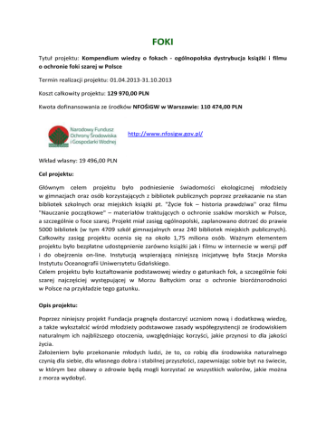 FOKI Tytuł projektu: Kompendium wiedzy o fokach - ogólnopolska dystrybucja książki i filmu o ochronie foki szarej w Polsce Termin realizacji projektu: 01.04.2013-31.10.2013 Koszt całkowity projektu: 129 970,00 PLN Kwota dofinansowania ze środków NFOŚiGW w Warszawie: 110 474,00 PLN http://www.nfosigw.gov.pl/ Wkład własny: 19 496,00 PLN Cel projektu: Głównym celem projektu było podniesienie świadomości ekologicznej młodzieży w gimnazjach oraz osób korzystających z bibliotek publicznych poprzez przekazanie na stan bibliotek szkolnych oraz miejskich książki pt. "Życie fok – historia prawdziwa" oraz filmu "Nauczanie początkowe" – materiałów traktujących o ochronie ssaków morskich w Polsce, a szczególnie o foce szarej. Projekt miał zasięg ogólnopolski, zaplanowano dotrzeć do prawie 5000 bibliotek (w tym 4709 szkół gimnazjalnych oraz 240 bibliotek miejskich publicznych). Całkowity zasięg projektu ocenia się na około 1,75 miliona osób. Ważnym elementem projektu było bezpłatne udostępnienie zarówno książki jak i filmu w internecie w wersji pdf i do obejrzenia on-line. Instytucją wspierającą niniejszą inicjatywę była Stacja Morska Instytutu Oceanografii Uniwersytetu Gdańskiego. Celem projektu było kształtowanie podstawowej wiedzy o gatunkach fok, a szczególnie foki szarej najczęściej występującej w Morzu Bałtyckim oraz o ochronie bioróżnorodności w Polsce na przykładzie tego gatunku. Opis projektu: Poprzez niniejszy projekt Fundacja pragnęła dostarczyć uczniom nową i dodatkową wiedzę, a także wykształcić wśród młodzieży podstawowe zasady współegzystencji ze środowiskiem naturalnym ich najbliższego otoczenia, uwzględniając korzyści, jakie przynosi to dla jakości życia. Założeniem było przekonanie młodych ludzi, że to, co robią dla środowiska naturalnego czynią dla siebie, dla własnego dobra i stabilnej przyszłości, zapewniając sobie byt na świecie, w którym bez obawy o zdrowie będą mogli korzystać ze wszystkich walorów, jakie można z morza wydobyć. Książka zawierająca kompendium wiedzy o chronionych fokach szarych oraz film dokumentalno-przyrodniczy „Nauczanie początkowe” stanowią doskonały materiał edukacyjny. Film został specjalnie przygotowany z myślą o emisji w czasie godziny lekcyjnej. Celem Fundacji jest udostępnienie książki wraz z filmem dla ogółu społeczeństwa, w szczególności dla uczniów szkół gimnazjalnych, ale również dla wszystkich bibliotek wojewódzkich. Wiedza dotycząca ochrony morskich ssaków w dalszym ciągu jest mało rozpowszechniona i niedostępna dla wielu uczniów. Realizowany projekt będzie miał za zadanie zmienić ten stan rzeczy i zachęcić do pogłębiania wiedzy i zainteresowań. Projekt, prócz wiedzy faktograficznej i popularyzacji gatunku będzie miał na celu dostarczyć zrozumienie dla potrzeby ochrony gatunków bytujących w Morzu Bałtyckim, w szczególności na kształtowaniu wzorców przyrodniczych wobec organizmów żywych i ich siedlisk. Poprzez realizację niniejszego projektu kreowane są proekologiczne postawy wobec zasobów przyrody nadmorskiej u młodzieży i ogółu społeczeństwa. Fundacja zachęca do pobrania tutaj uaktualnionej w ramach projektu wersji książki "Życie fok - prawdziwa historia".