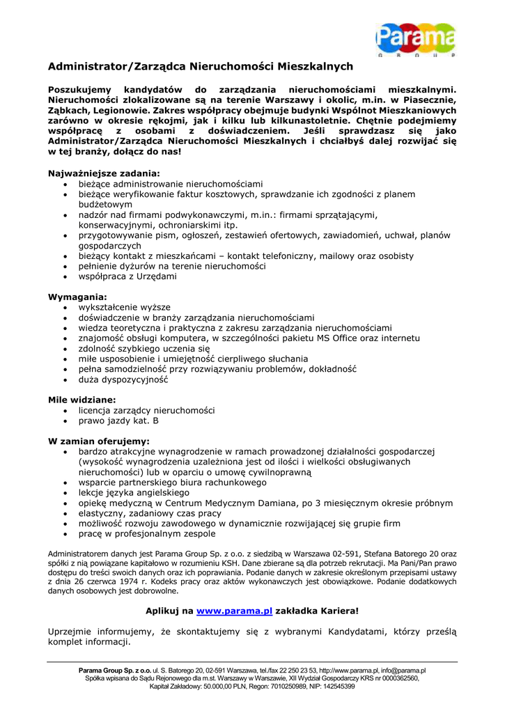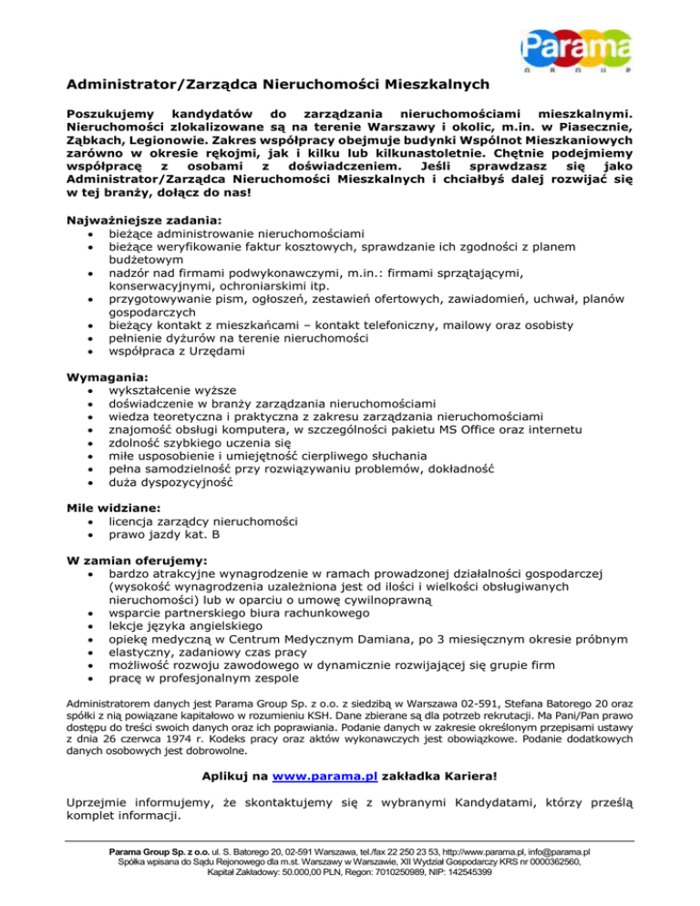 Administrator/Zarządca Nieruchomości Mieszkalnych Poszukujemy kandydatów do zarządzania nieruchomościami mieszkalnymi. Nieruchomości zlokalizowane są na terenie Warszawy i okolic, m.in. w Piasecznie, Ząbkach, Legionowie. Zakres współpracy obejmuje budynki Wspólnot Mieszkaniowych zarówno w okresie rękojmi, jak i kilku lub kilkunastoletnie. Chętnie podejmiemy współpracę z osobami z doświadczeniem. Jeśli sprawdzasz się jako Administrator/Zarządca Nieruchomości Mieszkalnych i chciałbyś dalej rozwijać się w tej branży, dołącz do nas! Najważniejsze zadania: • bieżące administrowanie nieruchomościami • bieżące weryfikowanie faktur kosztowych, sprawdzanie ich zgodności z planem budżetowym • nadzór nad firmami podwykonawczymi, m.in.: firmami sprzątającymi, konserwacyjnymi, ochroniarskimi itp. • przygotowywanie pism, ogłoszeń, zestawień ofertowych, zawiadomień, uchwał, planów gospodarczych • bieżący kontakt z mieszkańcami – kontakt telefoniczny, mailowy oraz osobisty • pełnienie dyżurów na terenie nieruchomości • współpraca z Urzędami Wymagania: • wykształcenie wyższe • doświadczenie w branży zarządzania nieruchomościami • wiedza teoretyczna i praktyczna z zakresu zarządzania nieruchomościami • znajomość obsługi komputera, w szczególności pakietu MS Office oraz internetu • zdolność szybkiego uczenia się • miłe usposobienie i umiejętność cierpliwego słuchania • pełna samodzielność przy rozwiązywaniu problemów, dokładność • duża dyspozycyjność Mile widziane: • licencja zarządcy nieruchomości • prawo jazdy kat. B W zamian oferujemy: • bardzo atrakcyjne wynagrodzenie w ramach prowadzonej działalności gospodarczej (wysokość wynagrodzenia uzależniona jest od ilości i wielkości obsługiwanych nieruchomości) lub w oparciu o umowę cywilnoprawną • wsparcie partnerskiego biura rachunkowego • lekcje języka angielskiego • opiekę medyczną w Centrum Medycznym Damiana, po 3 miesięcznym okresie próbnym • elastyczny, zadaniowy czas pracy • możliwość rozwoju zawodowego w dynamicznie rozwijającej się grupie firm • pracę w profesjonalnym zespole Administratorem danych jest Parama Group Sp. z o.o. z siedzibą w Warszawa 02-591, Stefana Batorego 20 oraz spółki z nią powiązane kapitałowo w rozumieniu KSH. Dane zbierane są dla potrzeb rekrutacji. Ma Pani/Pan prawo dostępu do treści swoich danych oraz ich poprawiania. Podanie danych w zakresie określonym przepisami ustawy z dnia 26 czerwca 1974 r. Kodeks pracy oraz aktów wykonawczych jest obowiązkowe. Podanie dodatkowych danych osobowych jest dobrowolne. Aplikuj na www.parama.pl zakładka Kariera! Uprzejmie informujemy, że skontaktujemy się z wybranymi Kandydatami, którzy prześlą komplet informacji. Parama Group Sp. z o.o. ul. S. Batorego 20, 02-591 Warszawa, tel./fax 22 250 23 53, http://www.parama.pl, [email protected] Spółka wpisana do Sądu Rejonowego dla m.st. Warszawy w Warszawie, XII Wydział Gospodarczy KRS nr 0000362560, Kapitał Zakładowy: 50.000,00 PLN, Regon: 7010250989, NIP: 142545399