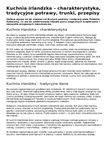 Kuchnia irlandzka – charakterystyka, tradycyjne potrawy, trunki, przepisy Zielona wyspa od lat stanowi cel licznych podróży i emigracji wielu Polaków. Zobaczmy, co ma do zaoferowania Irlandia prócz magicznych krajobrazów i niezwykle przyjaznych mieszkańców. Kuchnia Irlandzka – charakterystyka Na obecny wygląd kuchni irlandzkiej składa się długa i skomplikowana historia tego kraju, a także jej położenie geograficzne. Irlandia była krajem rolniczym, dlatego jej tradycyjne dania mają wiele cech kuchni wiejskiej. Początkowo jej podstawą było mięso, szczególnie wołowina i baranina oraz sery. Z biegiem czasu wprowadzono również warzywa takie jak ziemniaki, rzepa, marchew, pasternak, seler. W XVI wieku do Irlandii przybyły ziemniaki, które szybko stały się podstawą diety ludności wiejskiej. Było to tanie, pożywne warzywo o niskich wymaganiach uprawy. Niestety w XIX wieku, kraj nawiedziła klęska nieurodzaju spowodowana zarazą ziemniaczaną. Ludność uzależniona od tego warzywa cierpiała ogromny głód. Do dziś na kartach historii okres ten znany jest jako Wielki Głód, który zdziesiątkował mieszkańców Irlandii. Wielu umarło z głodu, bądź emigrowało, głównie do Stanów Zjednoczonych. Dziś dieta Irlandczyków nie jest tak bardzo zależna od ziemniaków, lecz nadal grają w niej dużą rolę. Irlandia jest wyspą, dlatego w jej tradycyjnej kuchni jest również duża obfitość ryb i owoców morza. Dania kuchni irlandzkiej są proste i pożywne. Może nie zaliczają się do najlżejszych jednak z pewnością dodają mnóstwo energii, a przy tym wyśmienicie smakują. Kuchnia irlandzka – tradycyjne dania Na wyspie najważniejszym posiłkiem jest śniadanie. W niektórych barach serwowane jest cały dzień. Stanowił najbardziej obfity posiłek dnia, który miał dawać energii na cały dzień pracy. W jego skład wchodzi smażony bekon, jajka sadzone, kiełbasa, biały lub czarny pudding (rodzaj kaszanki), pieczarki, do tego ciemny lub sodowy chleb, a także dla bardziej wymagających fasolka w sosie pomidorowym. Dziś mieszkańcy wyspy zastępują ciężkie śniadanie płatkami owsianymi z mlekiem. Kolejnym charakterystycznym daniem irlandzkim jest zestaw fish and chips bardzo dobrze znany również w kuchni angielskiej. Tradycyjnie posiłek ten pakowany był w gazety i stanowił szybką i pożywną przekąskę, którą można było zjeść w drodze. Składała się na nią ryba w cieście i frytki polane octem – co jest dość charakterystyczne dla Irlandii. W kuchni irlandzkiej dość ważne miejsce zajmują różnego rodzaje gulasze i strawy z baraniny i wołowiny z warzywami. Stanowią szybki i pożywny posiłek. Najbardziej znanym jest Irish stew, czyli gulasz z baraniny lub jagnięciny z duszonymi ziemniakami i cebulą, czasami z marchewką – zależy od regionu. W Dublinie najsłynniejsze jest Coddle, czyli potrawka z grubo pokrojonej kiełbasy i boczku, ziemniaków pokrojonych w plastry i cebuli. Niektórzy do potrawy dodają tradycyjnego Guiness’a. Wśród dań ziemniaczanych warto spróbować champ, czyli tłuczone ziemniaki podsmażane na maśle z cebulką. Kolejnym szybkim i pożywnym daniem jest Boxty, który przypomina nieco kebaba. Jest to ziemniaczany placek, w który zawija się kawałki wołowiny, surówek, a wszystko polane jest sosami. Jako przekąskę często serwuje się słodki chlebek wypełniony bakaliami zwany barm brack. Kuchnia irlandzka – trunki Życie towarzyskie w Irlandii rozgrywa się głównie w pubach, co wymusza z pewnością niezwykle kapryśna pogoda na wyspie. Najważniejszym trunkiem, bez którego spróbowania nie możecie opuścić Irlandii jest tradycyjny Guinness – rodzaj ciemnego, tradycyjnego, irlandzkiego piwa. Należy zapamiętać, aby nie poganiać barmana z nalewaniem tego trunku. Guinessa nalewa się długo i powoli, jednak cierpliwość wynagrodzona zostanie wyśmienitym smakiem piwa i gęstą pianą zwieńczającą kufel. Kolejnym tradycyjnym i niezwykle popularnym napojem alkoholowym jest Whiskey, przyrządzana według tradycyjnej receptury, stąd dodatkowe „e” w nazwie, aby odróżnić ją od zwykłej Whisky. Pije się ją bez żadnych dodatków, żadnej coli, a nawet lodu. W Irlandii często Whiskey dodaje się również do kawy. Na wyspie popularny jest również Baileys Irish Cream, czyli likier na bazie irlandzkiej whiskey, jaj, śmietany, wanilii, czekolady i orzechów. Pije się go z dodatkiem lodu, stanowi również dodatek do wielu drinków. Kuchnia irlandzka – przepisy Przepis na Irish stew Składniki: 1 kg baraniny bez kości, 40 dag cebuli, 1,5 kg ziemniaków, 2 marchewki, sól, pieprz, szczypta tymianku. Przygotowanie: Na patelnię położyć baraninę z tymiankiem, dodać zimną wodę, tak aby przykryła składniki. Gotować na małym ogniu przez godzinę. Dodać obraną wcześniej cebulę, ziemniaki i marchewkę. Doprawić solą i pieprzem. W dalszym ciągu gotować (aż warzywa zmiękną). Przyprawiać w miarę potrzeby. Można podawać samo lub z ugotowaną zieloną kapustą lub brukselką. rozwiń Przepis na Champ Składniki: 75 g masła, 125 ml mleka, 2 pory (można zastąpić cebulką szalotką), 6-8 ziemniaków, sól, pieprz. Przygotowanie: Wkładamy 25 g masła na patelnię, dodajemy mleko i stawimy na średnim ogniu. Mieszamy, aż masło stopi się i wrzucamy posiekany por. Zmniejszamy ogień i dusimy przez 10-15 min, aż por będzie miękki, od czasu do czasu mieszamy. Ziemniaki pokrojone w kawałki wrzucamy do dużego garnka z osoloną zimną wodą i doprowadzamy do wrzenia. Przykrywamy i gotujemy na wolnym ogniu przez 20 min, aż ziemniaki będą miękkie. Dokładnie odcedzamy. Do ziemniaków dodajemy por wraz z wywarem. Całość ucieramy, aż wszystkie składniki wymieszają się na kremową masę. Doprawiamy solą i pieprzem. Nakładamy masę ziemniaczaną na ogrzany półmisek, podczas nakładania ziemniaków na talerz, zamaczamy każdą porcj