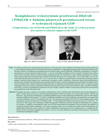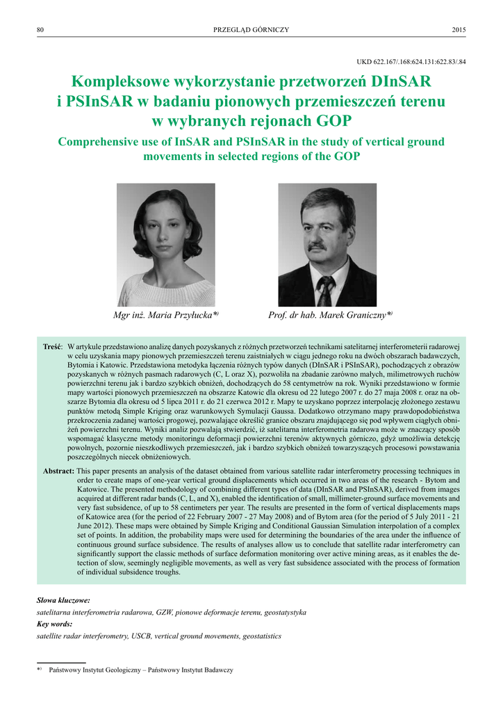 80 PRZEGLĄD GÓRNICZY 2015 UKD 622.167/.168:624.131:622.83/.84 Kompleksowe wykorzystanie przetworzeń DInSAR i PSInSAR w badaniu pionowych przemieszczeń terenu w wybranych rejonach GOP Comprehensive use of InSAR and PSInSAR in the study of vertical ground movements in selected regions of the GOP mgr inż. Maria Przyłucka*) prof. dr hab. Marek Graniczny*) Treść: W artykule przedstawiono analizę danych pozyskanych z różnych przetworzeń technikami satelitarnej interferometerii radarowej w celu uzyskania mapy pionowych przemieszczeń terenu zaistniałych w ciągu jednego roku na dwóch obszarach badawczych, Bytomia i Katowic. Przedstawiona metodyka łączenia różnych typów danych (DInSAR i PSInSAR), pochodzących z obrazów pozyskanych w różnych pasmach radarowych (C, L oraz X), pozwoliła na zbadanie zarówno małych, milimetrowych ruchów powierzchni terenu jak i bardzo szybkich obniżeń, dochodzących do 58 centymetrów na rok. Wyniki przedstawiono w formie mapy wartości pionowych przemieszczeń na obszarze Katowic dla okresu od 22 lutego 2007 r. do 27 maja 2008 r. oraz na obszarze Bytomia dla okresu od 5 lipca 2011 r. do 21 czerwca 2012 r. Mapy te uzyskano poprzez interpolację złożonego zestawu punktów metodą Simple Kriging oraz warunkowych Symulacji Gaussa. Dodatkowo otrzymano mapy prawdopodobieństwa przekroczenia zadanej wartości progowej, pozwalające określić granice obszaru znajdującego się pod wpływem ciągłych obniżeń powierzchni terenu. Wyniki analiz pozwalają stwierdzić, iż satelitarna interferometria radarowa może w znaczący sposób wspomagać klasyczne metody monitoringu deformacji powierzchni terenów aktywnych górniczo, gdyż umożliwia detekcję powolnych, pozornie nieszkodliwych przemieszczeń, jak i bardzo szybkich obniżeń towarzyszących procesowi powstawania poszczególnych niecek obniżeniowych. Abstract: This paper presents an analysis of the dataset obtained from various satellite radar interferometry processing techniques in order to create maps of one-year vertical ground displacements which occurred in two areas of the research - Bytom and Katowice. The presented methodology of combining different types of data (DInSAR and PSInSAR), derived from images acquired at different radar bands (C, L, and X), enabled the identification of small, millimeter-ground surface movements and very fast subsidence, of up to 58 centimeters per year. The results are presented in the form of vertical displacements maps of Katowice area (for the period of 22 February 2007 - 27 May 2008) and of Bytom area (for the period of 5 July 2011 - 21 June 2012). These maps were obtained by Simple Kriging and Conditional Gaussian Simulation interpolation of a complex set of points. In addition, the probability maps were used for determining the boundaries of the area under the influence of continuous ground surface subsidence. The results of analyses allow us to conclude that satellite radar interferometry can significantly support the classic methods of surface deformation monitoring over active mining areas, as it enables the detection of slow, seemingly negligible movements, as well as very fast subsidence associated with the process of formation of individual subsidence troughs. Słowa kluczowe: satelitarna interferometria radarowa, GZW, pionowe deformacje terenu, geostatystyka Key words: satellite radar interferometry, USCB, vertical ground movements, geostatistics *) Państwowy Instytut Geologiczny – Państwowy Instytut Badawczy Nr 3 PRZEGLĄD GÓRNICZY 1. Wprowadzenie Obniżenia terenu są jednym z ważniejszych wpływów podziemnej działalności górniczej na środowisko. Zasięg pionowej wartość składowej przemieszczeń zależy od wielu czynników, takich jak metoda wydobywania surowca, grubość, głębokość i nachylenie złoża, warunki geologiczne i tektoniczne, jak i czas prowadzenia eksploatacji. Z uwagi na złożoność procesu powstawania niecki obniżeniowej, najważniejsze parametry ruchu terenu oraz kryteria i wartości graniczne są trudne do wyznaczenia analitycznie i w większości są oparte na obserwacjach empirycznych już zaistniałych deformacji i zniszczeń budynków [1]. Obniżenia powodowane przez eksploatacje z zawałem stropu, występują nad miejscem prowadzonych prac na obszarze większym od zakresu eksploatowanego pokładu rozciągającym się ku górze i na zewnątrz od powierzchni roboczej, ograniczonym przez kąt wpływu od 8 do 45° w zależności od zagłębia węglowego [8]. W Polsce zjawisko obniżeń na terenach górniczych było przedmiotem badań między innymi [5, 23, 25, 27]. Górnośląskie Zagłębie Węglowe (GZW) jest jednym z największych zagłębi węglowych w Europie, gdzie aktywność górnicza rozpoczęła się już w XIX wieku i trwa do chwili obecnej. W okresie 1945÷1979 średnie wydobycie węgla było na poziomie 200 milionów ton na rok [23]. Począwszy od lat 80. rozpoczął się powolny spadek wydobycia, które w 2012 roku wynosiło 79 milionów ton [24].Wraz z rozwojem przemysłu, nastąpił gwałtowny rozwój miast i obecnie Górny Śląsk jest zamieszkały przez 3 miliony ludzi w 37 miastach. Najczęściej stosowanym systemem eksploatacji jest system ścianowy z zawałem stropu lub z podsadzką hydrauliczną. Obniżenie nad typową ścianą eksploatacyjną znajdującą się na głębokości 680 metrów, o wysokości 2,5 metra i długości od 250 do 400 metrów, sięga do 70% wysokości warstwy, co odpowiada największemu pionowemu przemieszczeniu 0,75 ÷ 2,0 m w centralnej części niecki obniżeniowej [13]. Z uwagi na eksploatację wielu pokładów, pionowe przemieszczenia na terenie GZW, dochodzą w niektórych miejscach do dzie- Rys. 1.Geograficzna lokalizacja obszarów badawczych Bytom i Katowice na tle granic obszarów górniczych (na podstawie [18]) Fig. 1. Geographical setting of the study areas with the boundaries of coal mining areas in Upper Silesia Coal Basin (based on the [