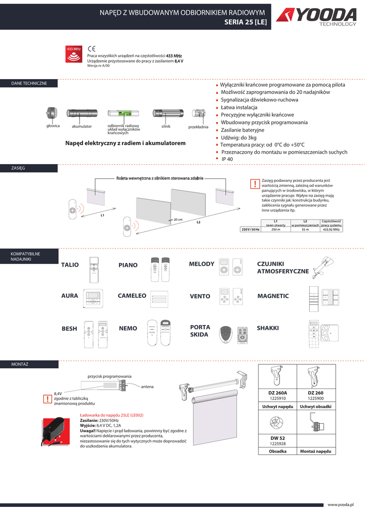 NAPĘD Z WBUDOWANYM ODBIORNIKIEM RADIOWYM SERIA 25 [LE] Praca wszystkich urządzeń na częstotliwości 433 MHz Urządzenie przystosowane do pracy z zasilaniem 8,4 V Wersja nr A/00 DANE TECHNICZNE głowica akumulator odbiornik radiowy układ wyłączników krańcowych silnik przekładnia Napęd elektryczny z radiem i akumulatorem Wyłączniki krańcowe programowane za pomocą pilota Możliwość zaprogramowania do 20 nadajników Sygnalizacja dźwiekowo-ruchowa Łatwa instalacja Precyzyjne wyłączniki krańcowe Wbudowany przycisk programowania Zasilanie bateryjne Udźwig: do 3kg Temperatura pracy: od 0°C do +50°C Przeznaczony do montażu w pomieszczeniach suchych IP 40 ZASIĘG Roleta wewnętrzna z silnikiem sterowana zdalnie KOMPATYBILNE NADAJNIKI Zasięg podawany przez producenta jest wartością zmienną, zależną od warunków panujących w środowisku, w którym urządzenie pracuje. Wpływ na zasięg mają takie czynniki jak: konstrukcja budynku, zakłócenia sygnału generowane przez inne urządzenia itp. TALIO PIANO MELODY CZUJNIKI ATMOSFERYCZNE AURA CAMELEO VENTO MAGNETIC BESH NEMO PORTA SKIDA SHAKKI MONTAŻ przycisk programowania antena 8,4V zgodnie z tabliczką znamionową produktu Ładowarka do napędu 25LE (LE002) Zasilanie: 230V/50Hz Wyjście: 8,4 V DC, 1,2A Uwaga!! Napięcie i prąd ładowania, powinnny być zgodne z wartościami deklarowanymi przez producenta, niezastosowanie się do tych wytycznych może doprowadzić do uszkodzenia akumulatora. DZ 260A DZ 260 1225910 1225900 Uchwyt napędu Uchwyt obsadki DW 52 1225928 Obsadka Montaż napędu www.yooda.pl NAPĘD Z WBUDOWANYM ODBIORNIKIEM RADIOWYM SERIA 25 [LE] Podczas programowania nadajników nieposiadających przycisku programowania jego funkcje pełni kombinacja klawiszy STOP + GÓRA. PROGRAMOWANIE PIERWSZEGO NADAJNIKA Wprowadzenie nowego nadajnika tą metodą spowoduje bezpowrotne skasowanie poprzednich ustawień. Dłuższa niż 10 sekund przerwa między kolejnymi wciśnięciami przycisku spowoduje automatyczne wyjście z trybu programowania bez wprowadzonych zmian. W przypadku nieudanej próby programowania napęd ponownie wprowadzamy w tryb programowania za pomocą przycisku programowania umieszczonego na głowicy napędu (patrz dane techniczne) OK DŹWIĘK „BIP” DŹWIĘK „BIP” Wcisnąć 1 raz przycisk GÓRA DŹWIĘK „BIP” Wcisnąć 1 raz przycisk DÓŁ Wcisnąć przycisk programowania na głowicy ZMIANA KIERUNKÓW PRACY NAPĘDU Roleta wyda dźwięk „BIP”. Urządzenie wykona krótkie ruchy GÓRA/ DÓŁ Wcisnąć przycisk programowania P2 jeden raz Wcisnąć przycisk programowania P2 drugi raz na tym samym pilocie (roleta wyda dźwiek „BIP”) Zatwierdzenie zmian Przycisk GÓRA steruje napędem zgodnie ze wskazówkami zegara OK Zatwierdzenie zmian Przycisk DÓŁ steruje napędem zgodnie ze wskazówkami zegara Roleta wyda kilka krótkich sygnałów dźwiekowych. Zmiana kierunków podczas programowania pierwszego nadajnika została opisana w punkcie: „programowanie pierwszego nadajnika” na stronie nr 2. Kierunek pracy można też zamienić za pomocą przycisku programowania, znajdującego się na głowicy napędu. Wciskamy przycisk programowania i trzymamy go przez ok. 6 sekund. Napęd wykona 2 krótkie ruchy góra dół, co jest potwierdzeniem zmiany kierunków pracy. Jeżeli chcemy wrócić do poprzedniego ustawienia, wykonujemy wyżej opisaną czynność jeszcze raz. PROGRAMOWANIE KOLEJNEGO NADAJNIKA Należy pamiętać aby podczas dodawania nadajnika nie wciskać przycisku programowania na głowicy napędu. DŹWIĘK „BIP” Wcisnąć 1 raz przycisk programowania (P2) na pilocie A. KASOWANIE PAMIĘCI ODBIORNIKA Roleta wyda dźwięk „BIP”. Urządzenie wykona krótkie ruchy GÓRA/ DÓŁ Wcisnąć 1 raz przycisk programowania (P2) na pilocie A. Wcisnąć 1 raz przycisk programowania (P2) na pilocie B. Pilot został zaprogramowany. Roleta wyda kilka krótkich sygnałów dźwiekowych. Kasowanie pamięci oznacza wykasowanie wszystkich kodów z pamięci urządzenia, łącznie z położeniami krańcowymi. Należy pamiętać aby podczas kasowania nie wciskać przycisku programowania na głowicy napędu. DŹWIĘK „BIP” Wcisnąć 1 raz przycisk programowania (P2) na dowolnym pilocie. Roleta wyda dźwięk „BIP”. Urządzenie wykona krótkie ruchy GÓRA/ DÓŁ Wcisnąć przycisk STOP na tym samym pilocie Wcisnąć 1 raz przycisk programowania (P2) na tym samym pilocie. Roleta wykona dwa ruchy GÓRA/DÓŁ i wyda kilka krótkich sygnałów dźwiekowych Wszystkie aktywne nadajniki zostały usunięte z pamięci www.yooda.pl NAPĘD Z WBUDOWANYM ODBIORNIKIEM RADIOWYM SERIA 25 [LE] Podczas programowania nadajników nieposiadających przycisku programowania jego funkcje pełni kombinacja klawiszy STOP + GÓRA. PROGRAMOWANIE NADAJNIKÓW AURA Tylko w trybie pracy ręcznej. Wprowadzenie nowego nadajnika tą metodą spowoduje bezpowrotne skasowanie poprzednich ustawień. Dłuższa niż 10 sekund przerwa między kolejnymi wciśnięciami przycisku spowoduje automatyczne wyjście z trybu programowania bez wprowadzonych zmian. OK DŹWIĘK „BIP” Wcisnąć przycisk programowania na głowicy AKTYWACJA TRYBU PROGRAMOWANIA POŁOŻEŃ KRAŃCOWYCH DŹWIĘK „BIP” Wcisnąć przycisk programowania P2 jeden raz Roleta wyda dźwięk „BIP”. Urządzenie wykona krótkie ruchy GÓRA/ DÓŁ DŹWIĘK „BIP” Wcisnąć 1 raz przycisk GÓRA Wcisnąć 1 raz przycisk DÓŁ Wcisnąć przycisk programowania P2 drugi raz Zatwierdzenie zmian Przycisk GÓRA steruje napędem zgodnie ze wskazówkami zegara OK Roleta wyda kilka krótkich sygnałów dźwiekowych. Zatwierdzenie zmian Przycisk DÓŁ steruje napędem zgodnie ze wskazówkami zegara Aby zaprogramować położenia krańcowe należy wprowadzić napęd w tryb programowania tych położeń. Dłuższa niż 10 sekund przerwa między kolejnymi wciśnięciami spowoduje automatyczne wyjście z trybu programowania bez zapisanych zmian. Należy pamiętać aby podczas programow