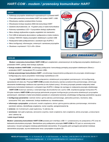 HART-COM - modem / przenośny komunikator HART CECHY ● Kalibracja przyrządów obiektowych wyposażonych w protokół HART ● Praca jako przenośny komunikator HART lub modem HART / USB ● Wbudowany zasilacz przetworników 2-przew. ● Wbudowana funkcja rezystora 250Ω dla komunikacji HART ● Zasilanie akumulatorowe, ok. 15 godzin pracy w trybie komunikatora ● Kolorowy wyświetlacz LCD + 5 przycisków obsługi użytkownika ● Menu obsługi użytkownika w języku angielskim lub niemieckim ● Port USB do ładowania akumulatora i podłączenia w trybie modemu ● Izolacja 1000VDC między przyrządem obiektowym a portem USB ● Rozłączalne kable podłączeniowe z zaciskami typu KLEPS 2 ● Menu konfiguracji, informacyjne, zmiennych i serwisowe przyrządów ● Obudowa o wymiarach 112,5 x 65 x 32mm 3 LATA GWARANCJI OGÓLNE Modem / przenośny komunikator HART-COM jest urządzeniem, przeznaczonym do konfiguracji przyrządów obiektowych z protokołem HART, pełniąc dwie funkcje użytkowe: funkcje modemu HART/USB: umożliwiając podłączenie i komunikację pomiędzy przyrządami obiektowymi (Slave) z protokołem HART i komputerem PC (z portem USB). funkcje przenośnego komunikatora HART: umożliwiając bezpośrednie podłączenie do przyrządu obiektowego i konfigurację przy użyciu przycisków i kolorowego wyświetlacza LCD. Przyrząd HART-COM umożliwia zdalne połączenie z obiektowymi przyrządami pomiarowymi, ich konfigurację, sprawdzenie ich stanu itp. Przyrząd HART-COM posiada wbudowany zasilacz przetwornika pomiarowego, eliminując stosowanie dodatkowego zasilacza oraz opornika (w obu trybach pracy). Od strony przyrządu posiada rozłączalny kabel zakończony końcówkami testowymi z uchwytami typu KLEPS 2, dlatego nie wymaga on rozłączania przyrządu obiektowego. HART-COM może być zasilany z wewnętrznego akumulatorka lub z portu USB, współpracującego komputera PC. W trybie modemu HART-COM wykorzystuje jakikolwiek program konfiguracyjny producenta obiektowych przyrządów pomiarowych, natomiast w trybie komunikatora posiada on uniwersalne komendy umożliwiając konfigurację parametrów wg grup: konfiguracja parametrów: wartość dolna i górna zakresu pomiarowego, jednostka pomiaru, tłumienie, data, oznaczenie TAG, opis, wiadomość, funkcja dodatkowa np. charakterystyka. informacje o przyrządzie: producent, model urządzenia, dolna i górna granica zakresu pomiarowego, minimalna szerokość zakresu, identyfikacja urządzenia, numer czujnika, oprogramowanie itp. zmienne: do 4 zmiennych, prąd wyjściowy, % zakresu itp. serwisowe: test pętli prądowej, zerowanie czujnika, reset urządzenia, test urządzenia, adres przyrządu, przesunięcie zera i zakresu itp. i wiele innych funkcji. Modem / przenośny komunikator HART-COM posiada port interfejsu USB 1.1; przeznaczony do połączenia z PC oraz do ładowania akumulatora przyrządu. Standardowo przy podłączeniu przyrządu HART-COM do PC jest on automatycznie wykrywany i nie jest wymagana instalacja jakichkolwiek sterowników. W przypadku jeśli wymagana jest jednak instalacja sterowników przyrządu, są one dostarczone wraz z przyrządem na płycie CD. NEGELAP-Automatyka ● ul. Kukułek 26 ● 41-200 Sosnowiec ● Tel./Fax.: (+48 32) 299 51 22; 299 62 69; 290 65 77 http://www.negelap.com ● e-mail: [email protected]; [email protected] HART-COM - modem / przenośny komunikator HART SPECYFIKACJA USB Złącze port mini USB; rozłączalny kabel mini USB / USB w dostawie Zgodność ze standardem USB1.1; USB 2.0 HART Złącze gniazdo BNC Kable podłączeniowe rozłączalne kable podłączeniowe, zakończone zaciskami typu KLEPS 2 Protokół komunikacji HART, rev. 5 Zasilacz przetwornika 2-przew. min. 12VDC / 22mA (funkcja włącz. / wyłącz. lub tryb oszczędz. energii) Obsługa użytkownika Wyświetlacz LCD, kolorowy, graficzny Przyciski 4 przyciski obsługi użytkownika Język obsługi / komunikatów angielski / niemiecki, przełączalny Komunikaty / ikony wskaźnik stanu i ładowania akumulatorka, wskaźnik zasilania przetwornika Warunki pracy Zasilanie Pobór prądu z portu USB akumulatorek bateria 9V (6LR61, 6F22) lub akumulatorek 8,4V port USB ładowarka 230VAC lub po podłączeniu do PC max. 140mA z zasilaniem podłączonego przetwornika max. 30mA bez zasilania podłączonego przetwornika max. 100mA podczas ładowania akumulatorka Czas pracy na akumulatorku do 4 godzin z zasilaniem podłączonego przetwornika do 15 godzin bez zasilania przetwornika Czas ładowania akumulatorka ok. 10 godzin Temperatura pracy / otoczenia -20…+60oC Temperatura przechowywania -20…+60oC Wilgotność względna 0...80%RH, bez kondensacji Położenie podczas pracy dowolne Wersja obudowy przenośna (zaczep do paska) / wolnostojąca (stojak obudowy) Normy EN 61326-1 Materiał obudowy tworzywo sztuczne ABS Izolacja wejścia / wyjścia 1000VDC (1kV), między przyrządem HART a portem USB Wymiary obudowy 112,5 x 65 x 32mm Stopień ochrony obudowy IP40 (złącza zaciskowe IP00) Sterowniki - płyta CD Płyta CD w dostawie zawiera m.in. sterowniki dla Windows 98, ME, 2000, XP, Vista, Win7 instrukcję obsługi w języku polskim uniwersalne oprogramowanie konfiguracyjne dla przyrządów HART UWAGI: ● Do komunikacji z przyrządami obiektowymi HART należy użyć rezystora ≥250Ω lub włączyć funkcję rezystora w menu przyrządu HART-COM. ● Do zasilania przyrządu obiektowego HART można użyć wbudowanego zasilacza przetwornika 2-przew. lub zewnętrznego zasilacza pętli prądowej. NEGELAP-Automatyka ● ul. Kukułek 26 ● 41-200 Sosnowiec ● Tel./Fax.: (+48 32) 299 51 22; 299 62 69; 290 65 77 http://www.negelap.com ● e-mail: [email protected]; [email protected] HART-COM - modem / przenośny komunikator HART SCHEMAT BLOKOWY WYMIARY WYŚWIETLACZ - WIDOK EKRANU Tytuł menu Wskaźnik wyboru Tytuł pozycji Widok wskazania wyświetlacza w menu głównym Wartość pozycji Ikona głównego menu Ładowanie akumulatora Widok wskazan