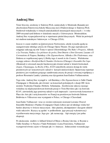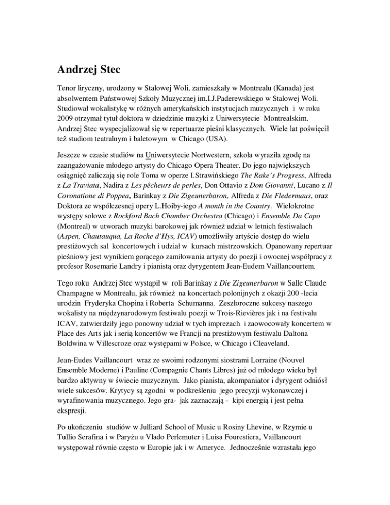 Andrzej Stec Tenor liryczny, urodzony w Stalowej Woli, zamieszkały w Montrealu (Kanada) jest absolwentem Państwowej Szkoły Muzycznej im.I.J.Paderewskiego w Stalowej Woli. Studiował wokalistykę w różnych amerykańskich instytucjach muzycznych i w roku 2009 otrzymał tytuł doktora w dziedzinie muzyki z Uniwersytecie Montrealskim. Andrzej Stec wyspecjalizował się w repertuarze pieśni klasycznych. Wiele lat poświęcił też studiom teatralnym i baletowym w Chicago (USA). Jeszcze w czasie studiów na Uniwersytecie Nortwestern, szkoła wyraziła zgodę na zaangażowanie młodego artysty do Chicago Opera Theater. Do jego największych osiągnięć zaliczają się role Toma w operze I.Strawińskiego The Rake’s Progress, Alfreda z La Traviata, Nadira z Les pêcheurs de perles, Don Ottavio z Don Giovanni, Lucano z Il Coronatione di Poppea, Barinkay z Die Zigeunerbaron, Alfreda z Die Fledermaus, oraz Doktora ze współczesnej opery L.Hoiby-iego A month in the Country. Wielokrotne występy solowe z Rockford Bach Chamber Orchestra (Chicago) i Ensemble Da Capo (Montreal) w utworach muzyki barokowej jak również udział w letnich festiwalach (Aspen, Chautauqua, La Roche d’Hys, ICAV) umożliwiły artyście dostęp do wielu prestiżowych sal koncertowych i udział w kursach mistrzowskich. Opanowany repertuar pieśniowy jest wynikiem gorącego zamiłowania artysty do poezji i owocnej współpracy z profesor Rosemarie Landry i pianistą oraz dyrygentem Jean-Eudem Vaillancourtem. Tego roku Andrzej Stec wystąpił w roli Barinkay z Die Zigeunerbaron w Salle Claude Champagne w Montrealu, jak również na koncertach polonijnych z okazji 200 -lecia urodzin Fryderyka Chopina i Roberta Schumanna. Zeszłoroczne sukcesy naszego wokalisty na międzynarodowym festiwalu poezji w Trois-Rievières jak i na festivalu ICAV, zatwierdziły jego ponowny udział w tych imprezach i zaowocowały koncertem w Place des Arts jak i serią koncertów we Francji na prestiżowym festiwalu Daltona Boldwina w Villescroze oraz występami w Polsce, w Chicago i Cleaveland. Jean-Eudes Vaillancourt wraz ze swoimi rodzonymi siostrami Lorraine (Nouvel Ensemble Moderne) i Pauline (Compagnie Chants Libres) już od młodego wieku był bardzo aktywny w świecie muzycznym. Jako pianista, akompaniator i dyrygent odniósł wiele sukcesów. Krytycy są zgodni w podkreśleniu jego precyzji wykonawczej i wyrafinowania muzycznego. Jego gra- jak zaznaczają - kipi energią i jest pełna ekspresji. Po ukończeniu studiów w Julliard School of Music u Rosiny Lhevine, w Rzymie u Tullio Serafina i w Paryżu u Vlado Perlemuter i Luisa Fourestiera, Vaillancourt występował równie często w Europie jak i w Ameryce. Jednocześnie wzrastała jego popularność jako pedagoga. Prowadził klasy muzyki kameralnej i akompaniamentu, a w 1974 roku dodatkowo założył na Montrealskim Uniwersytecie klasę EnsembleClaviers. Wiele grup kameralnych jak i duetów fortepianowych zawdzięcza profesorowi Vaillancourt rozwój muzyczny i zdobyte laury na międzynarodowych konkursach.