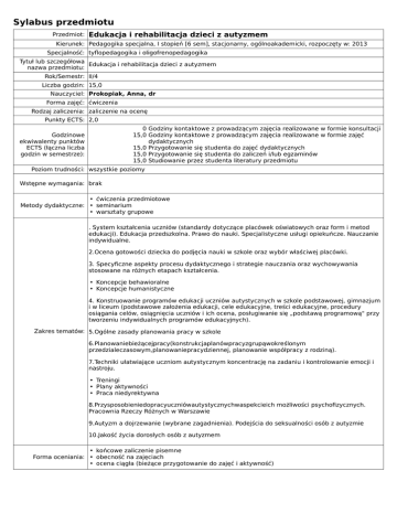 Sylabus przedmiotu Przedmiot: Edukacja i rehabilitacja dzieci z autyzmem Kierunek: Pedagogika specjalna, I stopień [6 sem], stacjonarny, ogólnoakademicki, rozpoczęty w: 2013 Specjalność: tyflopedagogika i oligofrenopedagogika Tytuł lub szczegółowa Edukacja i rehabilitacja dzieci z autyzmem nazwa przedmiotu: Rok/Semestr: II/4 Liczba godzin: 15,0 Nauczyciel: Prokopiak, Anna, dr Forma zajęć: ćwiczenia Rodzaj zaliczenia: zaliczenie na ocenę Punkty ECTS: 2,0 0 Godziny kontaktowe z prowadzącym zajęcia realizowane w formie konsultacji 15,0 Godziny kontaktowe z prowadzącym zajęcia realizowane w formie zajęć dydaktycznych 15,0 Przygotowanie się studenta do zajęć dydaktycznych 15,0 Przygotowanie się studenta do zaliczeń i/lub egzaminów 15,0 Studiowanie przez studenta literatury przedmiotu Godzinowe ekwiwalenty punktów ECTS (łączna liczba godzin w semestrze): Poziom trudności: wszystkie poziomy Wstępne wymagania: brak • ćwiczenia przedmiotowe Metody dydaktyczne: • seminarium • warsztaty grupowe . System kształcenia uczniów (standardy dotyczące placówek oświatowych oraz form i metod edukacji). Edukacja przedszkolna. Prawo do nauki. Specjalistyczne usługi opiekuńcze. Nauczanie indywidualne. 2.Ocena gotowości dziecka do podjęcia nauki w szkole oraz wybór właściwej placówki. 3. Specyficzne aspekty procesu dydaktycznego i strategie nauczania oraz wychowywania stosowane na różnych etapach kształcenia. • Koncepcje behawioralne • Koncepcje humanistyczne 4. Konstruowanie programów edukacji uczniów autystycznych w szkole podstawowej, gimnazjum i w liceum (podstawowe założenia edukacji, cele edukacyjne, treści edukacyjne, procedury osiągania celów, osiągnięcia uczniów i ich ocena, posługiwanie się „podstawą programową" przy tworzeniu indywidualnych programów edukacyjnych). Zakres tematów: 5.Ogólne zasady planowania pracy w szkole 6.Planowaniebieżącejpracy(konstrukcjaplanówpracyzgrupąwokreślonym przedzialeczasowym,planowaniepracydziennej, planowanie współpracy z rodziną). 7.Techniki ułatwiające uczniom autystycznym koncentrację na zadaniu i kontrolowanie emocji i nastroju. • Treningi • Plany aktywności • Praca niedyrektywna 8.Przysposobieniedopracyuczniówautystycznychwaspekcieich możliwości psychofizycznych. Pracownia Rzeczy Różnych w Warszawie 9.Autyzm a dojrzewanie (wybrane zagadnienia). Podejścia do seksualności osób z autyzmie 10.Jakość życia dorosłych osób z autyzmem • końcowe zaliczenie pisemne Forma oceniania: • obecność na zajęciach • ocena ciągła (bieżące przygotowanie do zajęć i aktywność) Studentka/student Wiedza 1. Analizuje potrzeby osoby z autyzmem, możliwości rozwoju jej autonomii, personalizacji i socjalizacji 2. Zna różnorodne metody pracy z osobami z autyzmem i dobiera je odpowiednio do możliwości ucznia i środowiska 3. Zna zasady konstruowania indywidualnych programów edukacyjno-terapeutycznych Warunki zaliczenia: Umiejętności: 1. Potrafi planować w zespole indywidualne programy edukacyjno-terapeutyczne w ramach aktywności indywidualnej i zespołowej osób z autyzmem 2. Stosuje techniki modyfikowania zachowania 3. Konstruuje sytuacje wychowawcze wykorzystując wspomagające sposoby porozumiewania się Postawy: 1. Szanuje i zaspokaja specyficzne potrzeby osób z autyzmem 2. Wspiera indywidualny rozwój autonomii każdej osoby z autyzmem Jest świadomy konieczności współpracy ze wszystkimi specjalistami pracującymi z uczniem Literatura podstawowa: Notbohn Ellen, 10 rzeczy, o których chciałoby ci powiedzieć dziecko z autyzmem. Świat Książki 2009. Olechnowicz Hanna, Wokół autyzmu Fakty skojarzenia refleksje. WSiP 2004. Literatura: Sutton Carole, Jak radzić sobie z trudnymi zachowaniami u dzieci. SYNAPSIS 2009. Literatura uzupełniająca: De Lercq Hilde, Autyzm od wewnątrz – przewodnik. SYNAPSIS, Fraszka Edukacyjna 2007. Shore Stephen, Za ścianą Osobiste doświadczenia z autyzmem i zespołem Aspergera. KTA 2008. Winczura Barbara, Dziecko z autyzmem Terapia deficytów poznawczych a teoria umysłu. Impuls 2008. Dodatkowe informacje: brak