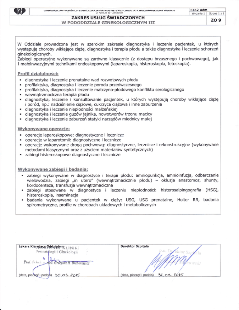 GINEKOLOGICZNO - POŁOŻNICZY SZPITAL KLINICZNY UNIWERSYTETU MEDYCZNEGO IM. K. MARCINKOWSKIEGO W POZNANIU ul. Polna 33/ 60 . 535 PozĄań ZAKRES USŁUG SWIADCZONYCH W Ps§§sD§I&ŁE GINEK0LOGICZI§YM InI i prowadzona jest w szerokim zakresie diagnosĘka leczenie pacjentek, u których występują choroby wikłające ciążę, diagnosĘka i terapia płodu a także diagnostyka i leczenie schorzeń ginekologicznych. Zabiegi operacyjne wykonywane są zarówno klasycznie (z dostępu brzusznego i pochwowego), jak i małoinwazyjnymi technikami endoskopowymi (laparoskopia, histeroskopia, fetoskopia), W Oddziale ProfiLdeiałaEąEśg"E; diagnosĘka i leczenie prenatalne wad rozwojowych płodu profilakĘka, diagnosĘka i leczenie porodu przedwczesnego profilaktyka, diagnosĘka i leczenie matczyno-płodowego konfliktu serologicznego wewnątrzmaciczna terapia płodu diagnosĘka, leczenie i konsultowanie pacjenteĘ u których występują choroby wikłające ciązę i poród, np.: nadciśnienie ciązowe, cukrzyca ciązowa i inne zaburzenia diagnosĘka i leczenie niepłodnościmałzeńskiej diagnosĘka i leczenie guzów jajnika, nowotworów trzonu macicy diagnosĘka i leczenie zaburzeń statyki narządów miednicy małej . . . . . . . . lńJykon§wą ne operaqię . . . . ; operacje laparoskopowe: diagnosĘczne i lecznicze operacje w laparotomii: diagnosĘczne i lecznicze operacje wykonywane drogą pochwową: diagnosĘczne, lecznicze i rekonstrukcyjne (wykonywane metodami klasycznymi oraz z użyciem materiałów synteĘcznych) zabiegi histeroskopowe diagnosĘczne i lecznicze Wvkortsganeza bieg i t bedanla . . . ł zabiegi wykonywane w diagnostyce i terapii płodu: amniopunkcja, amnioinfuzja, odbarczanie wielowodzia, zabiegi .in utero" (wewnątrzmacicznie płodu) okluzja anastomoz, shunĘ, kordocenteza, tra nsfuzja wewnątrzmaciczna zabiegi stosowane w diagnosĘce histeroskopia, inseminacja badania wykonywane u pacjentek i leczeniu niepłodnoŚci: histerosalpingografla (HSG), w ciąży: USG, USG prenatalne, Holter RR, badania spirometryczne, profile w chorobach układowych i metabolicznych
