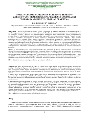 SYMPOSIUM EUROPÉEN – SYMPOZJUM EUROPEJSKIE – EUROPEAN SYMPOSIUM PROBLEMES ACTUELS DE LA PROTECTION CONTRE LES INONDATIONS WSPÓŁCZESNE PROBLEMY OCHRONY PRZECIWPOWODZIOWEJ ANTI-FLOOD DEFENCES - TODAY’S PROBLEMS Paris – Orléans 28-29-30.03.2012 MOŻLIWOŚCI OGRANICZANIA ZABUDOWY TERENÓW ZALEWOWYCH PRZEZ REGIONALNE ZARZĄD GOSPODARKI WODNEJ W KRAKOWIE - TEORIA I PRAKTYKA KONDZIOŁKA K.1, RYŁKO A.1 1 Regionalny Zarząd Gospodarki Wodnej w Krakowie; 31-109 Kraków, ul. Marszałka J.Piłsudskiego 22;Polska e-mail: [email protected] ; [email protected] Streszczenie : Referat przedstawia działania RZGW w Krakowie w zakresie profilaktyki przeciwpowodziowej w aspekcie ograniczania zabudowy na terenach zalewowych. Przedstawia uwarunkowania prawne w tym zakresie oraz ich zmienność w czasie. Opisuje w jaki sposób instytucja poszukiwała źródeł finansowania studiów wyznaczających granice obszarów bezpośredniego zagrożenia powodzią oraz studiów ochrony przeciwpowodziowej. Pokazuje również w skrócie zawartość merytoryczną i zakres obszarowy powyższych opracowań. Definiuje etapy działań administracyjnych w ramach których istnieje możliwość wprowadzania informacji o zagrożeniu powodziowym. Szczegółowo opisuje rodzaje analiz gisowych i modelowych wykorzystywanych na etapie opiniowania wpływających do instytucji załączników graficznych do dokumentów planistycznych, a także wskazuje na wprowadzane kluczowe zmiany w częściach tekstowych dokumentów. Zwraca uwagę na przyjęte w tym zakresie standardy działań. Przedstawia bazę danych dotyczącą dokumentów planistycznych z zakresu zagospodarowania przestrzennego dla obszarów zagrożonych powodzią. Opisuje jej funkcjonalność oraz zakres gromadzonych w niej informacji. W dalszej kolejności odnosi się do analizy statystycznej opiniowanych dokumentów zarówno w aspekcie ilościowym, jak i przestrzennym wskazując na stosunkowo dużą skuteczność działań RZGW w zakresie ograniczania zabudowy na terenach zagrożonych powodzią. Kreśli również perspektywę zmian wynikających z wejścia w życie Dyrektywy 2007/60/WE Parlamentu Europejskiego i Rady z dnia 23.10.2007 r. w sprawie oceny ryzyka powodziowego i zarządzania nim i konsekwencji wprowadzenia produktów dyrektywy (mapy zagrożenia powodziowego) dla działań administracyjnych w ograniczaniu strat powodziowych. Słowa kluczowe: ochrona przeciwpowodziowa, ograniczanie zabudowy Abstract : The paper presents actions of RZGW in Krakow in the scope of flood protection prevention in the aspect of limiting a building development within floodplains. It presents legal conditions in this scope and their variability in time. It describes in what manner the institution looked for sources of financing the studies determining the limits of direct flood hazard areas and flood protection studies. It shortly shows a subject contents and area limit of the above studies. It defines stages of administrative actions under which there is possibility to put in information on flood hazard. The paper describes in details type of GIS and modelling analyses used on the stage of giving an opinion on graphic enclosures to planning documents submitted to the institution as well as indicates introduced key changes in the parts of text documents. It draws an attention on standards of actions accepted in this scope. It presents a data base concerning planning documents regarding land development on the areas threatened by flood. Furthermore, it refers to statistic analysis of documents on which an opinion is given both in quantitative and spatial aspect, indicating on relatively considerable efficiency of the RZGW actions in the scope of limiting a building development on the areas threatened by flood. It also outlines a perspective of changes resulting from the Directive 2007/60/EC of the European Parliament and of the Council dated 23.10.2007 on the assessment and management of flood risks, which came into force and consequences of entering the products of the directive (flood hazard maps) to administrative actions in mitigating the flood losses. Key words: flood protection, limiting of buildings development Wstęp Obowiązujące w Polsce prawodawstwo odnoszące się do problematyki ograniczania zabudowy terenów zalewowych reprezentowane jest przez dwie ustawy. Pierwsza z nich to Ustawa o planowaniu i zagospodarowaniu przestrzennym z dnia 27 marca 2003r., druga to - Ustawa z dnia 1 SYMPOSIUM EUROPÉEN – SYMPOZJUM EUROPEJSKIE – EUROPEAN SYMPOSIUM PROBLEMES ACTUELS DE LA PROTECTION CONTRE LES INONDATIONS WSPÓŁCZESNE PROBLEMY OCHRONY PRZECIWPOWODZIOWEJ ANTI-FLOOD DEFENCES - TODAY’S PROBLEMS Paris – Orléans 28-29-30.03.2012 18 lipca 2001r. Prawo wodne. To właśnie zapisy drugiej z wymienionych powyżej ustaw umożliwiły dyrektorom regionalnych zarządów gospodarki wodnej działania w zakresie eliminowania planowanej zabudowy w terenach zagrożonych powodzią a tym samym minimalizowanie ewentualnych strat powodziowych. Pierwotne zapisy ustawy z dnia 18 lipca 2001r. Prawo wodne, narzucały bowiem na dyrektorów RZGW obowiązek sporządzania dla obszarów nieobwałowanych tzw. studiów określających w szczególności wyznaczenie „granic bezpośredniego zagrożenia powodzią, uwzględniających częstotliwość występowania powodzi, ukształtowanie dolin rzecznych i tarasów zalewowych, strefę przepływu wezbrań powodziowych, tereny zagrożone osuwiskami skarp lub zboczy, tereny depresyjne oraz bezodpływowe” /Art. 82 ust. 2 Ustawy z dnia 18 lipca 2001r. Prawo wodne (Dz.U. z 2005r. nr 239 poz. 2019)/. Zakres i tytuł w/w dokumentu zmieniony został już po 4 latach nowelą ustawy Prawo wodne wprowadzoną w czerwcu 2005 roku, kiedy to studium dla obszarów nieobwałowanych zastąpione zostało tzw. studium ochrony przeciwpowodziowej ustalającym „granice zasięgu wód powodziowych o określonym prawdopodobieństwie występowania oraz kierunki ochrony prze