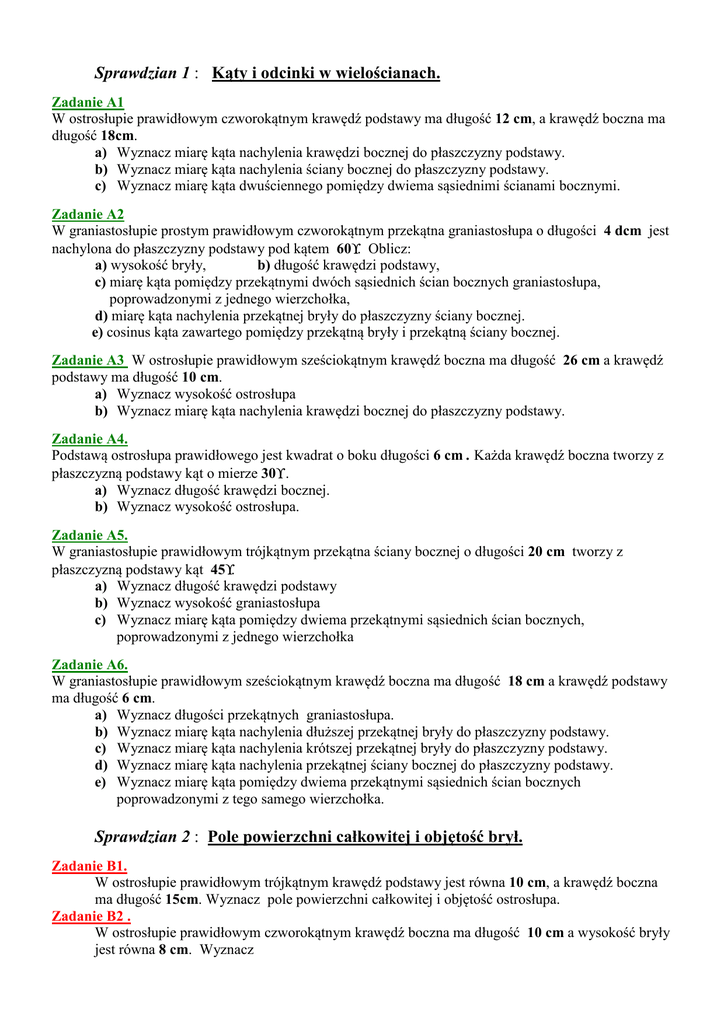 Sprawdzian 1 : Kąty i odcinki w wielościanach. Zadanie A1 W ostrosłupie prawidłowym czworokątnym krawędź podstawy ma długość 12 cm, a krawędź boczna ma długość 18cm. a) Wyznacz miarę kąta nachylenia krawędzi bocznej do płaszczyzny podstawy. b) Wyznacz miarę kąta nachylenia ściany bocznej do płaszczyzny podstawy. c) Wyznacz miarę kąta dwuściennego pomiędzy dwiema sąsiednimi ścianami bocznymi. Zadanie A2 W graniastosłupie prostym prawidłowym czworokątnym przekątna graniastosłupa o długości 4 dcm jest nachylona do płaszczyzny podstawy pod kątem 60°. Oblicz: a) wysokość bryły, b) długość krawędzi podstawy, c) miarę kąta pomiędzy przekątnymi dwóch sąsiednich ścian bocznych graniastosłupa, poprowadzonymi z jednego wierzchołka, d) miarę kąta nachylenia przekątnej bryły do płaszczyzny ściany bocznej. e) cosinus kąta zawartego pomiędzy przekątną bryły i przekątną ściany bocznej. Zadanie A3 W ostrosłupie prawidłowym sześciokątnym krawędź boczna ma długość 26 cm a krawędź podstawy ma długość 10 cm. a) Wyznacz wysokość ostrosłupa b) Wyznacz miarę kąta nachylenia krawędzi bocznej do płaszczyzny podstawy. Zadanie A4. Podstawą ostrosłupa prawidłowego jest kwadrat o boku długości 6 cm . Każda krawędź boczna tworzy z płaszczyzną podstawy kąt o mierze 30° . a) Wyznacz długość krawędzi bocznej. b) Wyznacz wysokość ostrosłupa. Zadanie A5. W graniastosłupie prawidłowym trójkątnym przekątna ściany bocznej o długości 20 cm tworzy z płaszczyzną podstawy kąt 45°. a) Wyznacz długość krawędzi podstawy b) Wyznacz wysokość graniastosłupa c) Wyznacz miarę kąta pomiędzy dwiema przekątnymi sąsiednich ścian bocznych, poprowadzonymi z jednego wierzchołka Zadanie A6. W graniastosłupie prawidłowym sześciokątnym krawędź boczna ma długość 18 cm a krawędź podstawy ma długość 6 cm. a) Wyznacz długości przekątnych graniastosłupa. b) Wyznacz miarę kąta nachylenia dłuższej przekątnej bryły do płaszczyzny podstawy. c) Wyznacz miarę kąta nachylenia krótszej przekątnej bryły do płaszczyzny podstawy. d) Wyznacz miarę kąta nachylenia przekątnej ściany bocznej do płaszczyzny podstawy. e) Wyznacz miarę kąta pomiędzy dwiema przekątnymi sąsiednich ścian bocznych poprowadzonymi z tego samego wierzchołka. Sprawdzian 2 : Pole powierzchni całkowitej i objętość brył. Zadanie B1. W ostrosłupie prawidłowym trójkątnym krawędź podstawy jest równa 10 cm, a krawędź boczna ma długość 15cm. Wyznacz pole powierzchni całkowitej i objętość ostrosłupa. Zadanie B2 . W ostrosłupie prawidłowym czworokątnym krawędź boczna ma długość 10 cm a wysokość bryły jest równa 8 cm. Wyznacz a) długość krawędzi podstawy ostrosłupa. b) pole powierzchni całkowitej i objętość ostrosłupa. Zadanie B3. W ostrosłupie prawidłowym czworokątnym przekątna podstawy ma długość 12 cm, a krawędź boczna ma długość 9 cm. Wyznacz : a) długość krawędzi podstawy, b) wysokość ostrosłupa, c) pole powierzchni całkowitej i objętość ostrosłupa. Zadanie B4 . W graniastosłupie prostym prawidłowym trójkątnym obwód podstawy jest równy 18√3 cm a wszystkie krawędzie bryły mają tę samą długość. a) Oblicz pole powierzchni całkowitej i objętość graniastosłupa. b) Oblicz pole przekroju tego graniastosłupa płaszczyzną zawierającą krawędź podstawy dolnej i przeciwległy wierzchołek podstawy górnej. Zadanie B5 . W ostrosłupie trójkątnym ABCS podstawa ABC jest trójkątem prostokątnym równoramiennym, w którym długość przeciwprostokątnej AB jest równa 8 cm. Krawędź boczna CS ostrosłupa jest prostopadła do podstawy i ma długość 10 cm . Oblicz pole powierzchni całkowitej i objętość ostrosłupa. Zadanie B6 . W graniastosłupie prostym prawidłowym czworokątnym przekątna graniastosłupa ma długość 1,8 dcm a wysokość bryły jest równa 12 cm. a) Oblicz pole powierzchni całkowitej i objętość graniastosłupa. b) Oblicz kąt nachylenia płaszczyzny, zawierającej przekątną podstawy dolnej i przeciwległy wierzchołek podstawy górnej, do płaszczyzny podstawy dolnej Zadanie B7 . W prostopadłościanie o krawędziach długości: 8 cm, 12 cm i 16 cm : a) oblicz długości przekątnych ścian i długość przekątnej bryły; b) poprowadzono płaszczyznę przez przekątną ściany o wymiarach 8x12 i wierzchołek ściany przeciwległej. Oblicz pole tego przekroju. Zadanie B8. W ostrosłupie trójkątnym podstawa jest trójkątem prostokątnym równoramiennym, w którym długość przeciwprostokątnej jest równa 12 cm. Wszystkie krawędzie boczne ostrosłupa są równe i mają długość 12 cm . Oblicz pole powierzchni całkowitej ostrosłupa. Zadanie B9. W graniastosłupie prostym prawidłowym trójkątnym suma długości wszystkich krawędzi jest równa 480 cm a przekątna ściany bocznej ma długość 4√5 dcm. Wyznacz długości krawędzi bryły oraz pole powierzchni całkowitej i objętość graniastosłupa. Zadanie B10. W graniastosłupie prostym prawidłowym czworokątnym pole powierzchni całkowitej jest równe 120 cm2 a krawędź podstawy ma długość 6 cm. Oblicz objętość graniastosłupa i długość przekątnej były. Zadanie C1. Przekątna o długości 12 przekroju osiowego walca tworzy z płaszczyzną podstawy walca kąt 30°. Oblicz objętość i pole powierzchni całkowitej walca. Zadanie C2. Obwód trójkąta będącego przekrojem osiowym stożka jest równy 20, a pole podstawy jest równe 16π. Oblicz pole powierzchni bocznej stożka. Zadanie C3. Pole powierzchni bocznej walca stanowi 60% pola podstawy, a objętość jest równa 300π.Oblicz wymiary walca . Zadanie C4. Walec i kula mają taką samą objętość. Wysokość walca jest równa średnicy kuli. Jaki jest stosunek promienia kuli do promienia podstawy walca ?